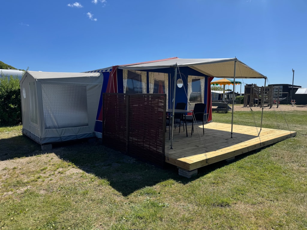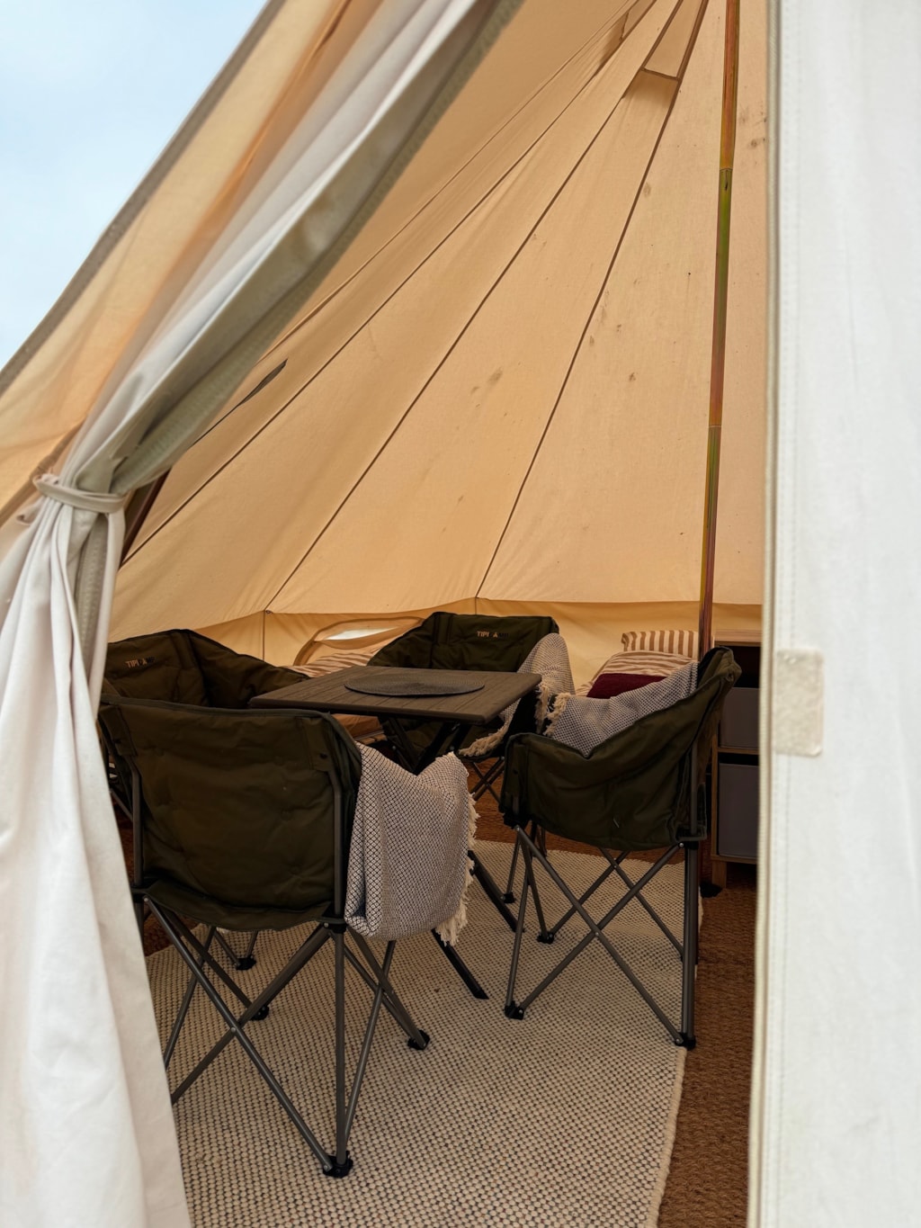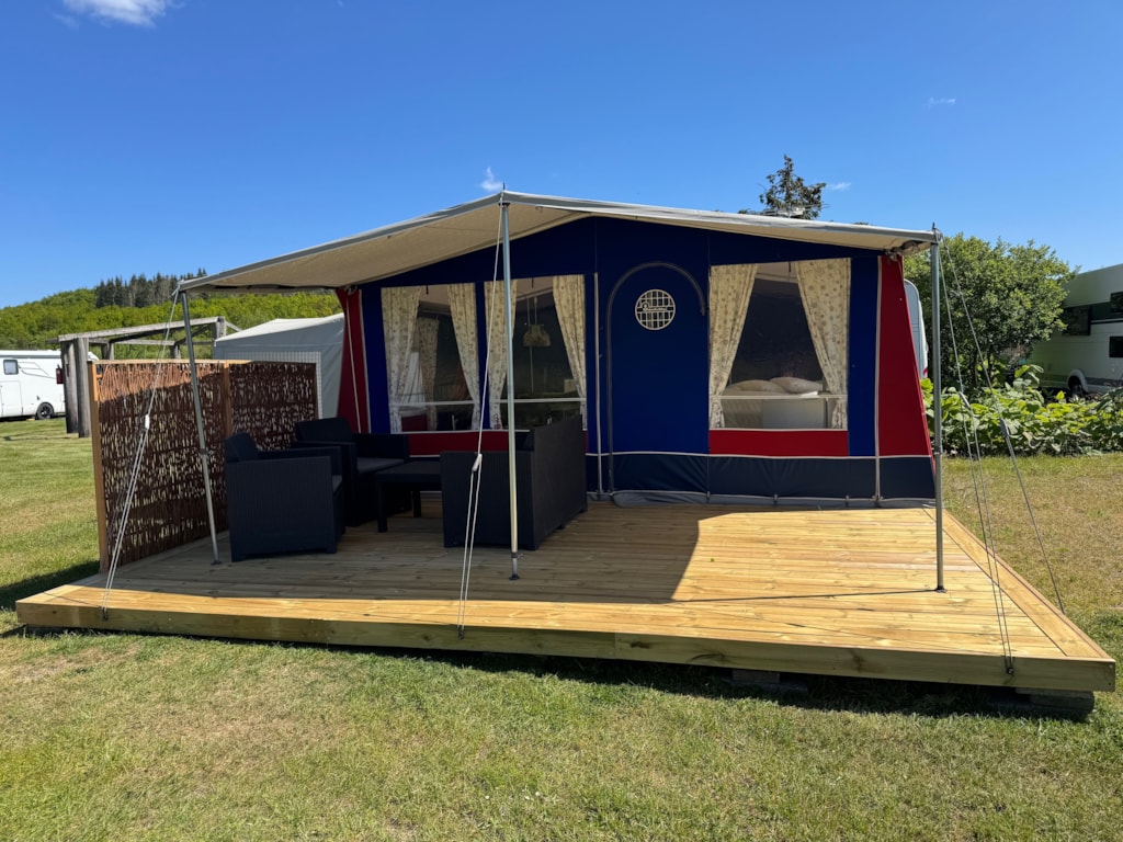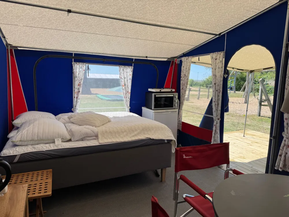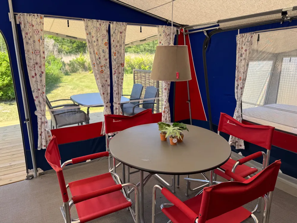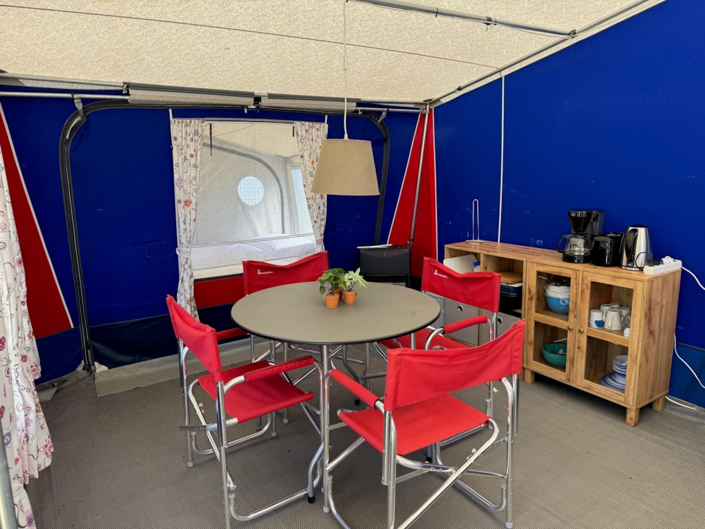 Im Vorzelt finden Sie Möbel sowie einen Weber-Holzkohlegrill. Der Wohnwagen hat außerdem einen festen Boden für zusätzlichen Komfort.