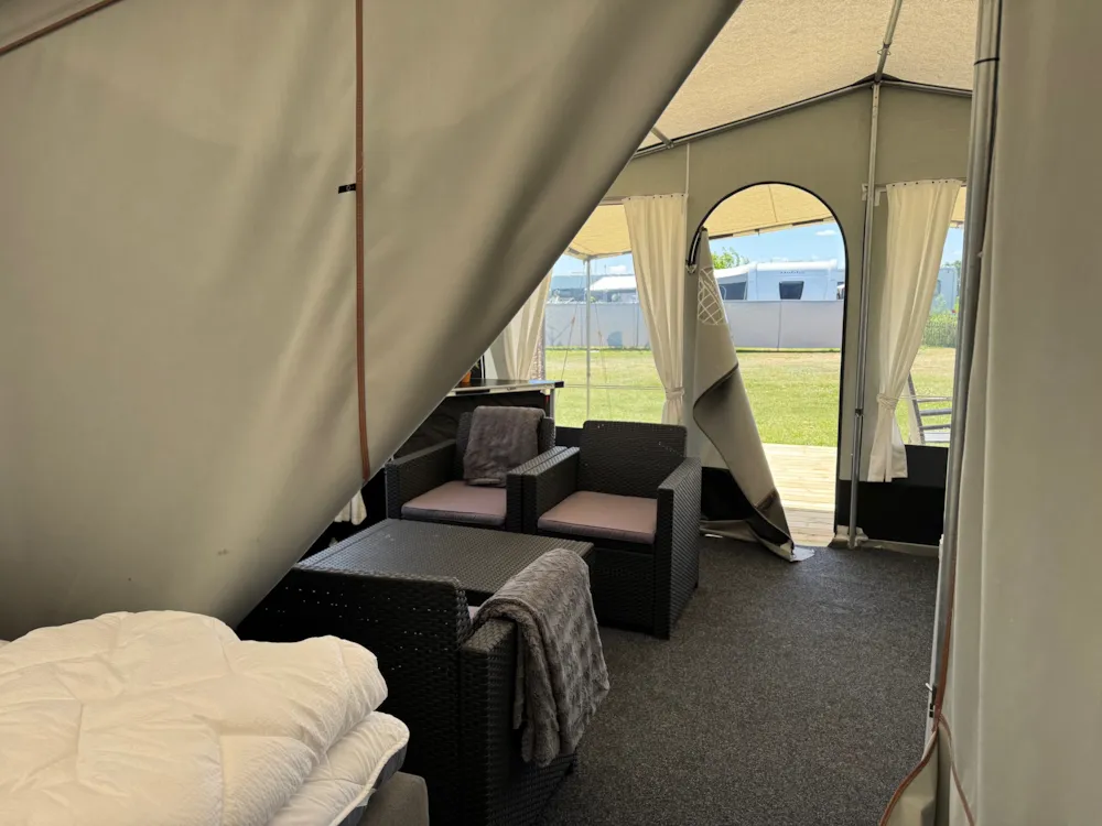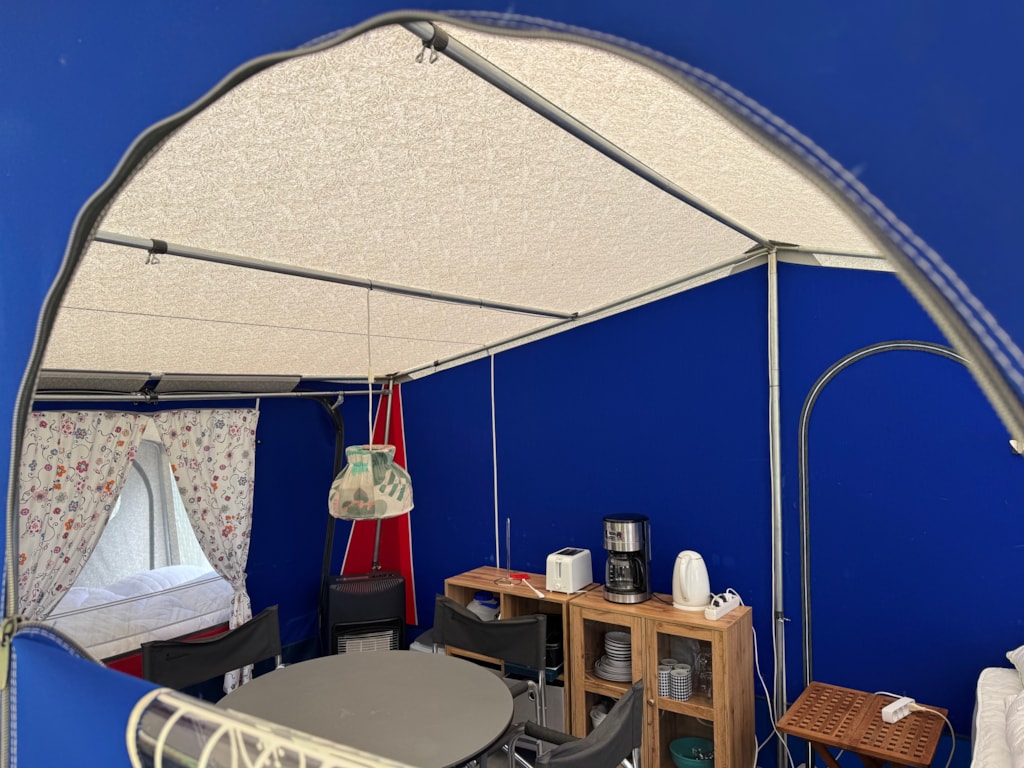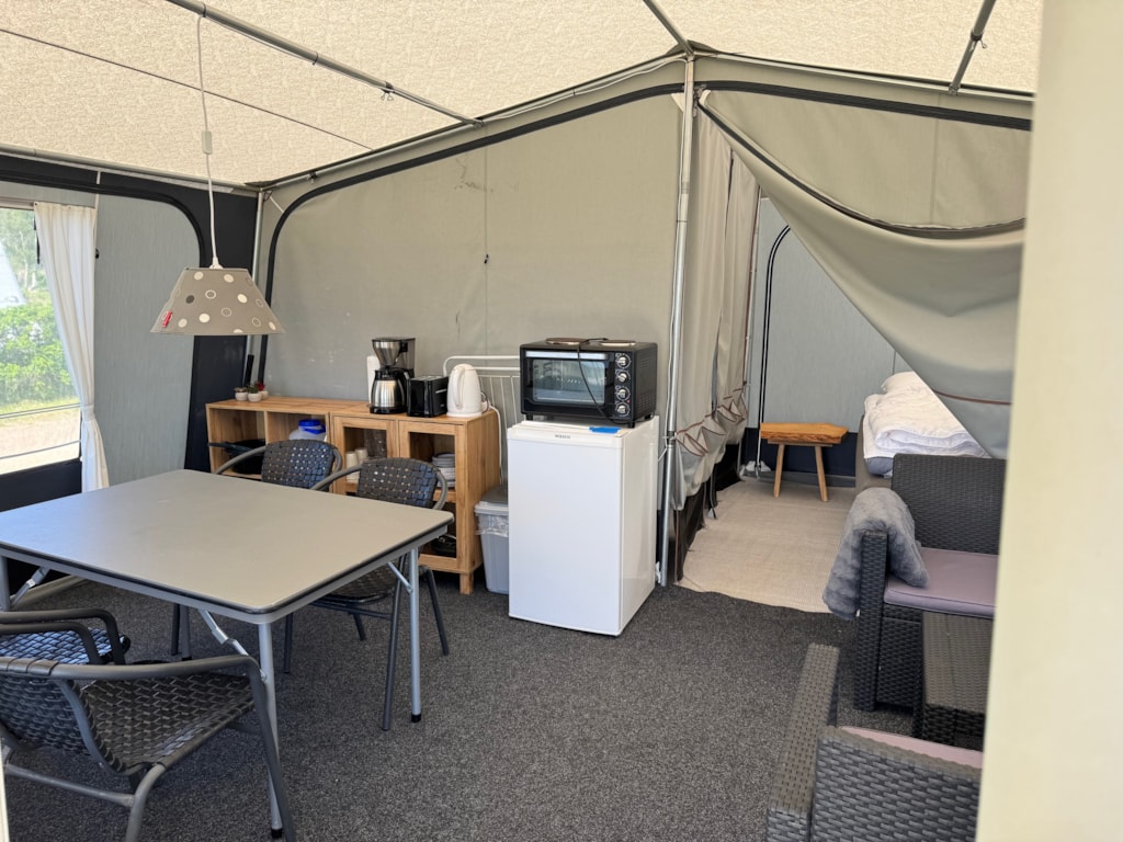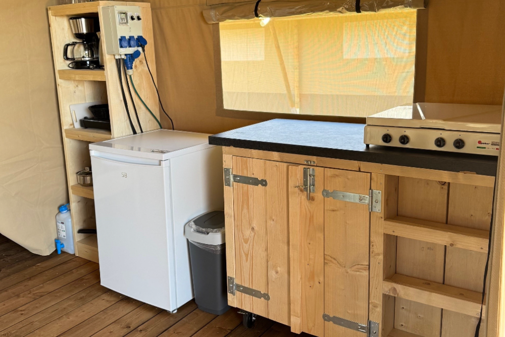 Unser Familienzelt ist die perfekte Basis für einen gemütlichen Urlaub in der Natur. Das Zelt ist ausgestattet mit Küchenutensilien wie Kaffeemaschine, Toaster und Wasserkocher, Kühlschrank mit Gefrierfach, Kochplatten, Minibackofen sowie Geschirr, Töpfen und Besteck. Eine Essecke im Zelt lädt zu gemeinsamen Mahlzeiten ein.