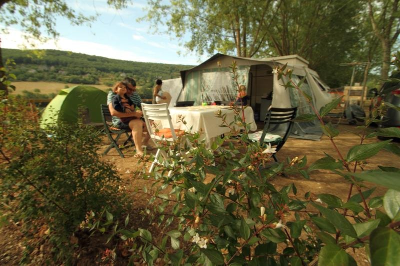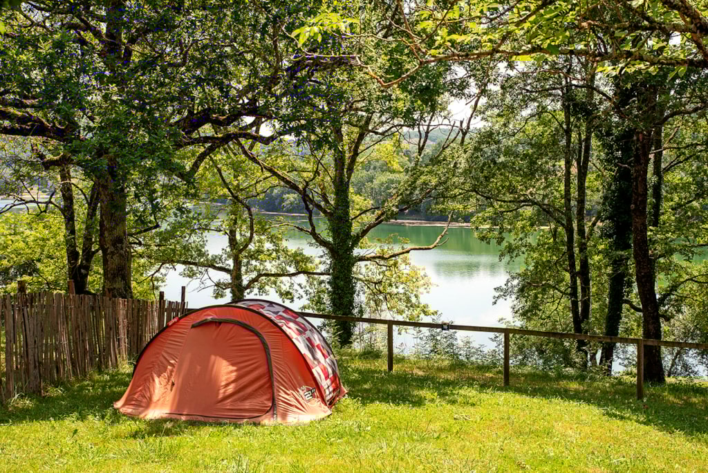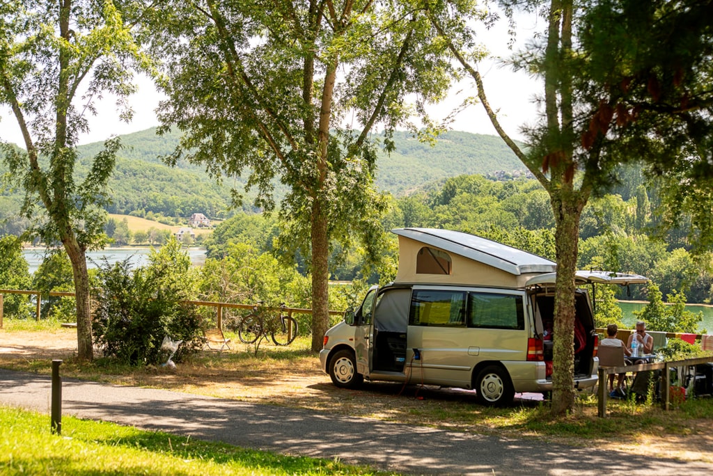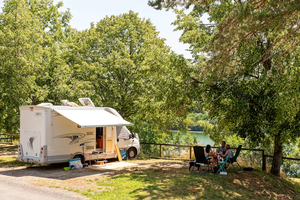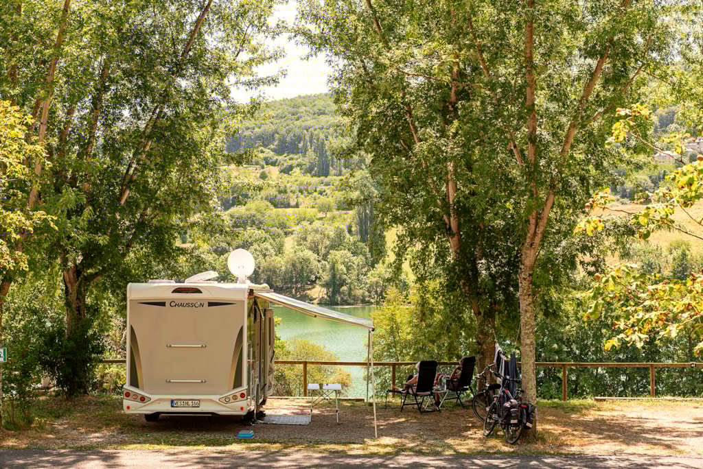 Emplacements de 80 m², sur sol dur, stabilisés, orientés face au Lac du Causse. Electricité 16 ampères (adaptateur non fourni). (Déconseillé pour les tentes !)