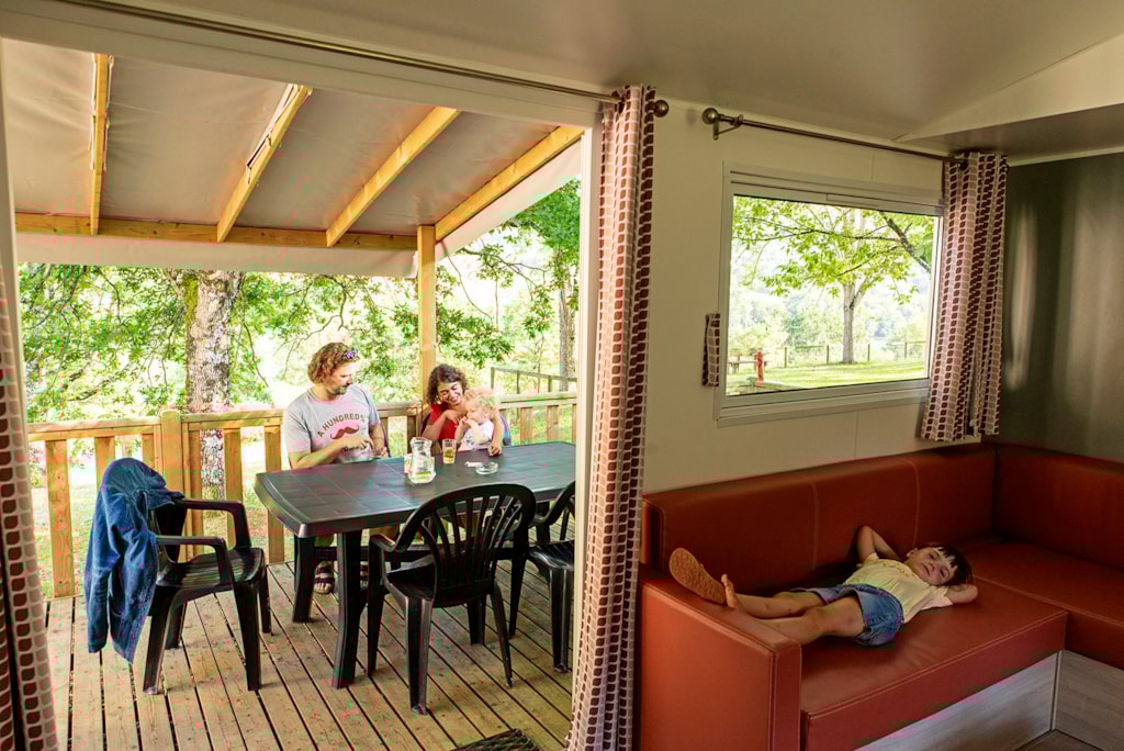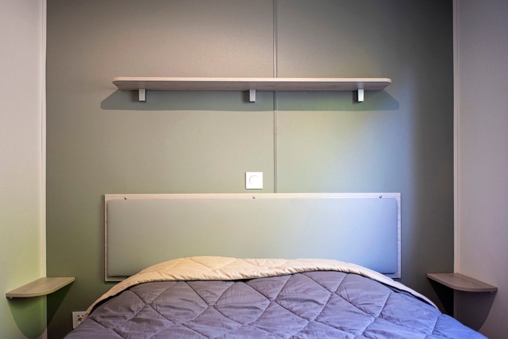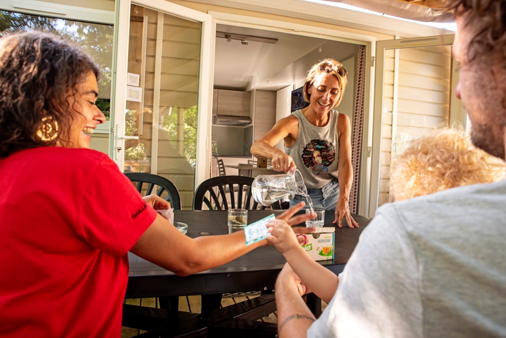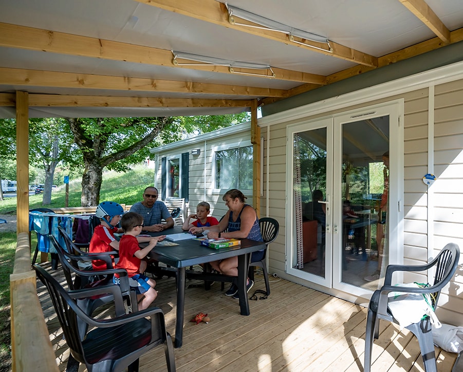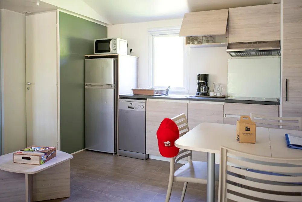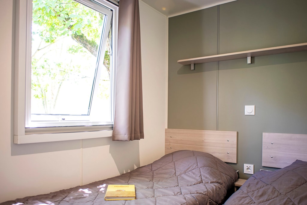 35 m² environ + terrasse semi- couverte 6m², 1 salle de bain avec douche et lavabo, 1 WC séparé, 1 chambre avec 1 lit double (140*190 cm), 2 chambres avec 2 lits simples (80*190cm), 1 canapé convertible 2 places (140*190 cm). Terrasse semi - couverte avec mobilier Equipement commun des Mobil-homes : 1 Plaque de cuisson électrique 2 feux, 1 Réfrigérateur avec congélateur ,1 lave-vaisselle, 1 Cafetière à filtre, 1 Micro-ondes, 1 Téléviseur 36 cm avec télécommande,