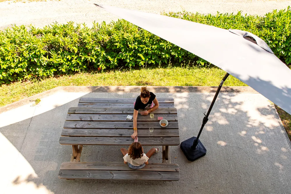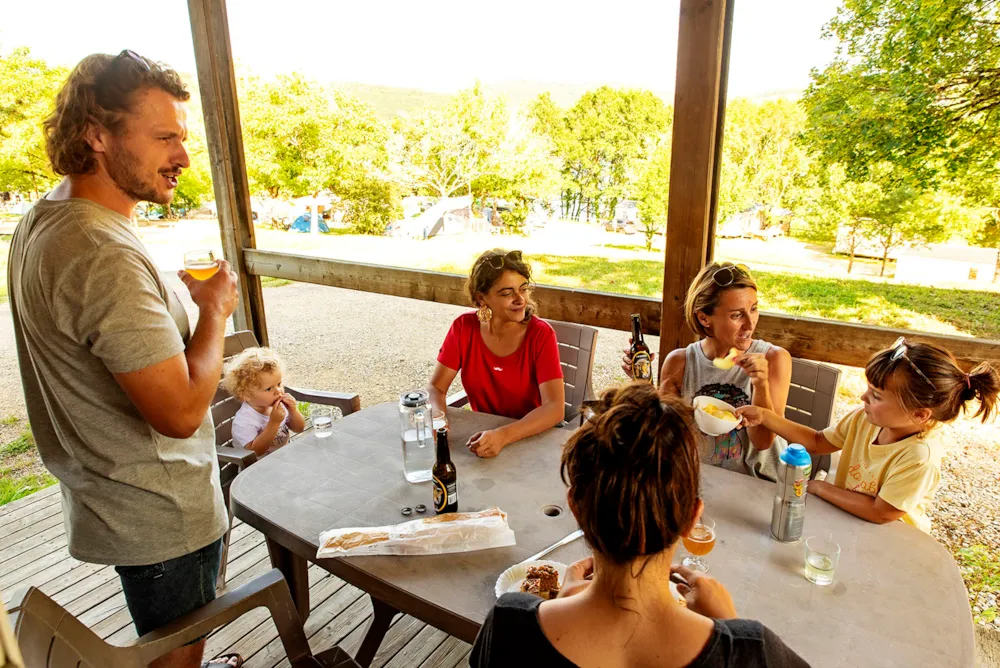 Vaisselle disponible pour 4 personnes + planche et plaque de cuisson électrique + table de pique nique couverte.