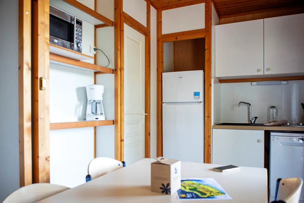 A home for your holiday - 32 m², 1 bathroom, 1 room with 1 double bed(140*190 cm) and 1 simple bed (100*190cm), 1 room with 2 simple beds (80*190cm), 1 living room / kitchenette with 1 sofa bed 2 places (140*190 cm), 1 terrace with outdoor furniture Common equipment of the cottages : 1 electric banking sheet 2 fires, 1refrigerator-freezer 150l+ 47l , 1 coffee pot, 1 microwave, 1 dishwasher, 1 washing machine , 1 television set 36 cm with remote control.