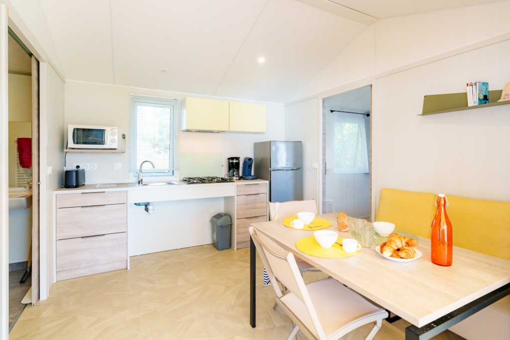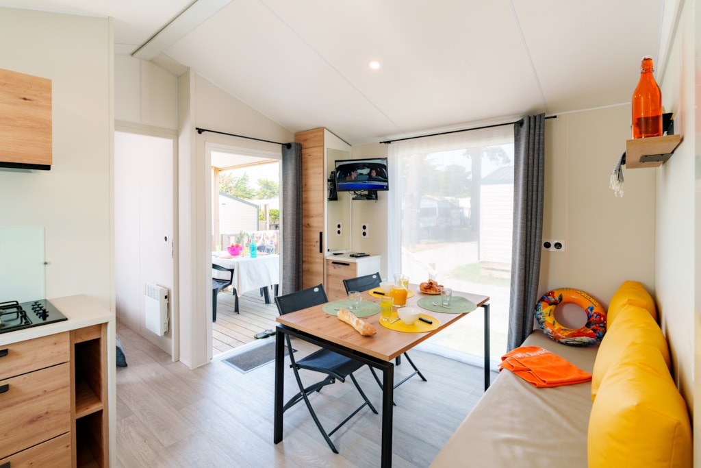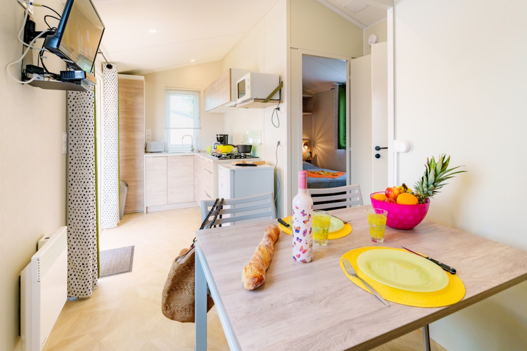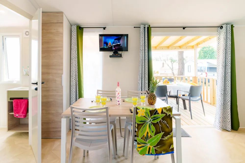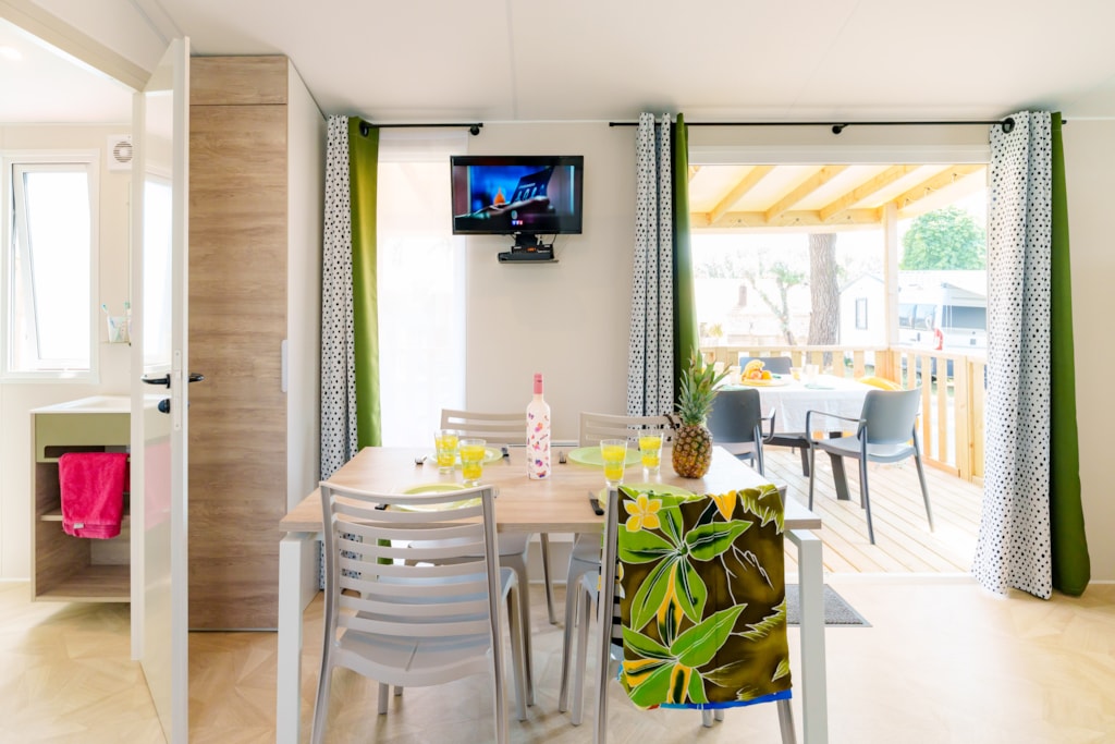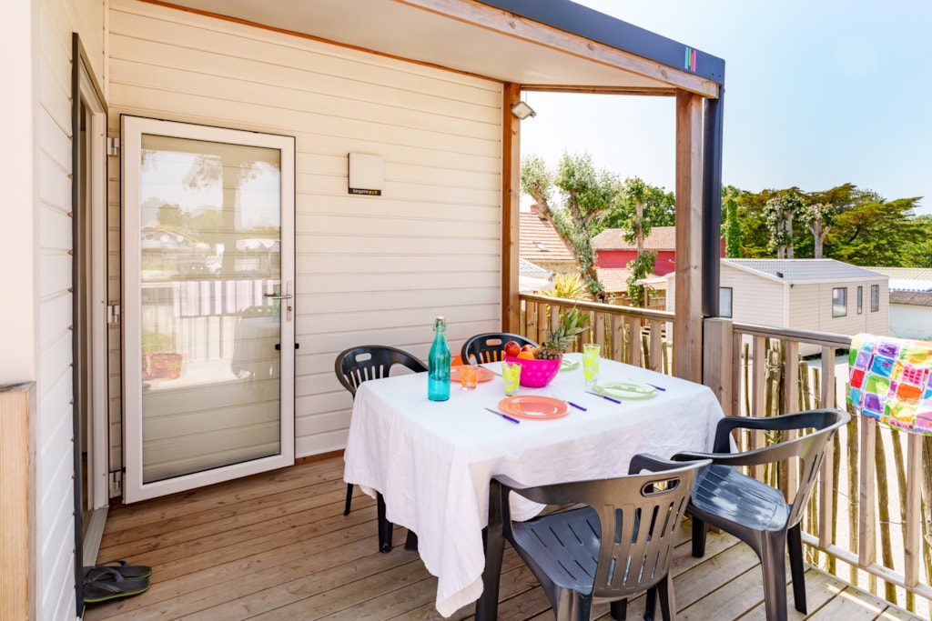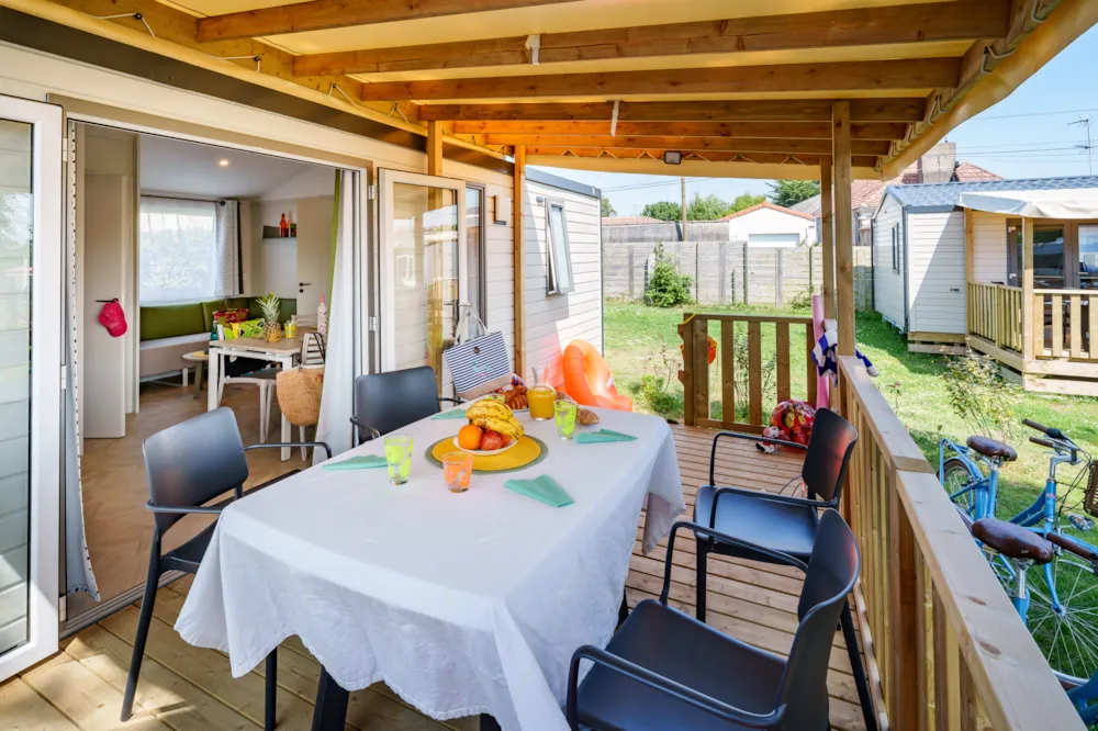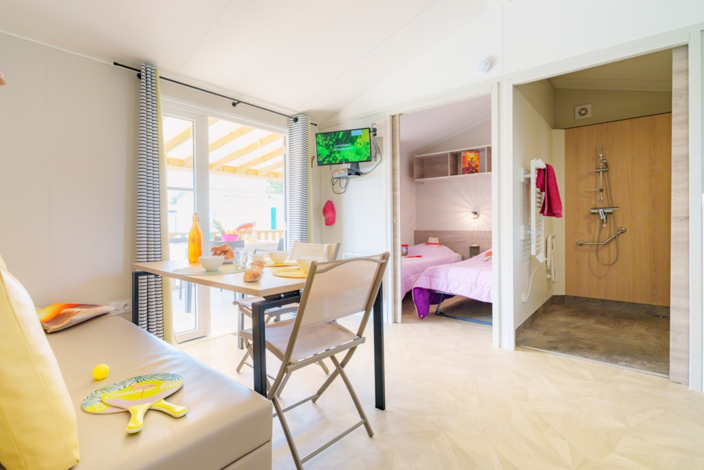 Mobilheim Quiétude Premium 35m² mit überdachter Terrasse, Heizung, Fernseher, Geschirrspüler, Liegestühlen und kostenlosem WLAN
