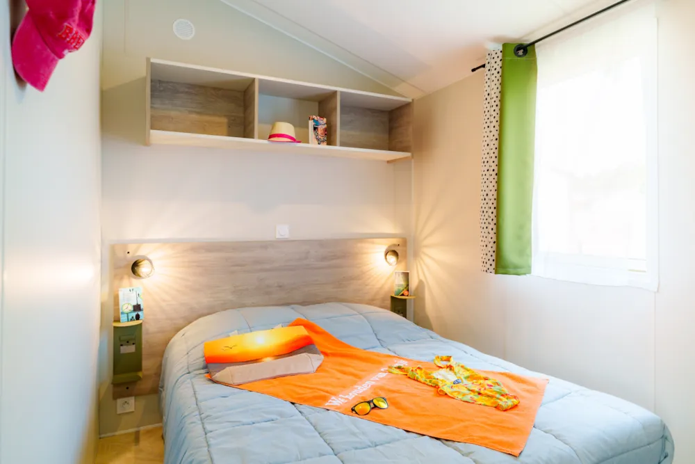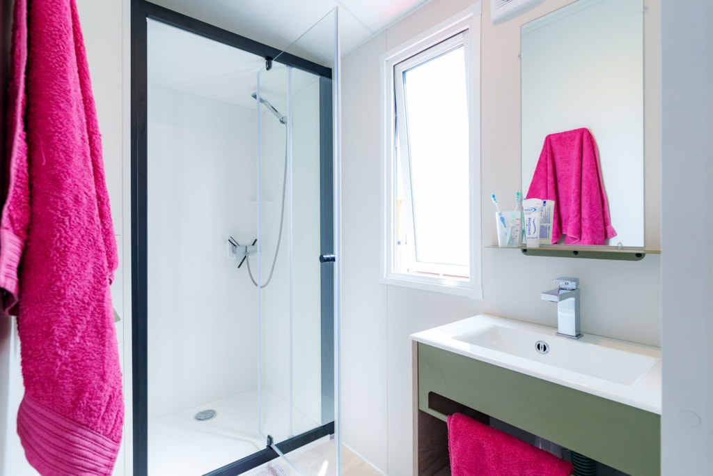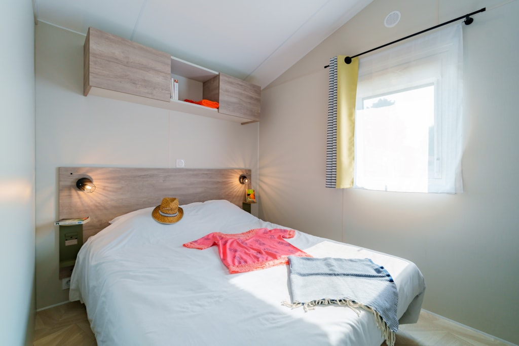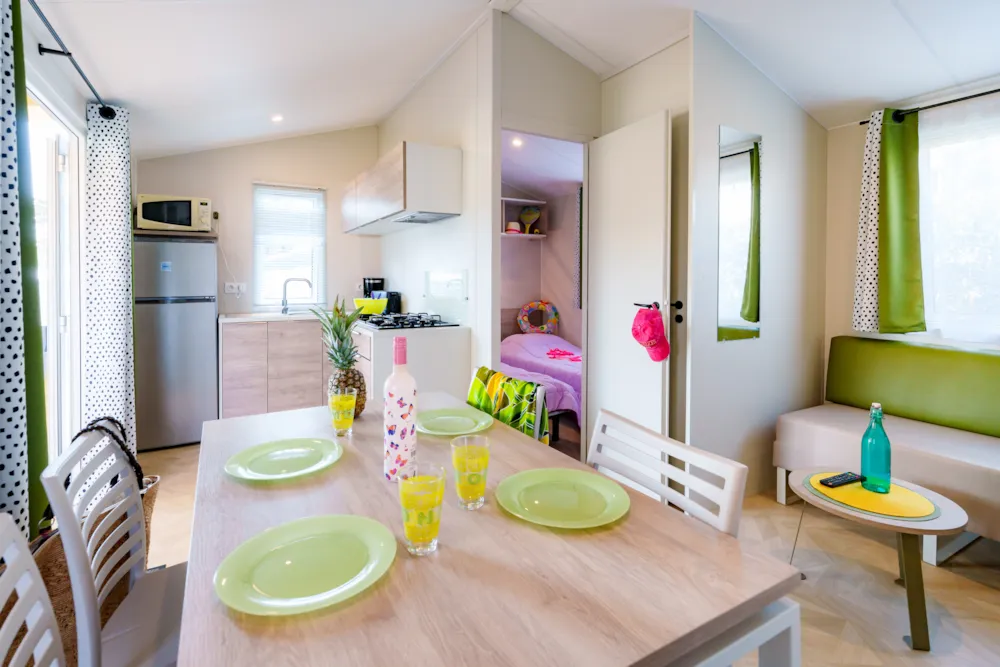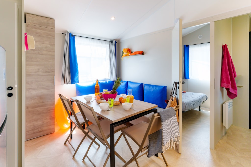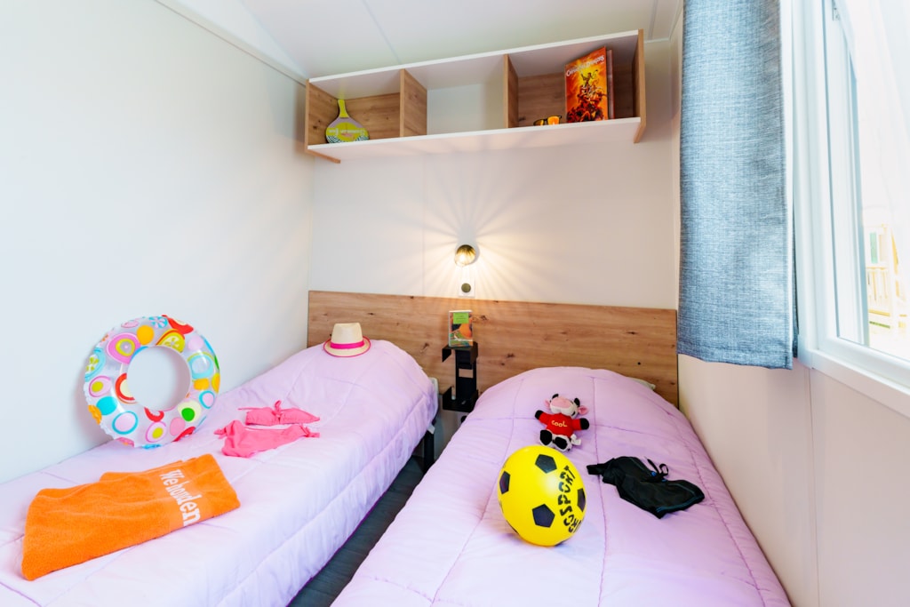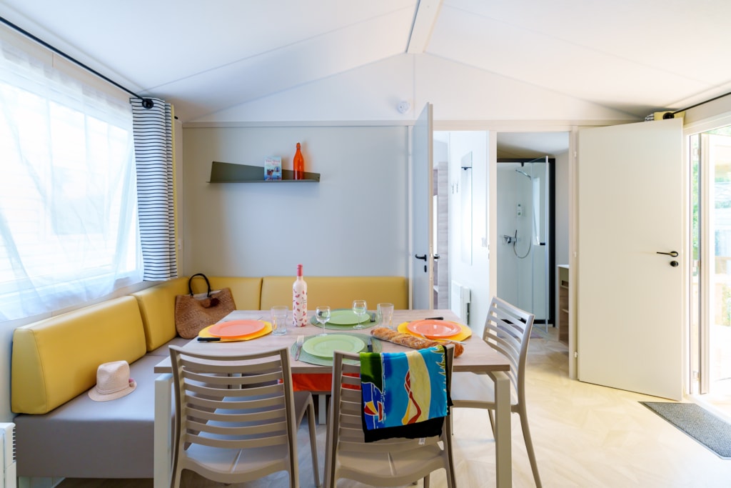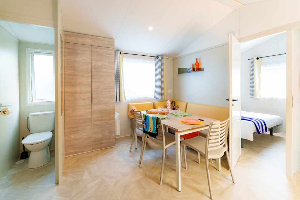 Mobilheim Quiétude Premium 35m² mit überdachter Terrasse, Heizung, Fernseher, Geschirrspüler, Liegestühlen und kostenlosem WLAN