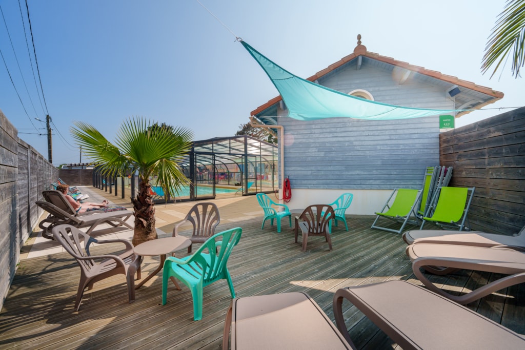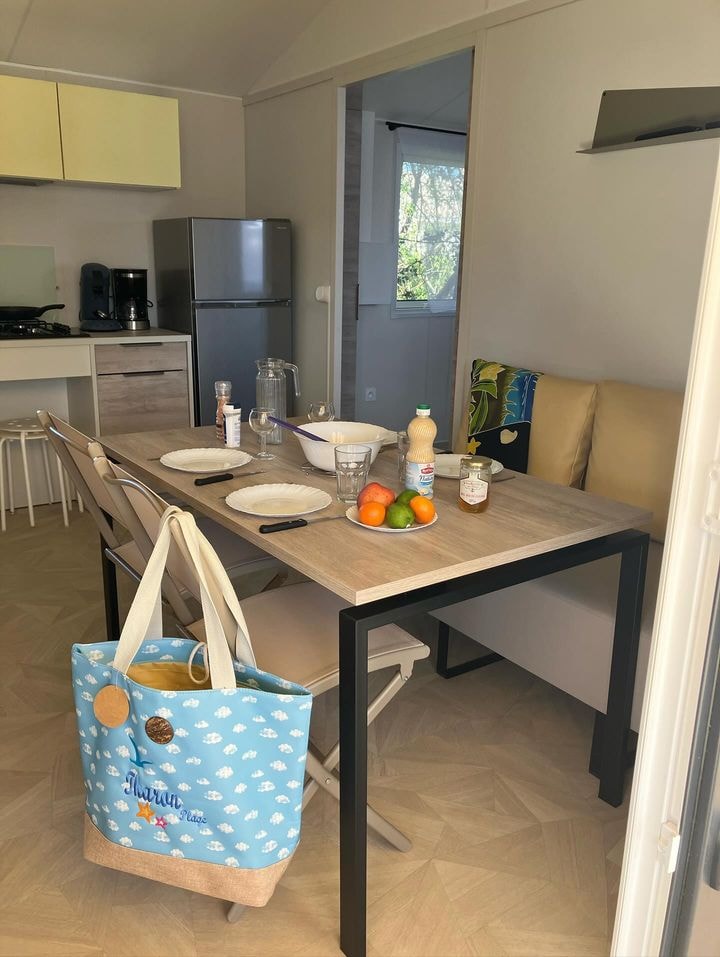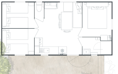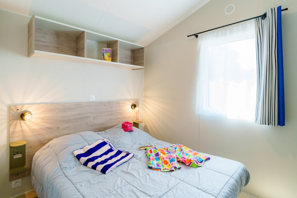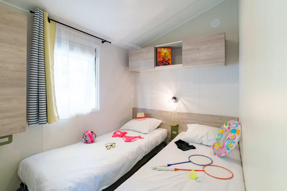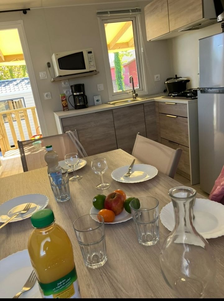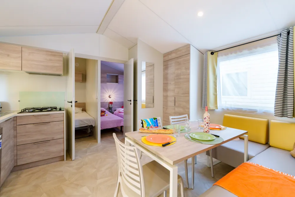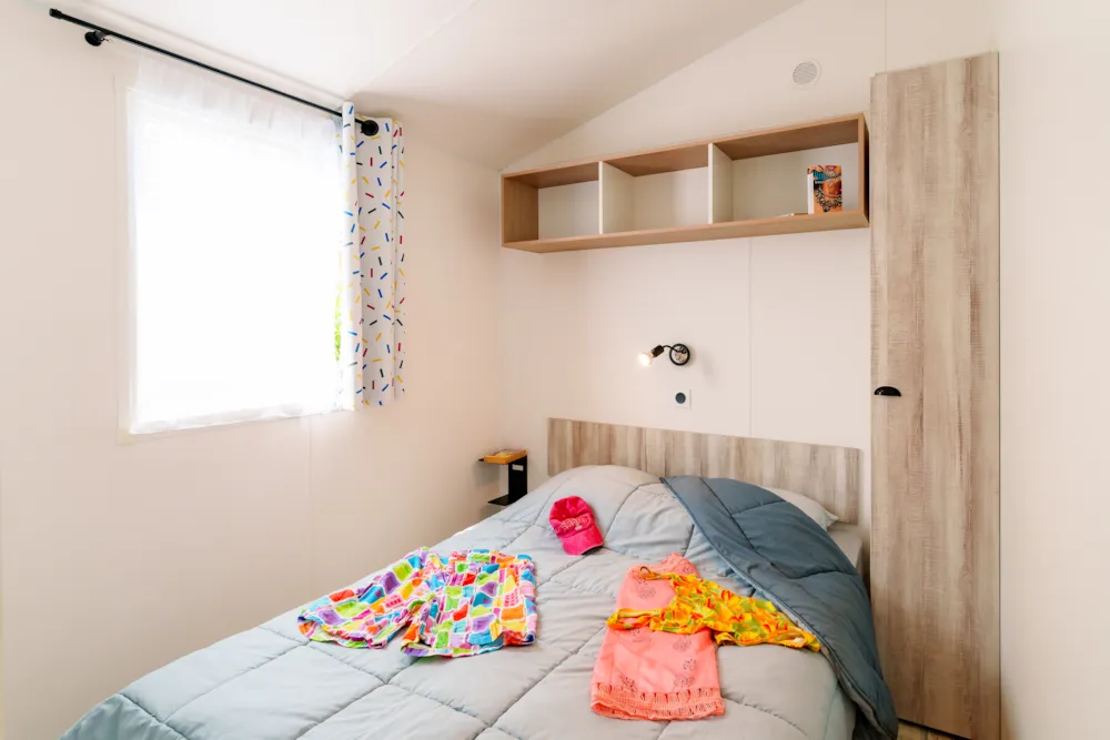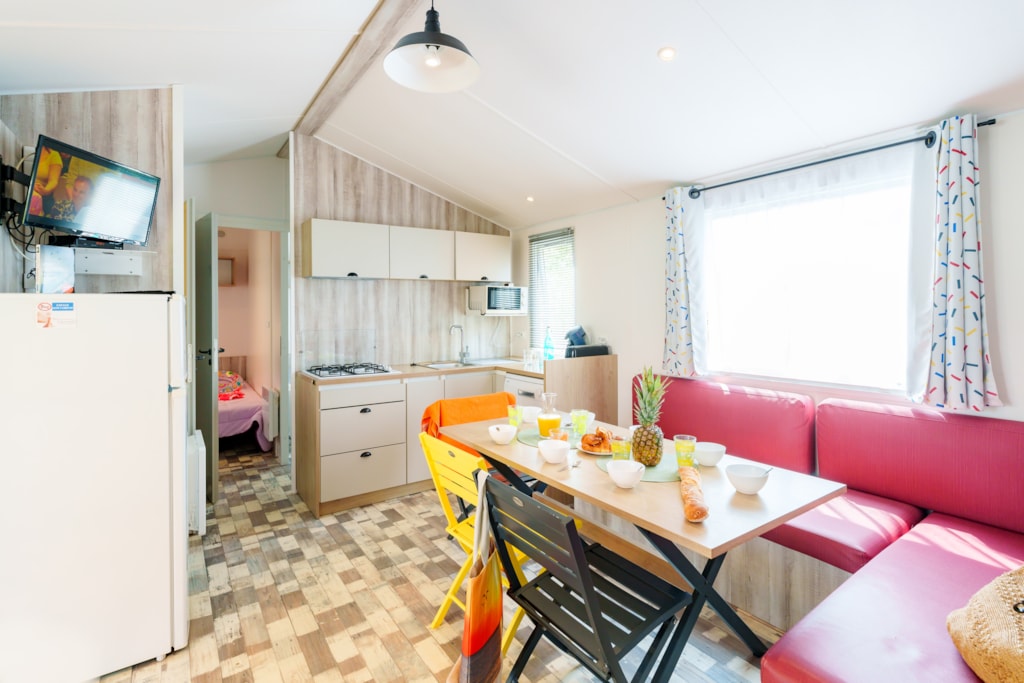Mobilheim Quiétude Premium 35m² mit überdachter Terrasse, Heizung, Fernseher, Geschirrspüler, Liegestühlen und kostenlosem WLAN