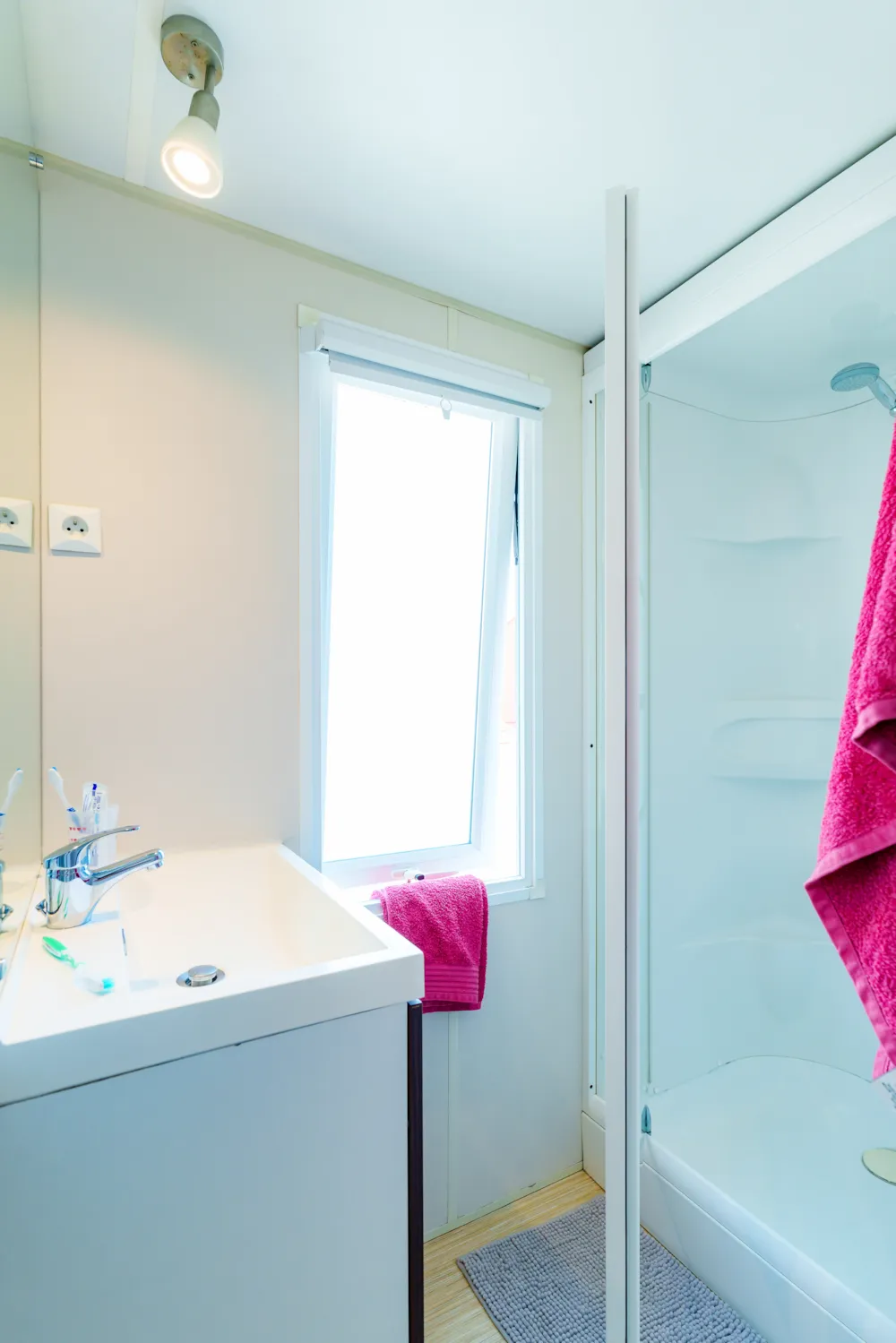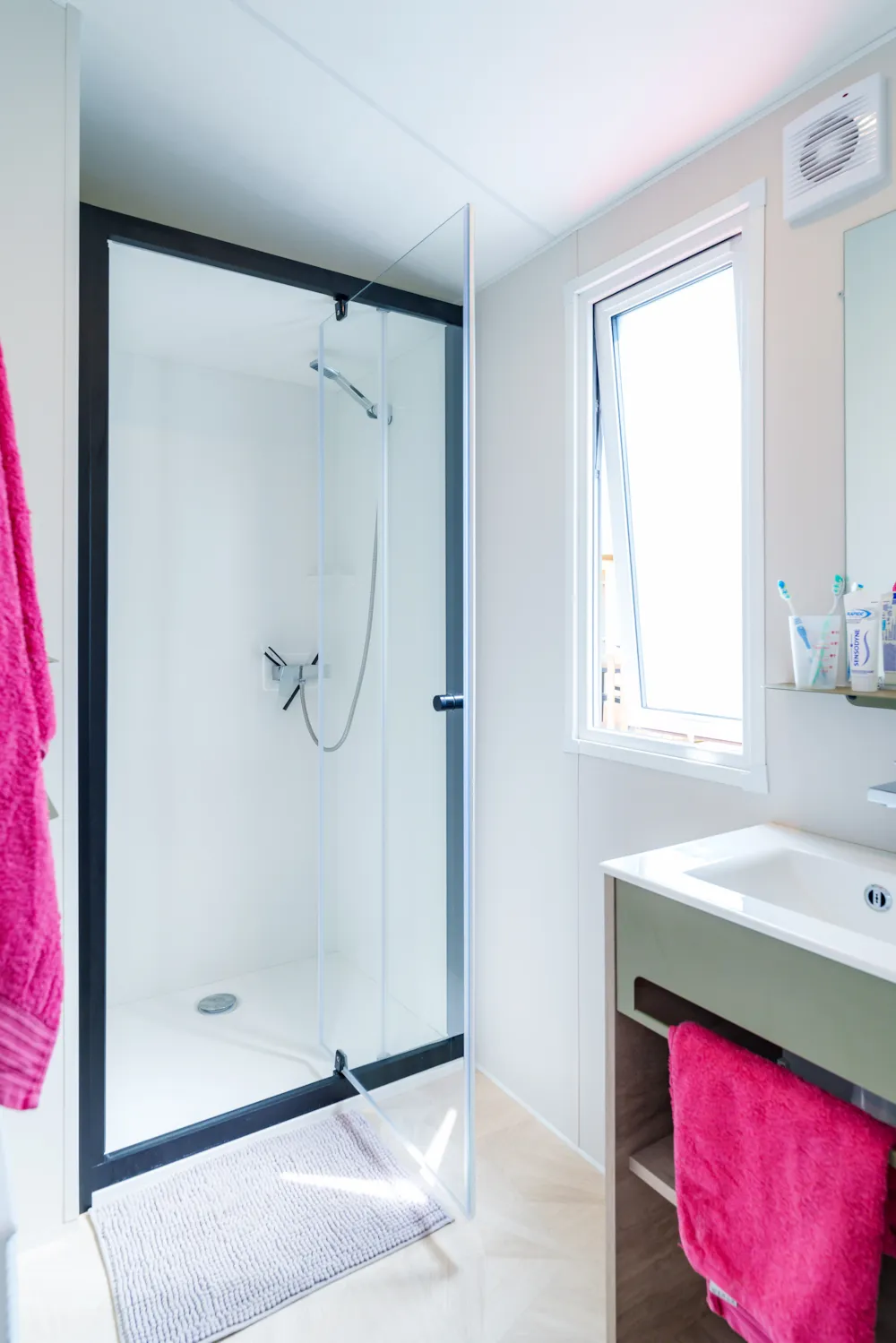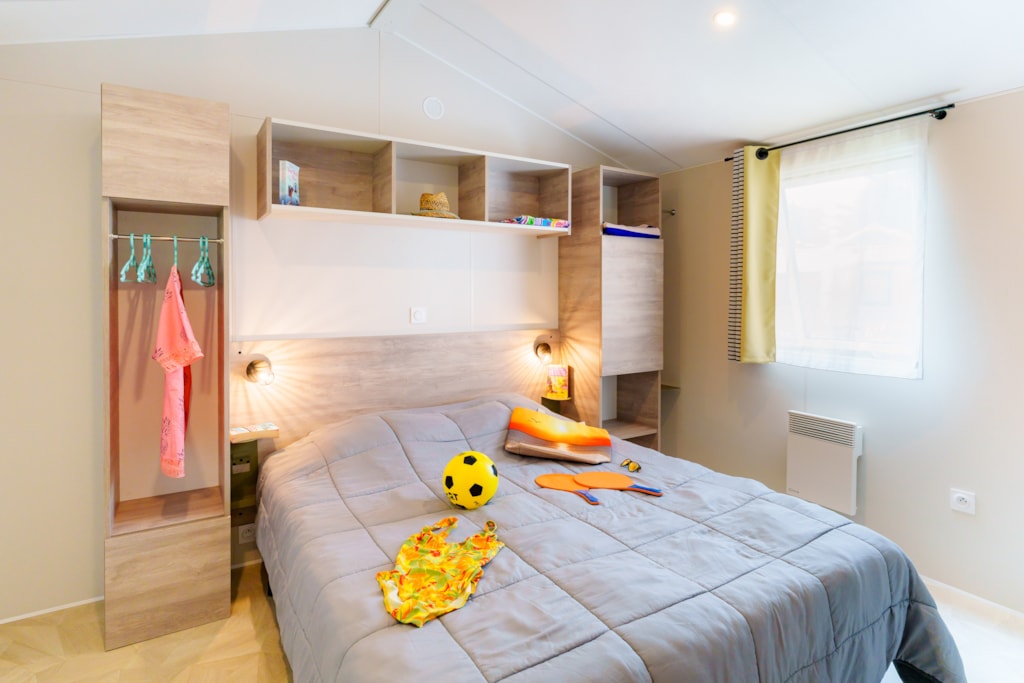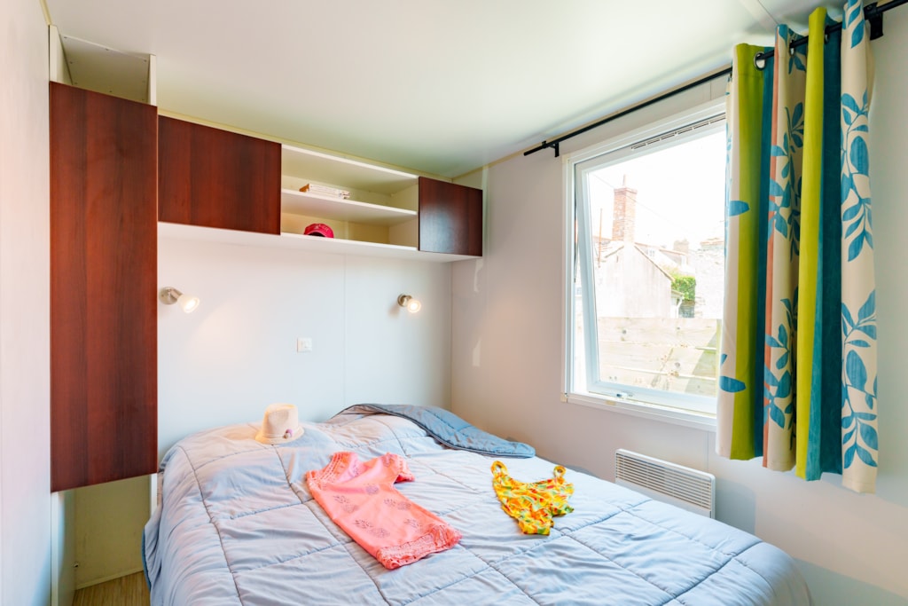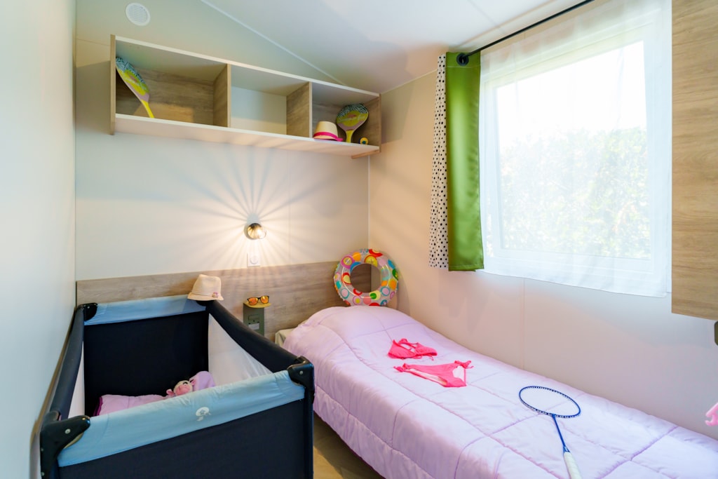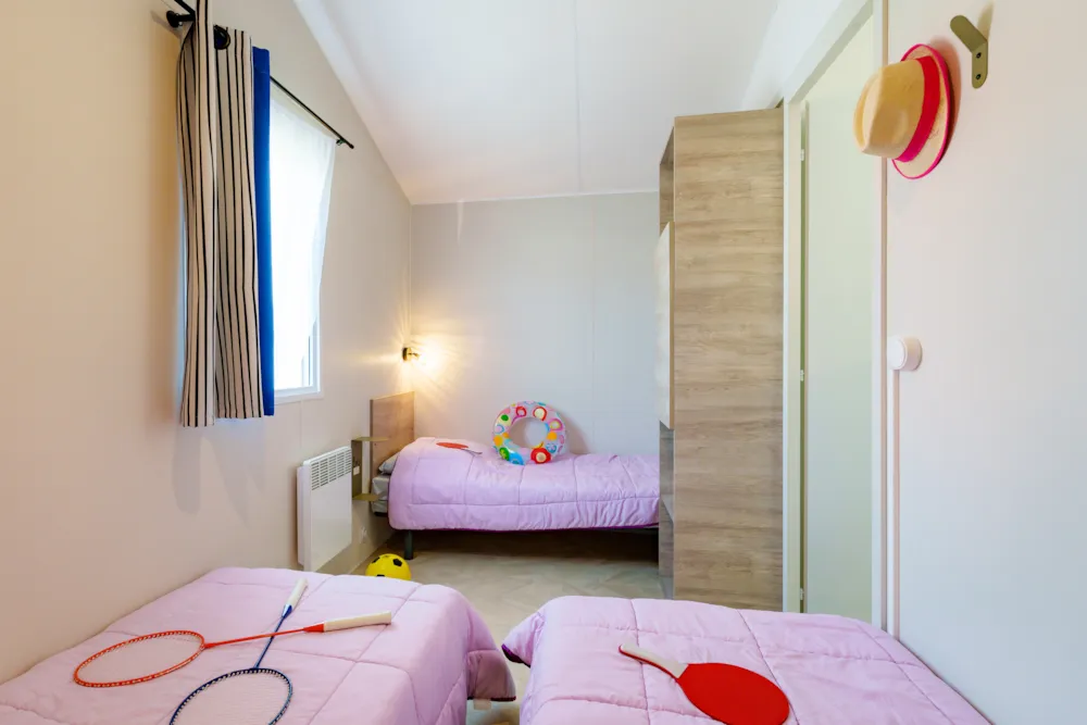 Mobilheim Quiétude Premium 35m² mit überdachter Terrasse, Heizung, Fernseher, Geschirrspüler, Liegestühlen und kostenlosem WLAN