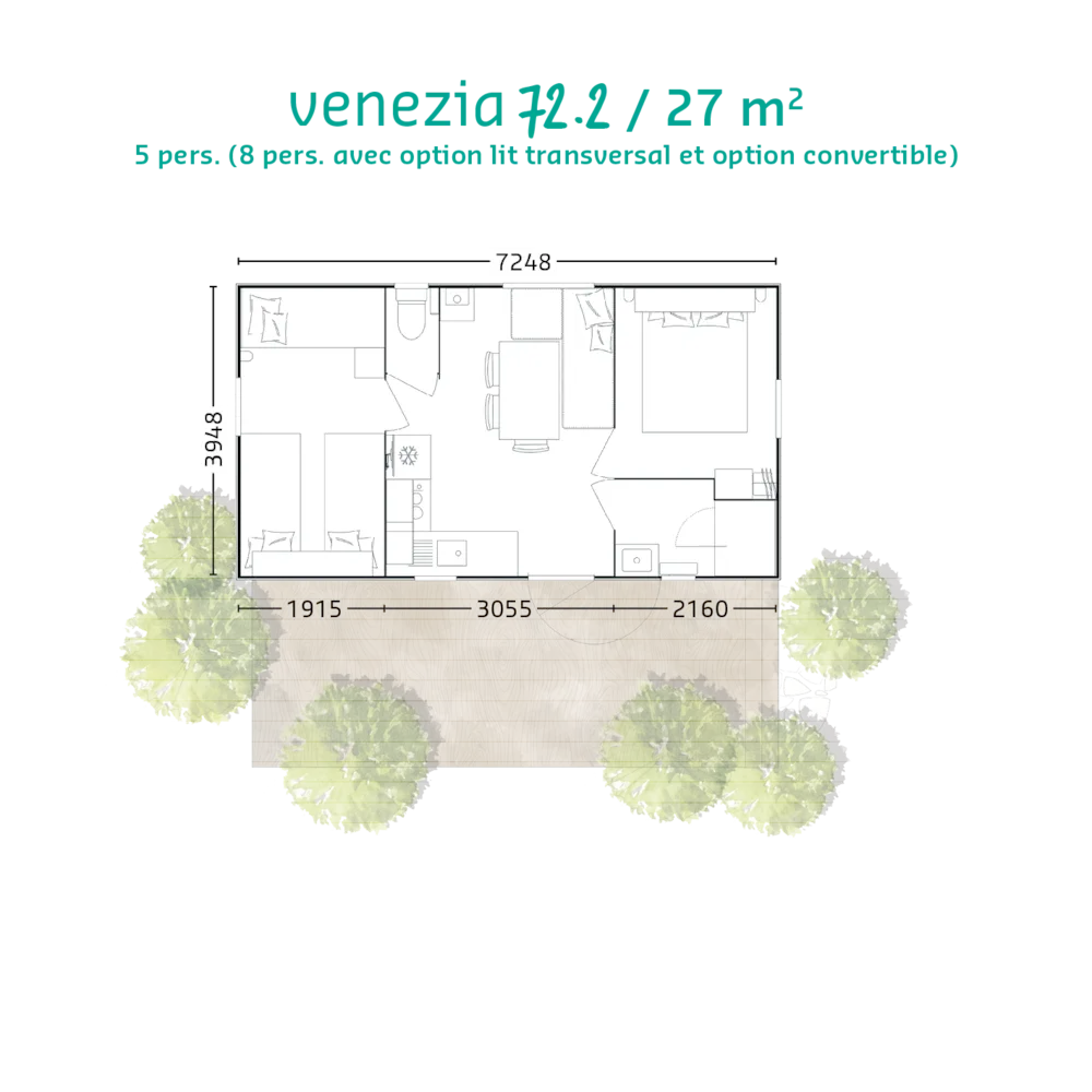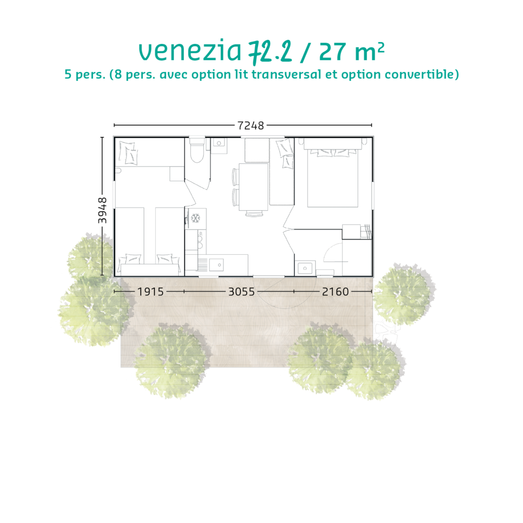 Mobilheim Detente Premium 36m² mit überdachter Terrasse, Heizung, Fernseher, Geschirrspüler, Liegestühlen und kostenlosem WLAN