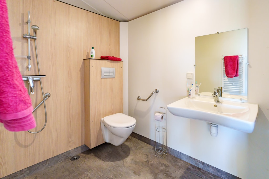 Mobilheim mit 2 Schlafzimmern, für Personen mit eingeschränkter Mobilität geeignet. Überdachte Terrasse, Fernseher, Geschirrspüler und Liegestühle/Sonnenliegen.