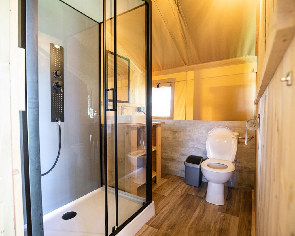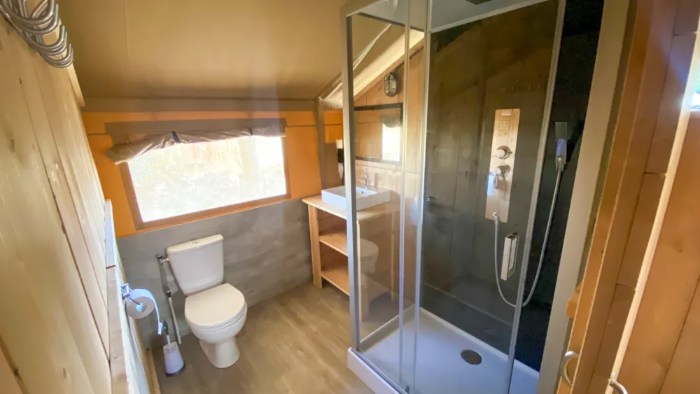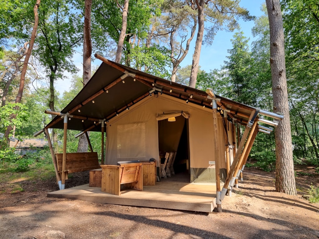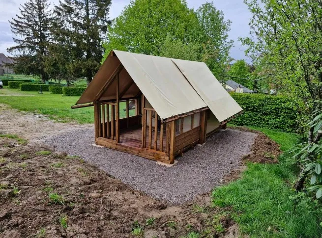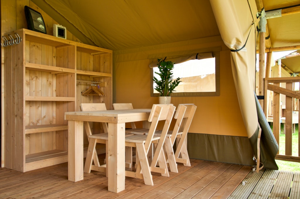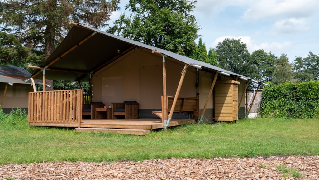 Genießen Sie die Ruhe in diesem komfortablen Safarizelt mit Blick auf die Berge und einer Gesamtfläche von 38 m².