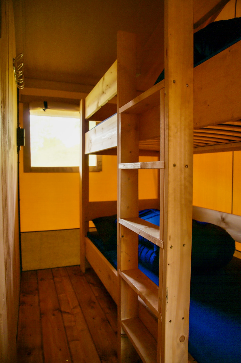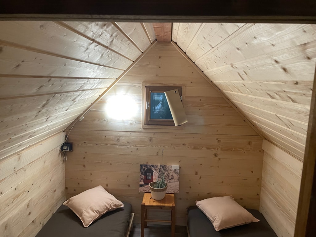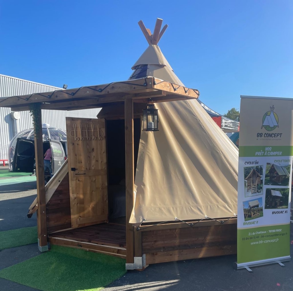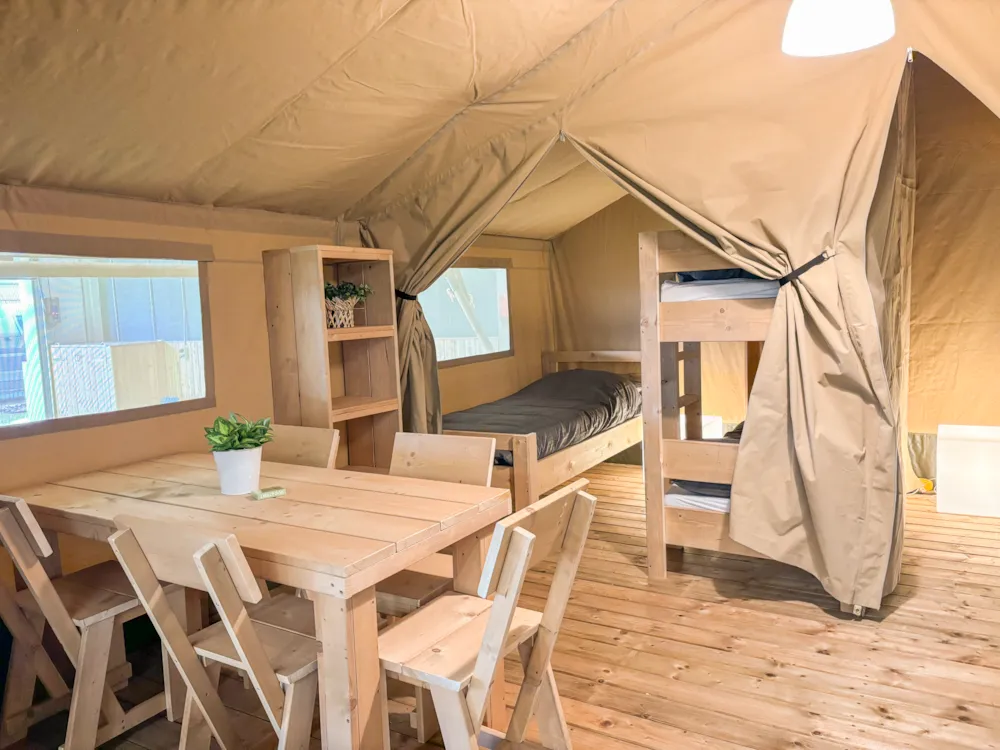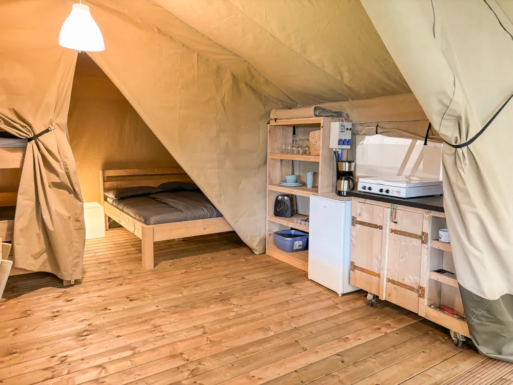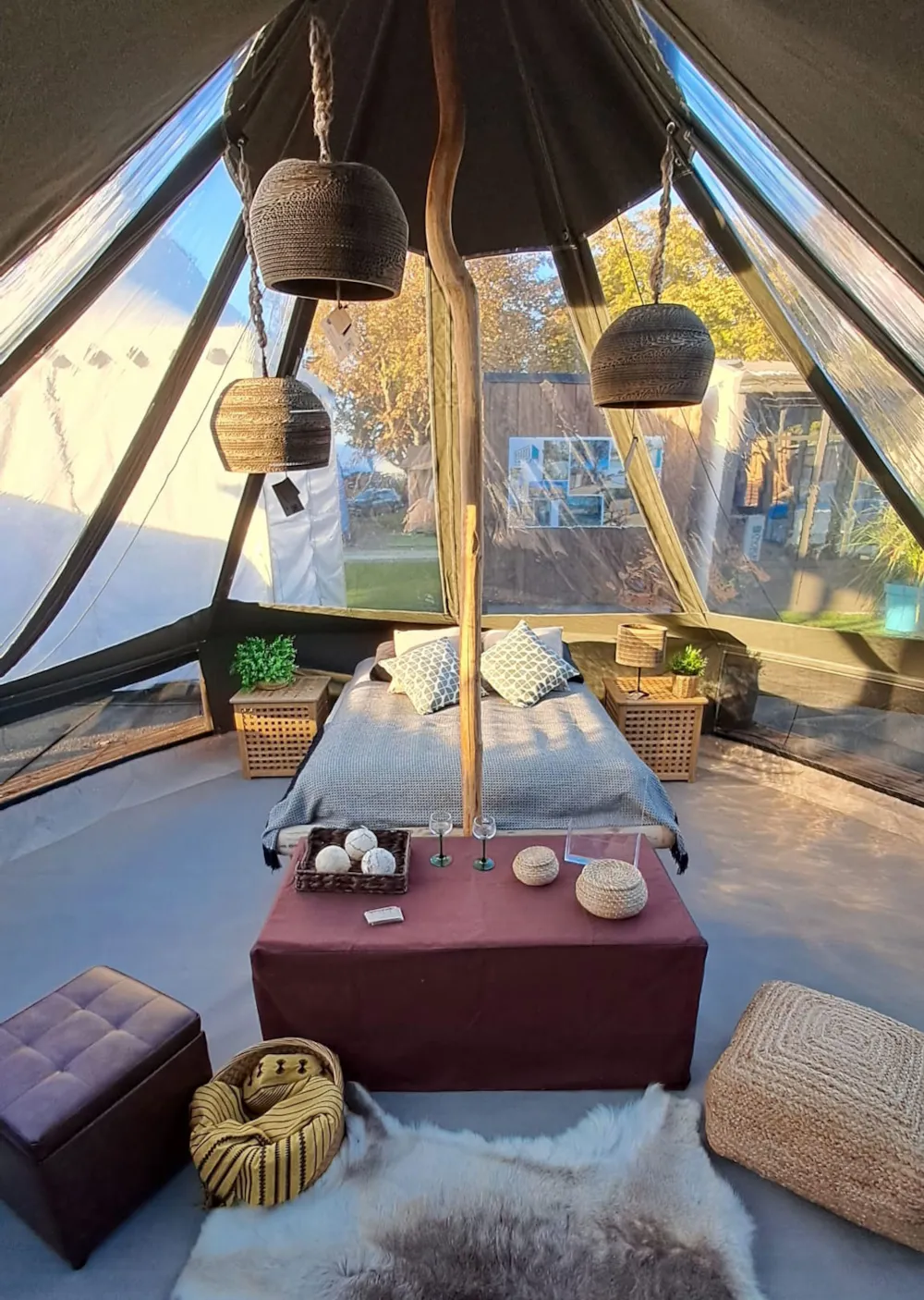 Dieses moderne Tipi aus Massivholz mit einer Fläche von 13 m² ist mit einer hochwertigen Plane und im Inneren mit Baumwollstoff ausgekleidet. Diese ungewöhnliche Unterkunft bietet Platz für bis zu 3 Personen und verfügt über ein Doppelbett (140 x 190 cm) und ein Klappbett (90 x 190 cm).