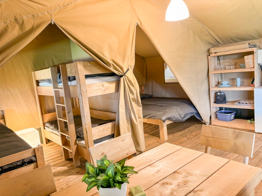 Im Inneren finden Sie ein Doppelbett (140 x 190 cm) und zwei Einzelbetten (80 x 190 cm). Die beiden Einzelbetten sind klappbar, um den Platz optimal zu nutzen. Dieses Zelt bietet somit Platz für bis zu vier Personen.