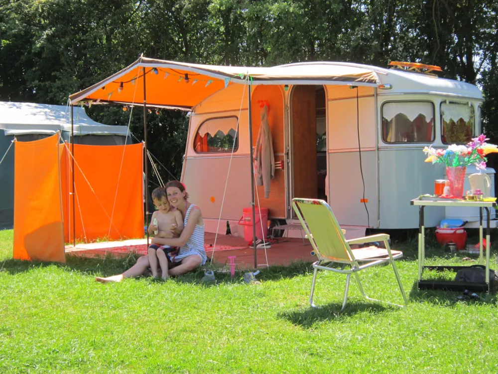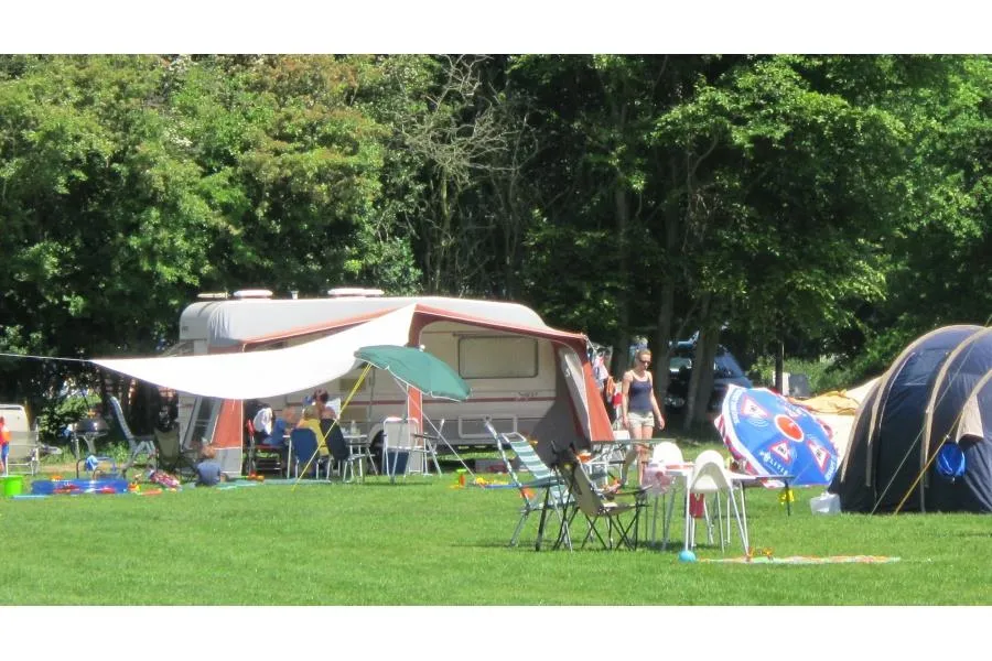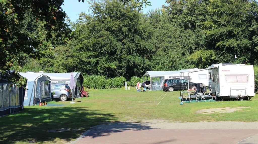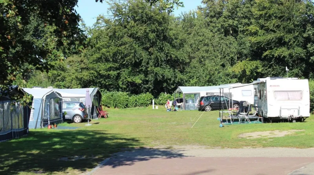 Kampeerplaats. De staanplaatsen zijn max. 80 m2 en hebben alle 16 A. elektriciteitsaansluiting. U kunt kiezen tussen plaatsen op het veld of tussen de bomen.