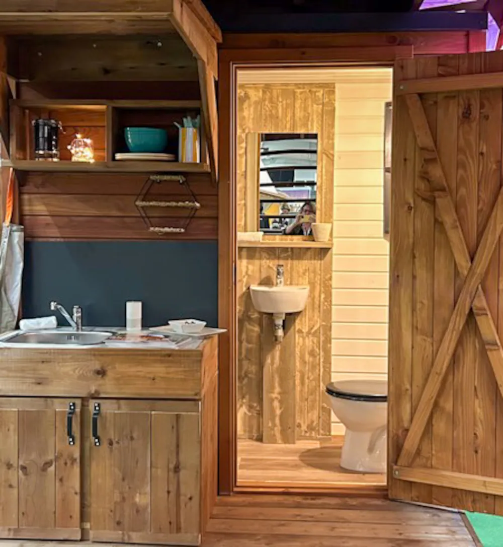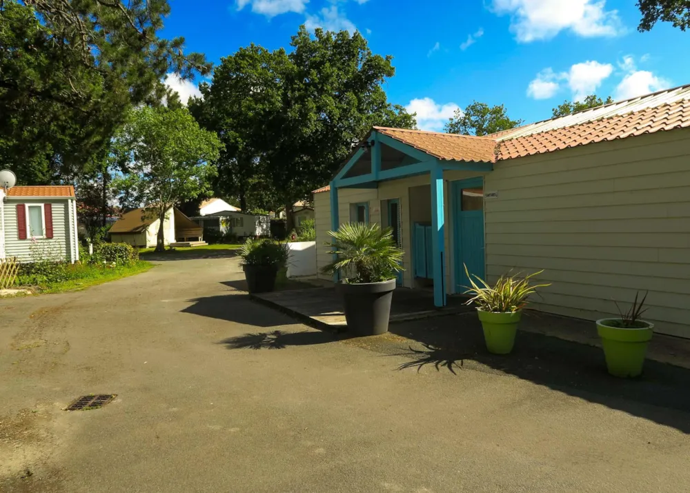 Sie profitieren von einem privaten Sanitärblock direkt auf Ihrem Stellplatz, ausgestattet mit Dusche, Waschbecken und Toilette – für optimalen Komfort, ohne die gemeinschaftlichen Anlagen nutzen zu müssen.