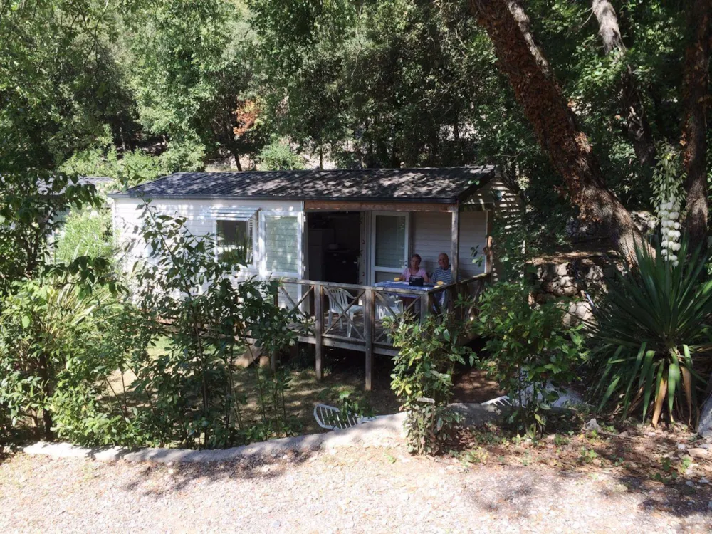Tolles Haus mit guter Ausstattung, großer Terrasse, Hängematte und Whirlpool; schattiger Platz durch viele Bäume, Kunstrasen zum Erreichen der Häuser