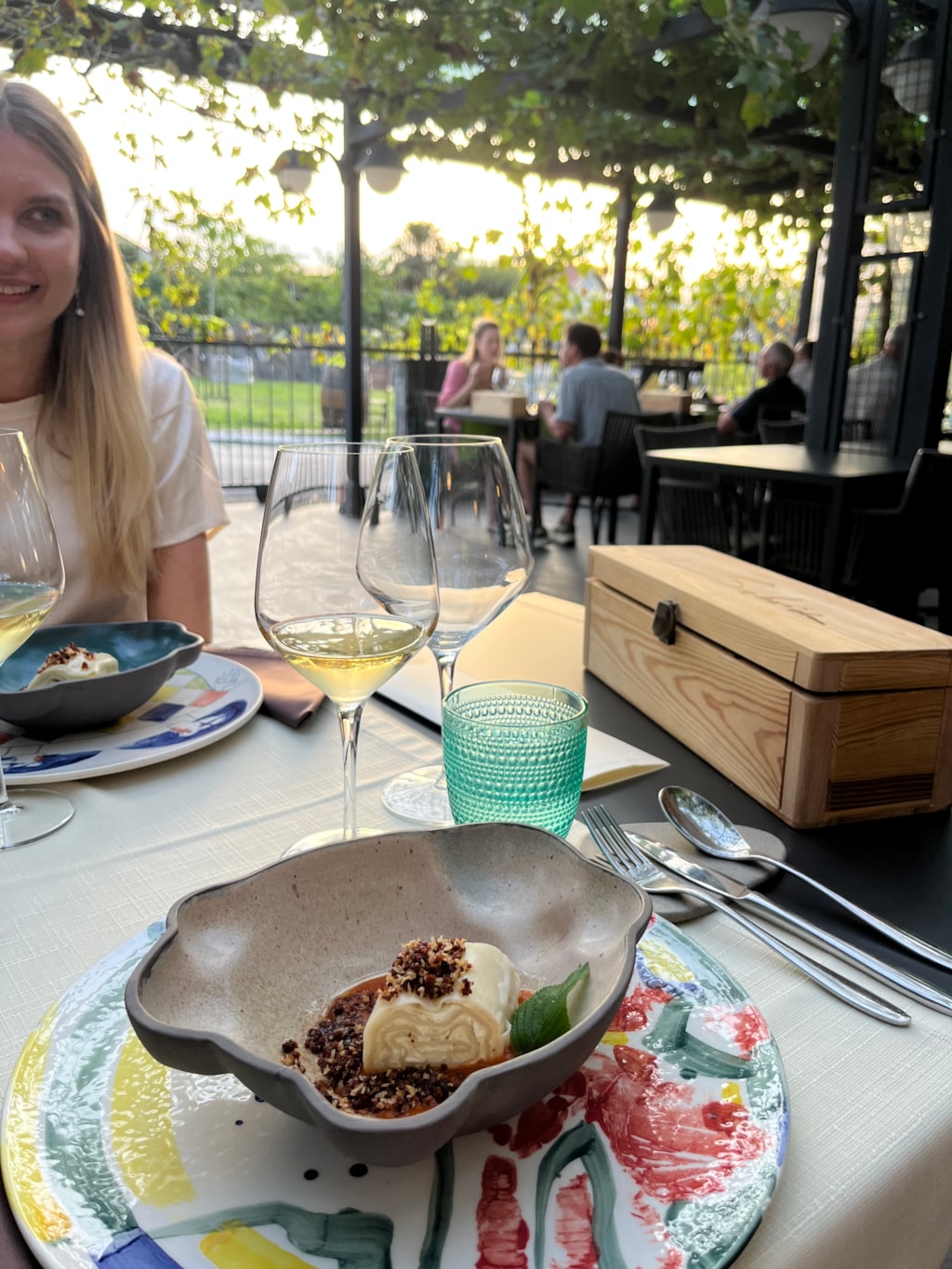 Die tolle Lage und der schön angelegte Platz in den Weinbergen. Das ausgezeichnete Menu mit Weinbegleitung
