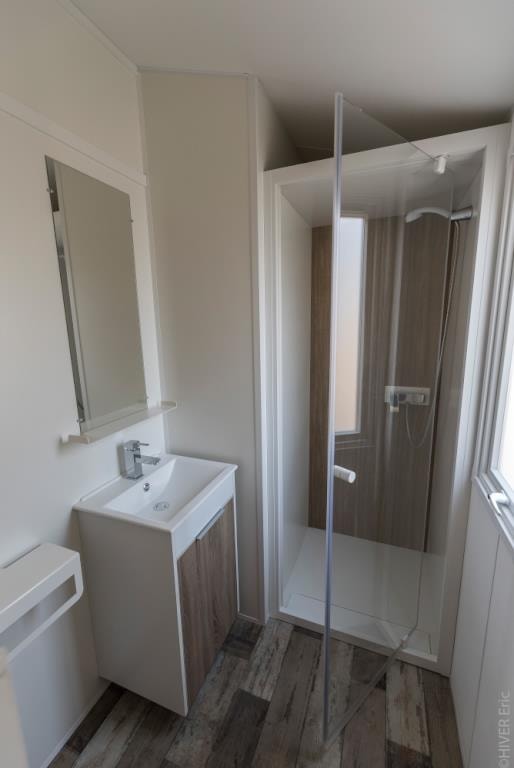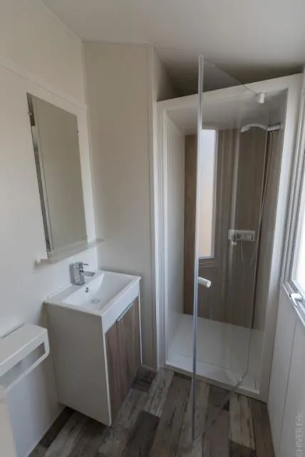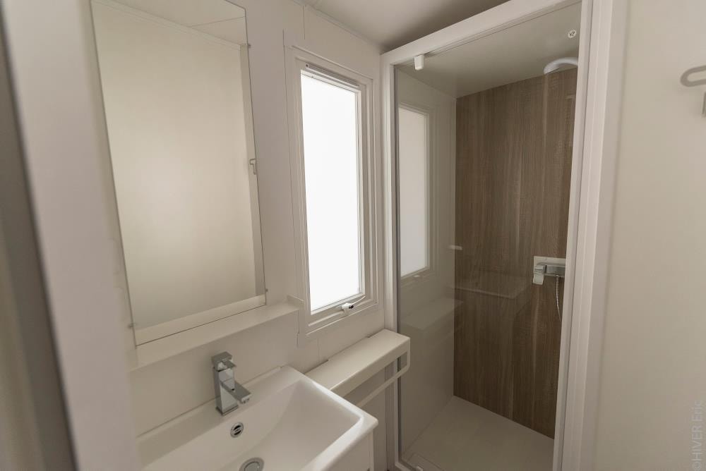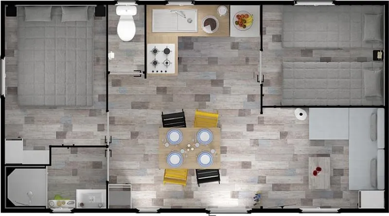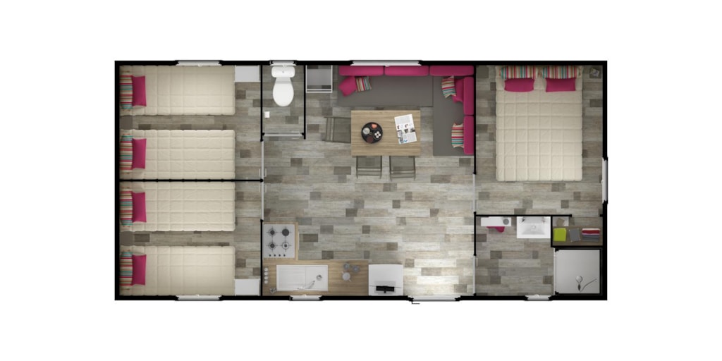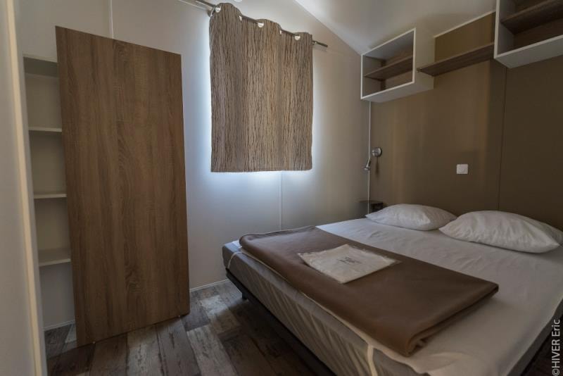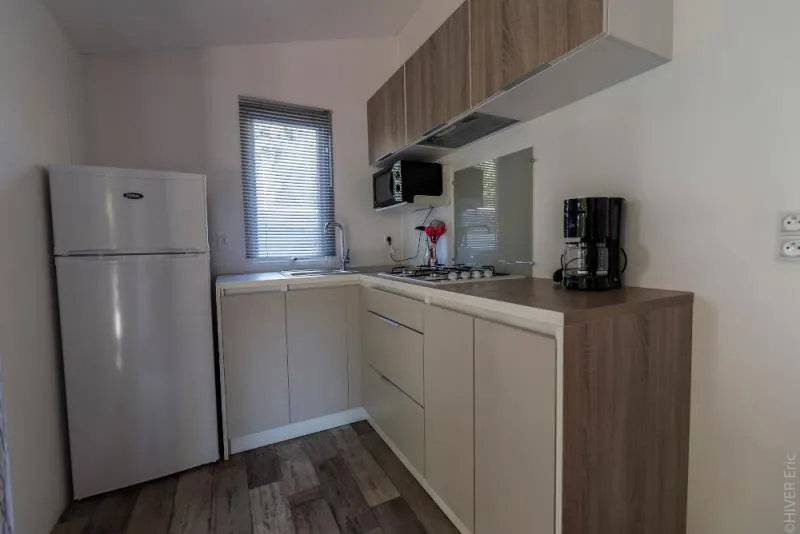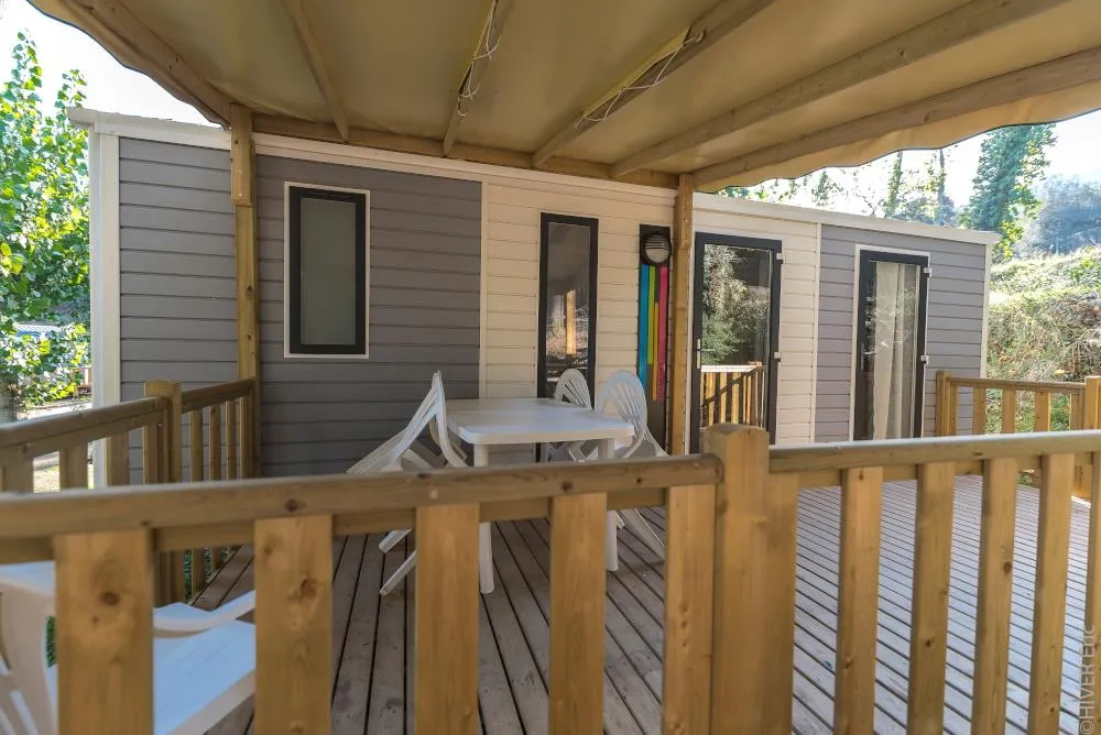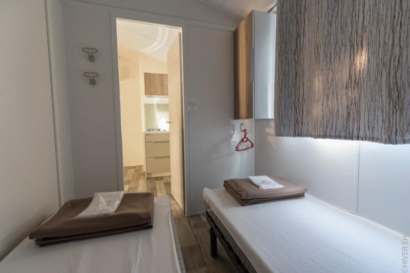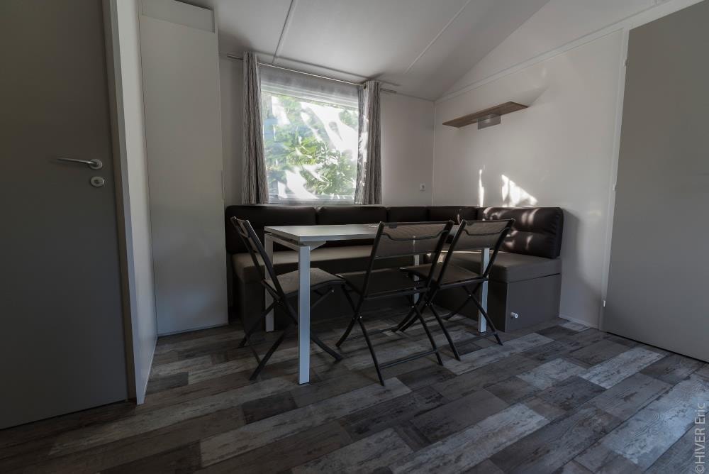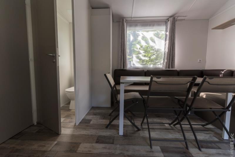 Luxuriöse Mobilheim für 4 bis 5Personen bietet eine Klimaanlage, eine Sitzecke und eine offene Küche mit Kaffeemaschine, Mikrowelle und Kühlschrank mit integriertem Gefrierfach. Es gibt zwei Schlafzimmer, davon eins mit Doppelbett und eins mit zwei Einzelbetten. Im Essbereich befindet sich eine Schlafcouch. Außerdem finden Sie eine separate Toilette und eine möblierte Terrasse. Es gibt eine Parkmöglichkeit für 1 Auto. WIFI ist frei!