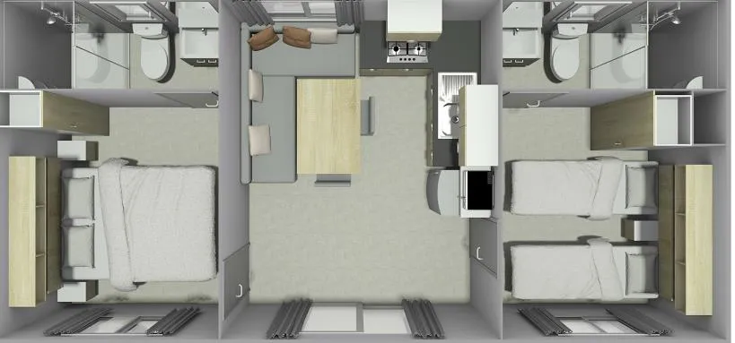 Ausgestattet mit Küche mit Waschbecken, Kuhlschrank, Gaskochstelle, Geschirr, Dinette ,Tisch,Stühle . Doppelzimmer, zwei Zimmer mit zwei Betten, Decken und Kissen, Moskitonetze. Zwei Bad mit Toilette und Dusche mit Warmwasser.
