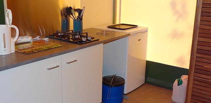 Das XL Westernzelt besticht durch eine Außenküche, einen Zwei-Flammen-Gasherd und einen eigenen Kühlschrank.