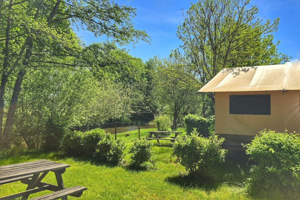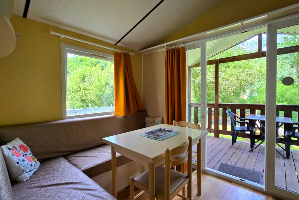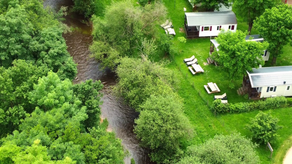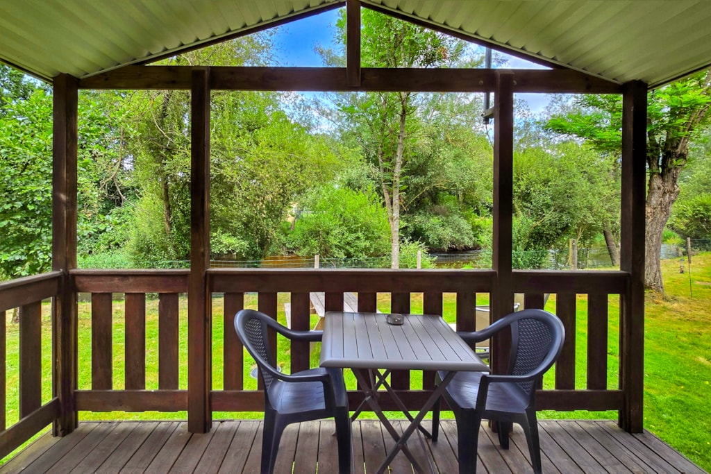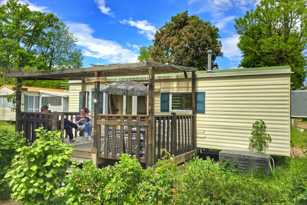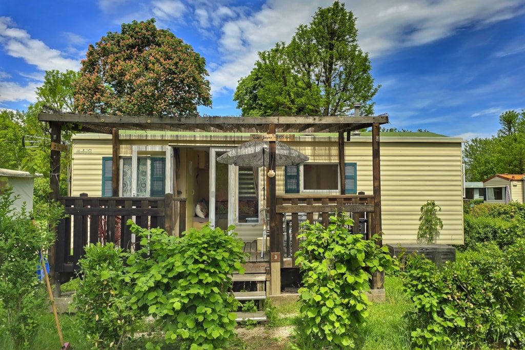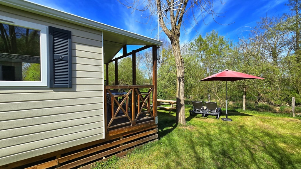 Das Mobilheim empfängt Sie am Flussufer in ruhiger Lage, wo das Rauschen des Wassers Ihre Momente der Entspannung begleitet.