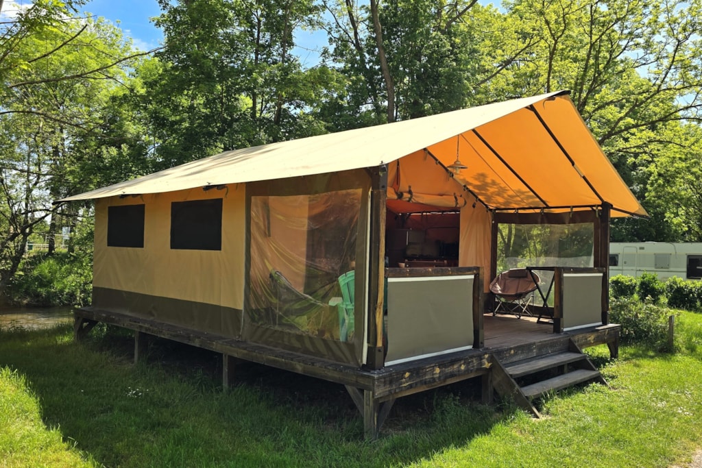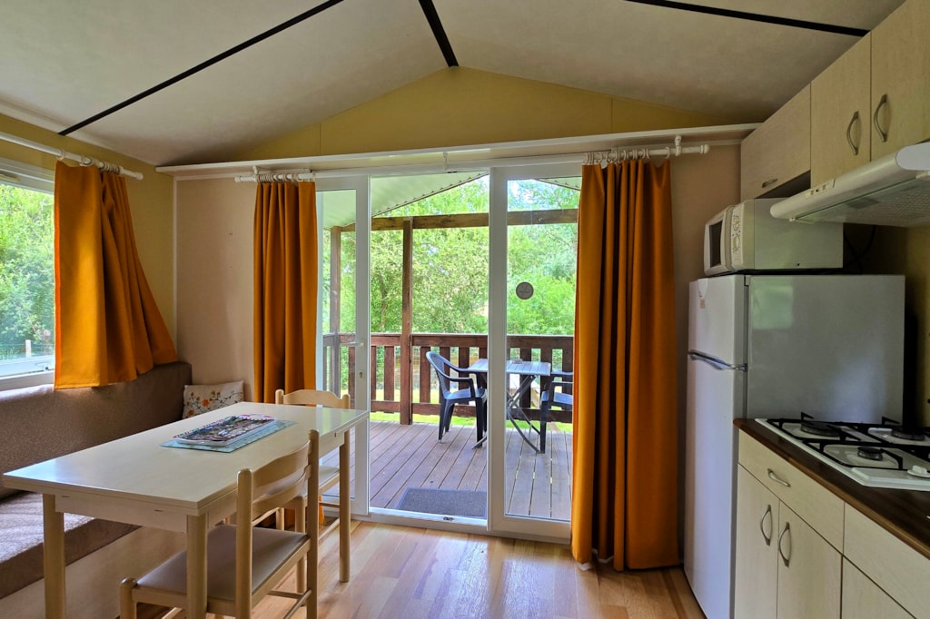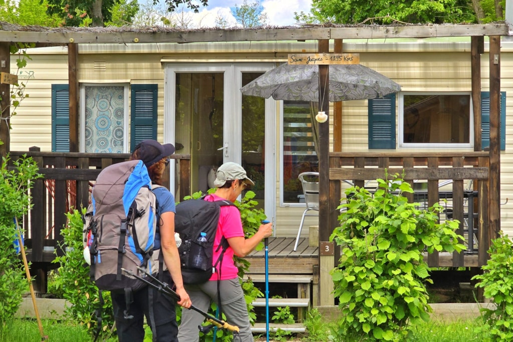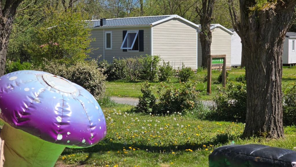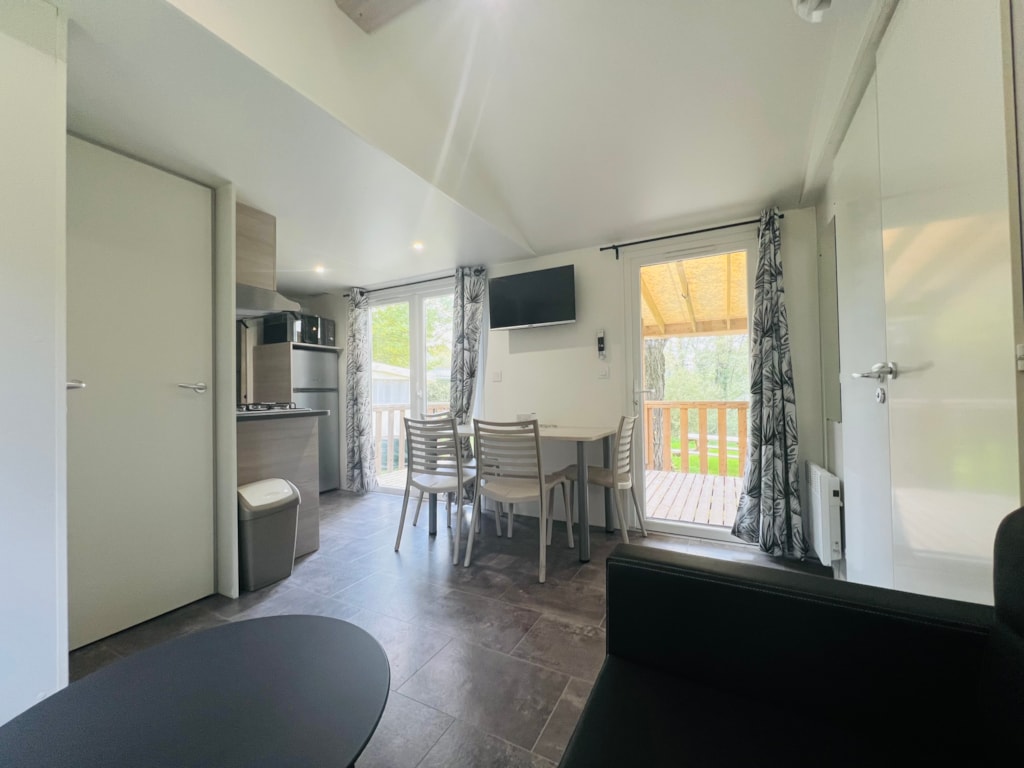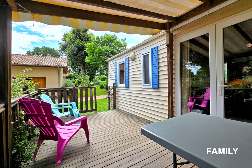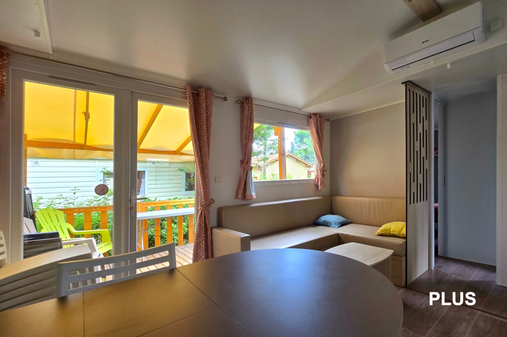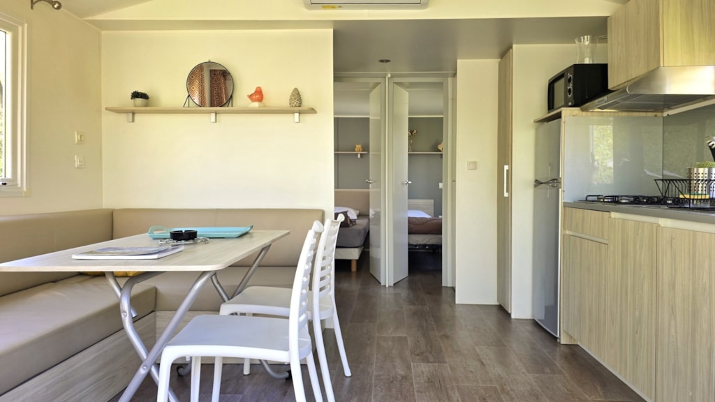 Perfect for the whole family, up to 6 people, our recent Evolution Mobile Home offer exceptional comfort. With air conditioning, TV, refrigerator, dishes, microwave, hob, and sanitary facilities, you will feel at home during your stay.