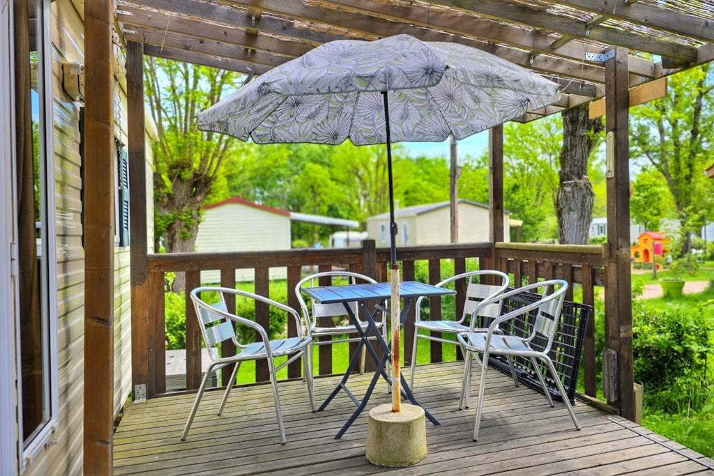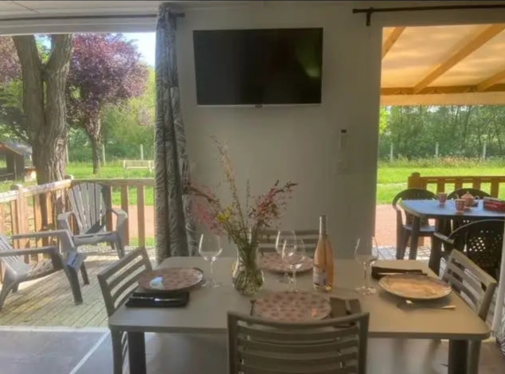 Dieses hervorragende Mobilheim liegt ideal im Zentrum des Campingplatzes und bietet alles, was Sie für Ihre Mahlzeiten auf Ihrer großen Terrasse benötigen.