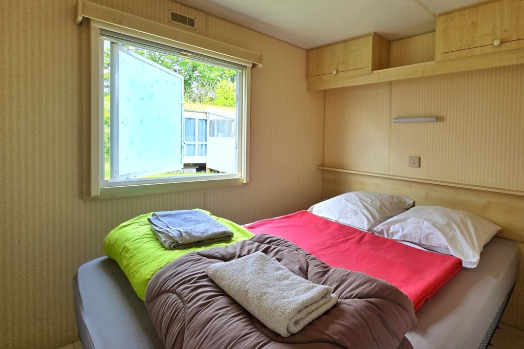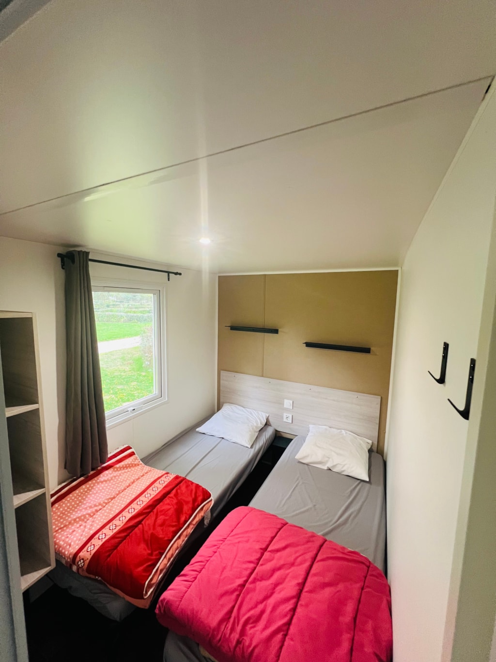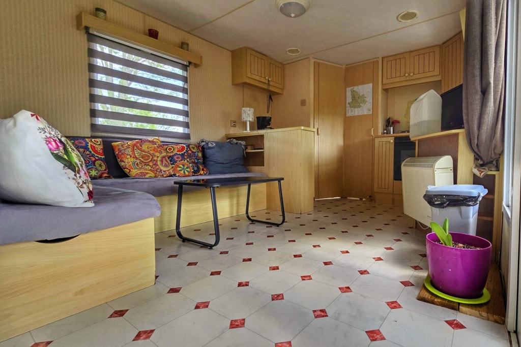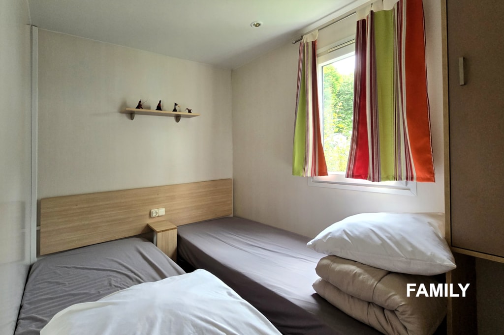 Unser Mobilheim bietet bequem Platz für bis zu vier Personen. Es verfügt über zwei Schlafzimmer: das erste mit einem Doppelbett (140 x 200 cm) und das zweite mit zwei Einzelbetten (80 x 190 cm).