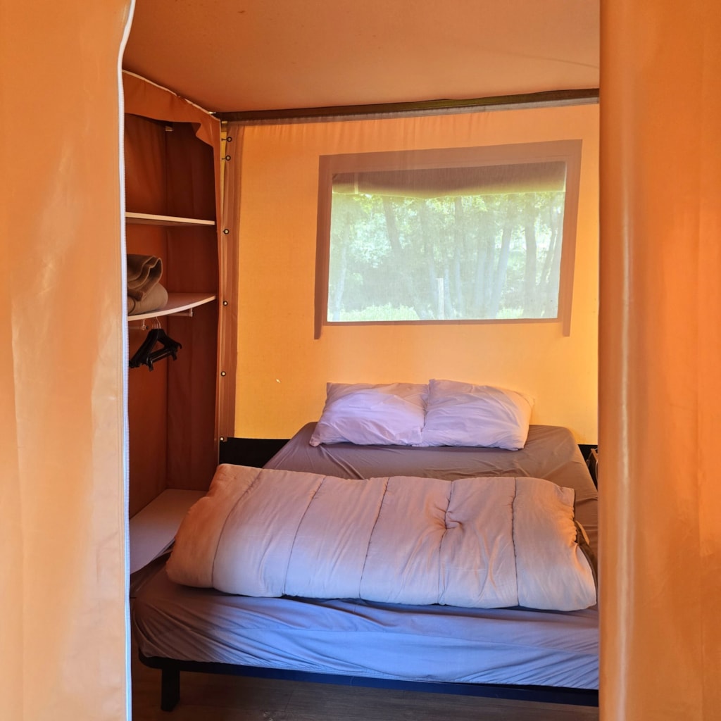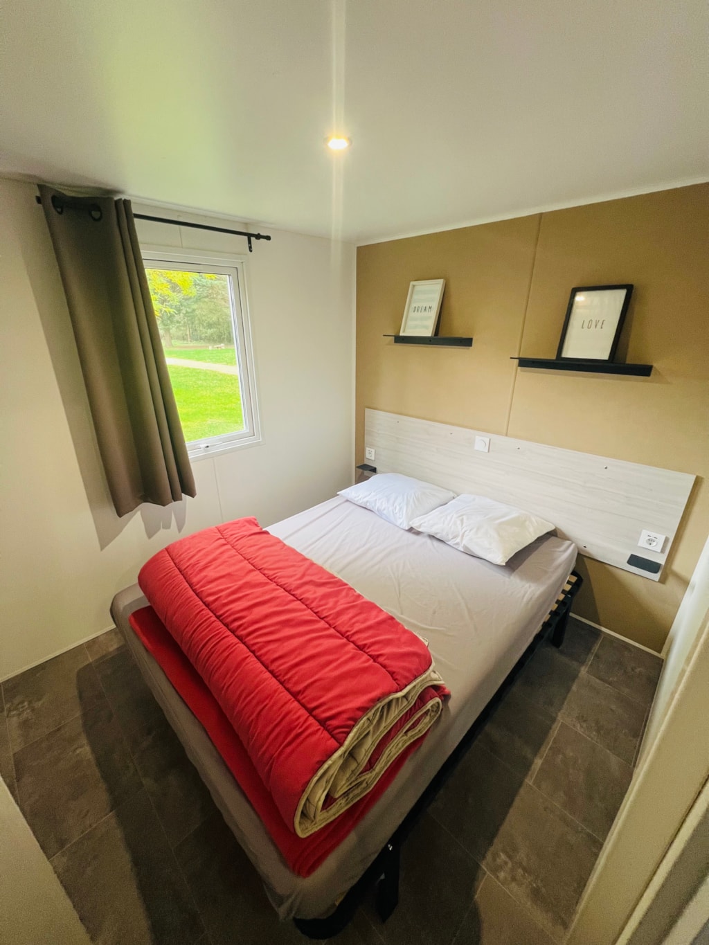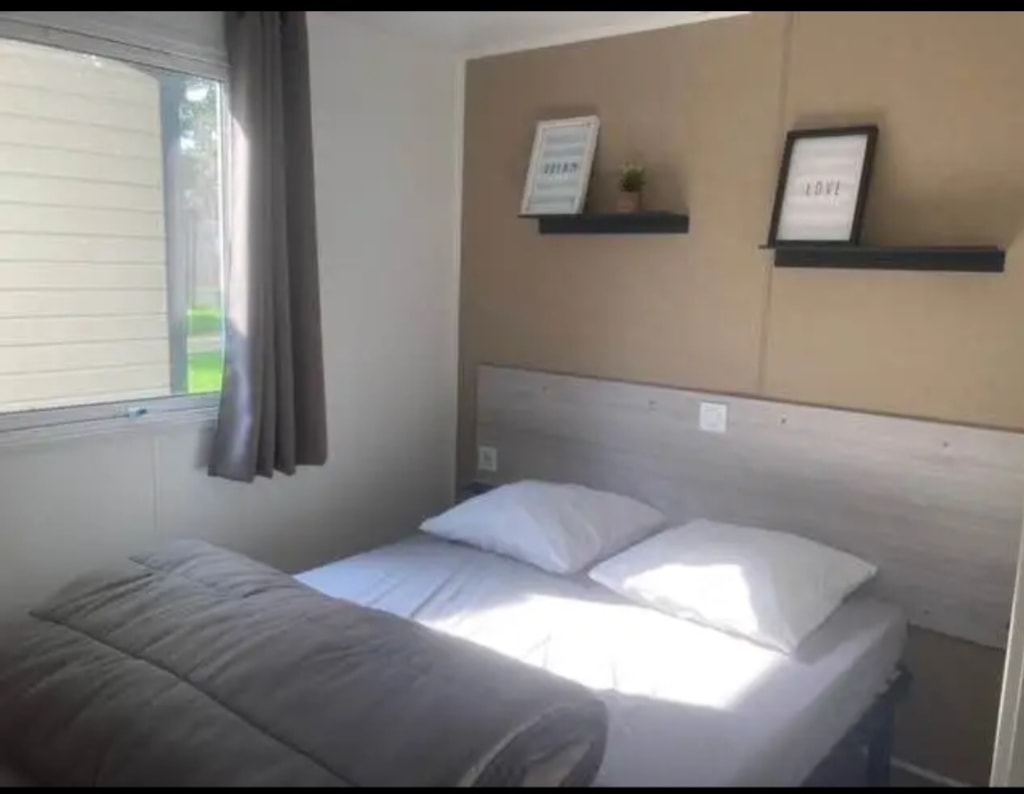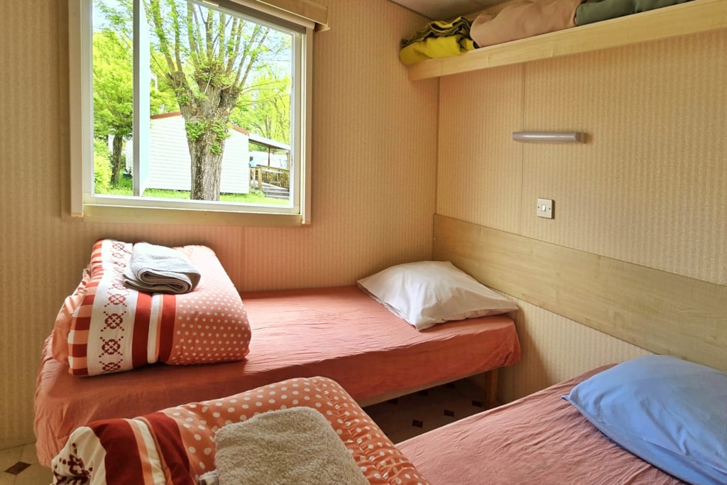Unser Mobilheim bietet bequem Platz für bis zu vier Personen. Es verfügt über zwei Schlafzimmer: das erste mit einem Doppelbett (140 x 200 cm) und das zweite mit zwei Einzelbetten (80 x 190 cm).