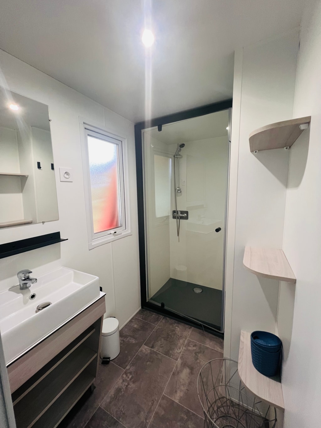 Dieses Premium-Mobilheim gehört zu den neuesten Mietobjekten auf dem Campingplatz. Es ist sehr geräumig und bietet bequem Platz für 6 Personen. Es ist hochwertig ausgestattet und möbliert. Zur Ausstattung gehören Klimaanlage, Fernseher, Kühlschrank, Geschirr, Mikrowelle, Kochplatte, Senseo-Kaffeemaschine, Wasserkocher sowie ansprechendes Geschirr und ein komfortables Duschbad.
