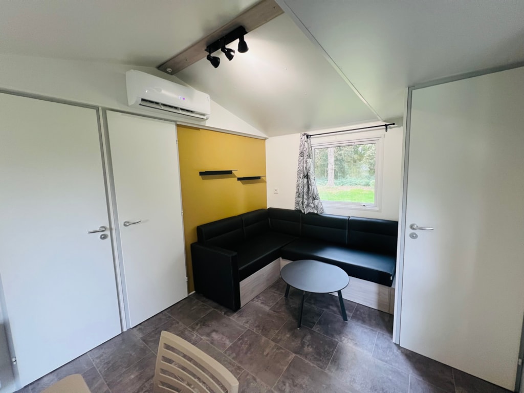 Dieses Premium-Mobilheim ist das neueste Mietobjekt auf dem Campingplatz. Es ist sehr geräumig und bietet bequem Platz für vier Personen. Es verfügt über hochwertige Ausstattung und Möbel. Zur Ausstattung gehören Klimaanlage, Fernseher, Kühlschrank, Geschirr, Mikrowelle, Kochplatte, Senseo-Kaffeemaschine, Wasserkocher und ansprechendes Geschirr.