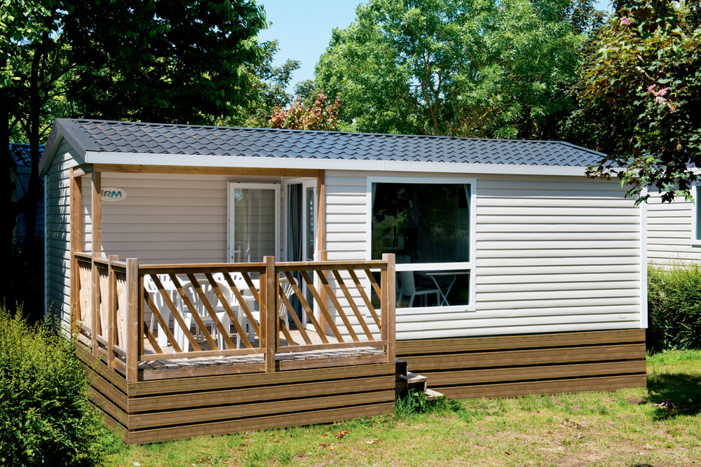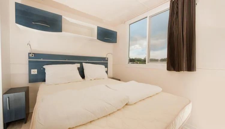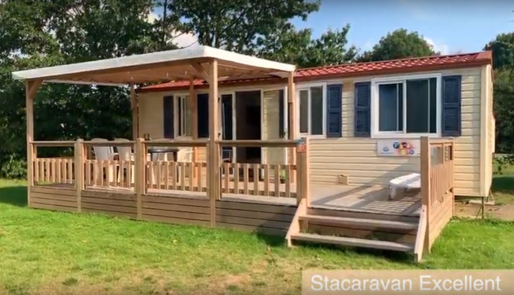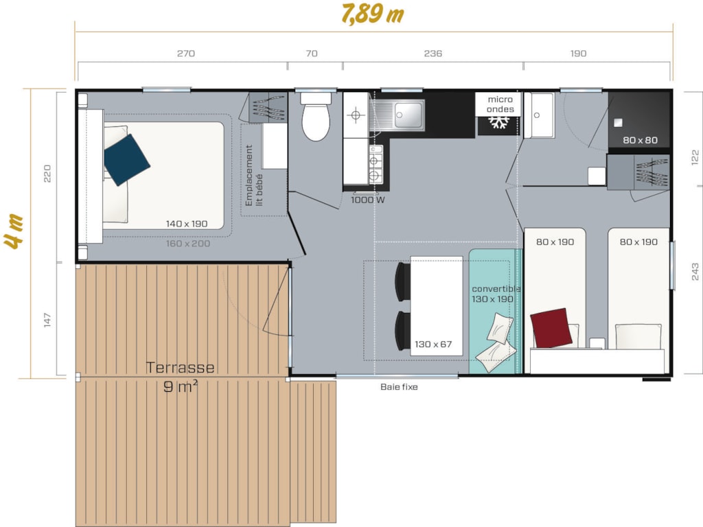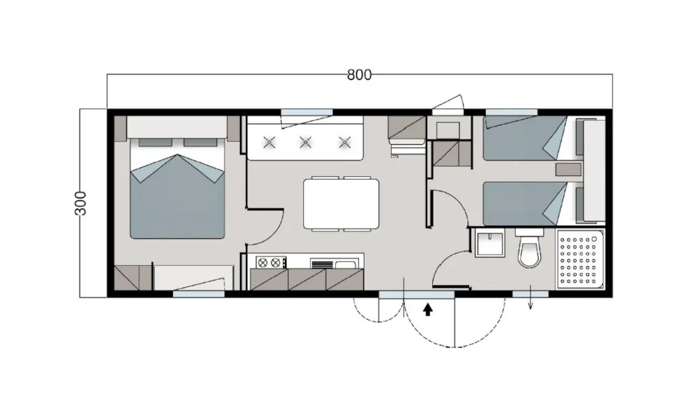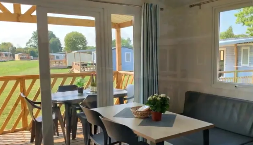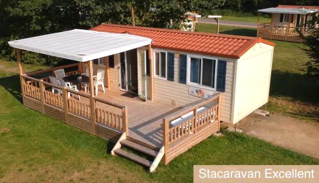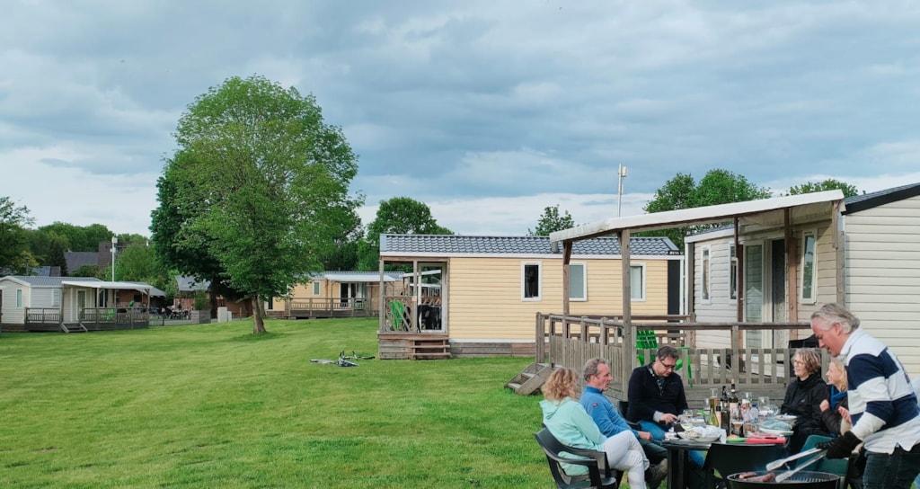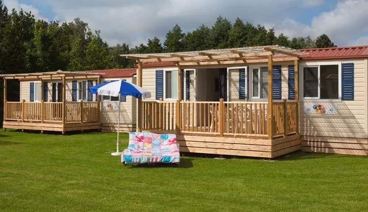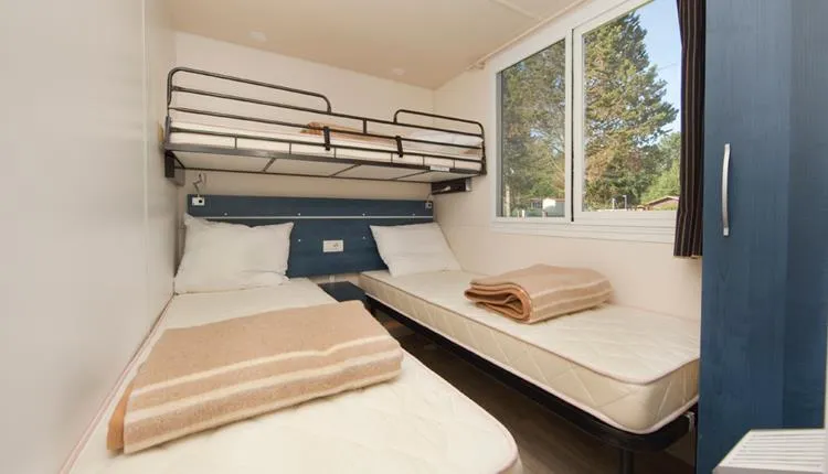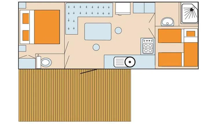 2 Schlafzimmer | ca. 32 m² (max. 5 Personen) Dieses beliebte Borken Deluxe Mobilheim zeichnet sich durch seine große Holzveranda von 9 m² aus . Die Terrasse ist (halb) überdacht, so daß Sie auch bei schlechteren Wetterbedingungen draußen sitzen können. Die große Glasfront beim Wohnbereich sorgt für einen optimalen Licheinfall. Die Mobilheime stehen weit auseinander, so daß Sie auch im Urlaub von Ihrer Privatspäre genießen können. Das Mobilheim hat 4 Schlafgelegenheiten. Eine eventuelle 5. Person kann auf der Bank im Wohnbereich schlafen. Die Mobilheime Borken Deluxe verfügen über eine Heizung. Moderner Wohnbereich mit komfortabler Eßecke (diese kann bei Bedarf zu einer Schlafbank für 2 Personen umgebaut werden). Besonders viel Lichteinfall durch die große Glasfront. Die offene, vollständig eingerichtete Küche verfügt über einen Kühlschrank mit Gefrierfach, einem Kochfeld mit 4 Gasbrennern, Kaffeemaschine und einen Wasserkocher. Das Elternschlafzimmer ist ausgestattet mit einem Doppelbett (140 x 190) und viel Stauraum. In diesem Zimmer ist es zudem möglich, ein Babybettchen aufzustellen. Im Kinderzimmer befinden sich 2 Einzelbetten (80 x 190). Das Badezimmer ist ausgestattet mit einem Schrank, Waschtisch und einer Duschkabine. Das WC ist separat. Auf der gemütlichen Holzveranda befinden sich Gartenmöbel und ein Sonnenschirm. Die Terrasse ist (halb) überdacht. Vor Ort zu zahlen: € 17,00 Umwelt Beitrag