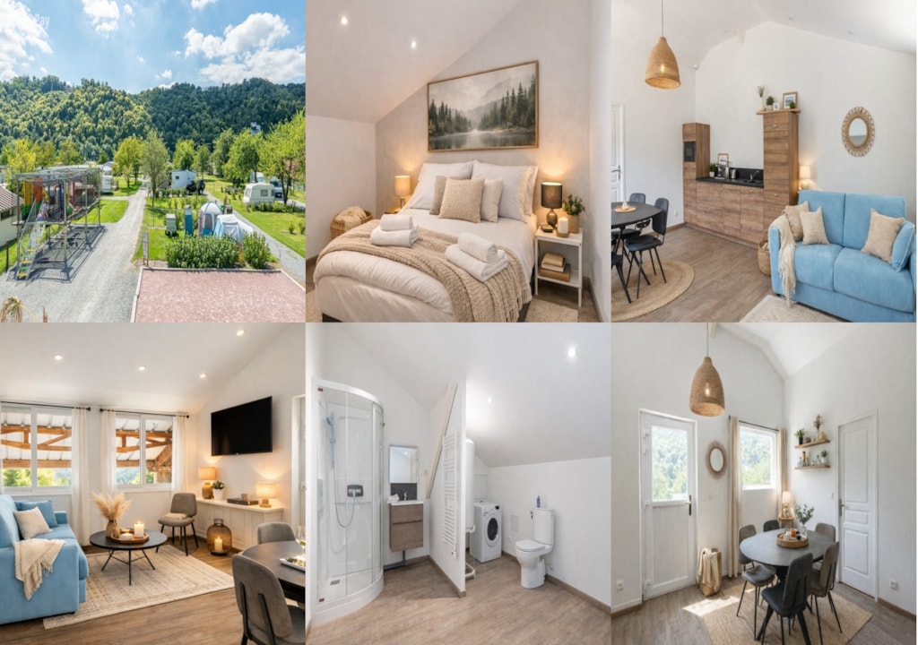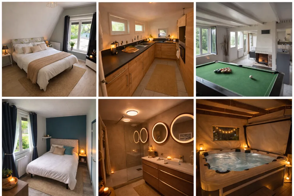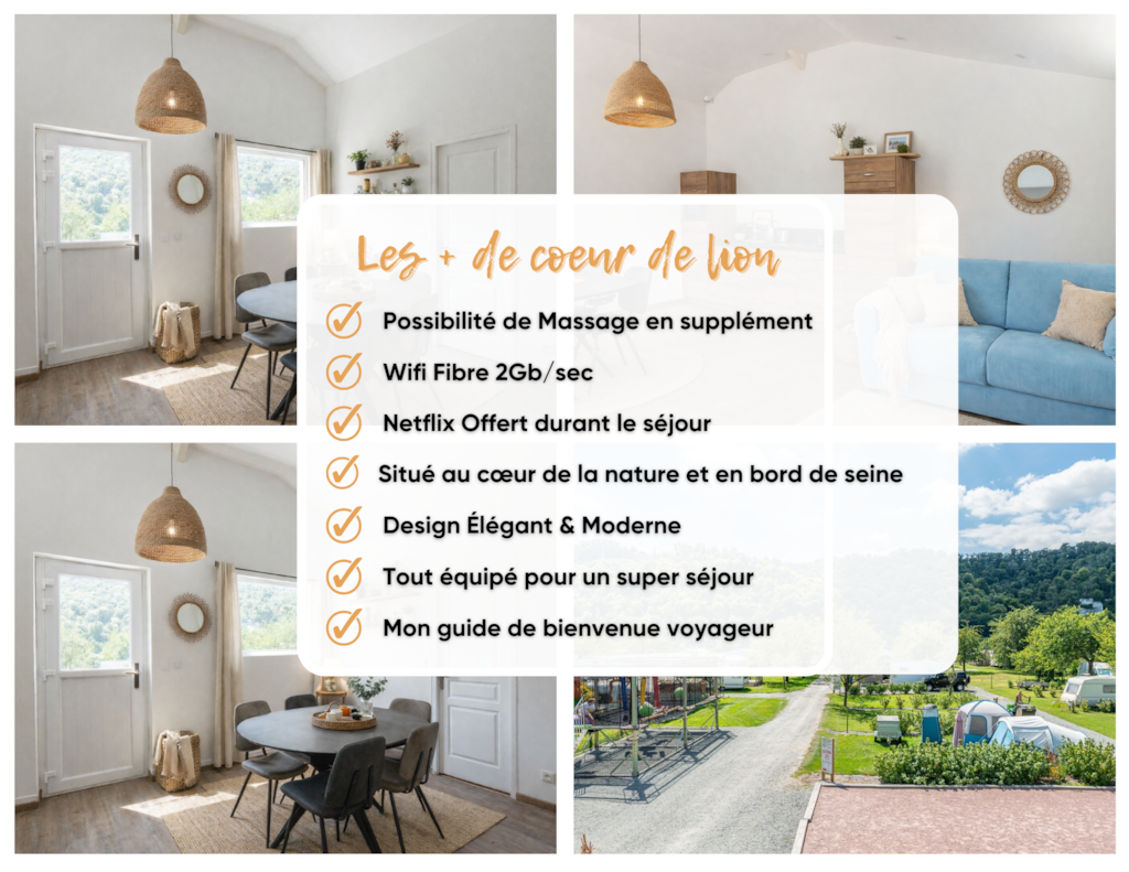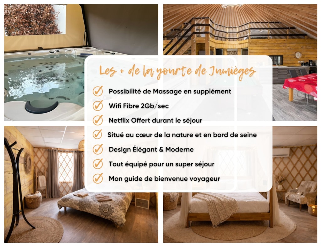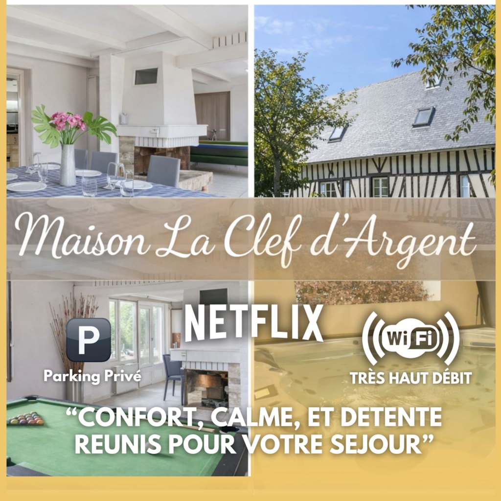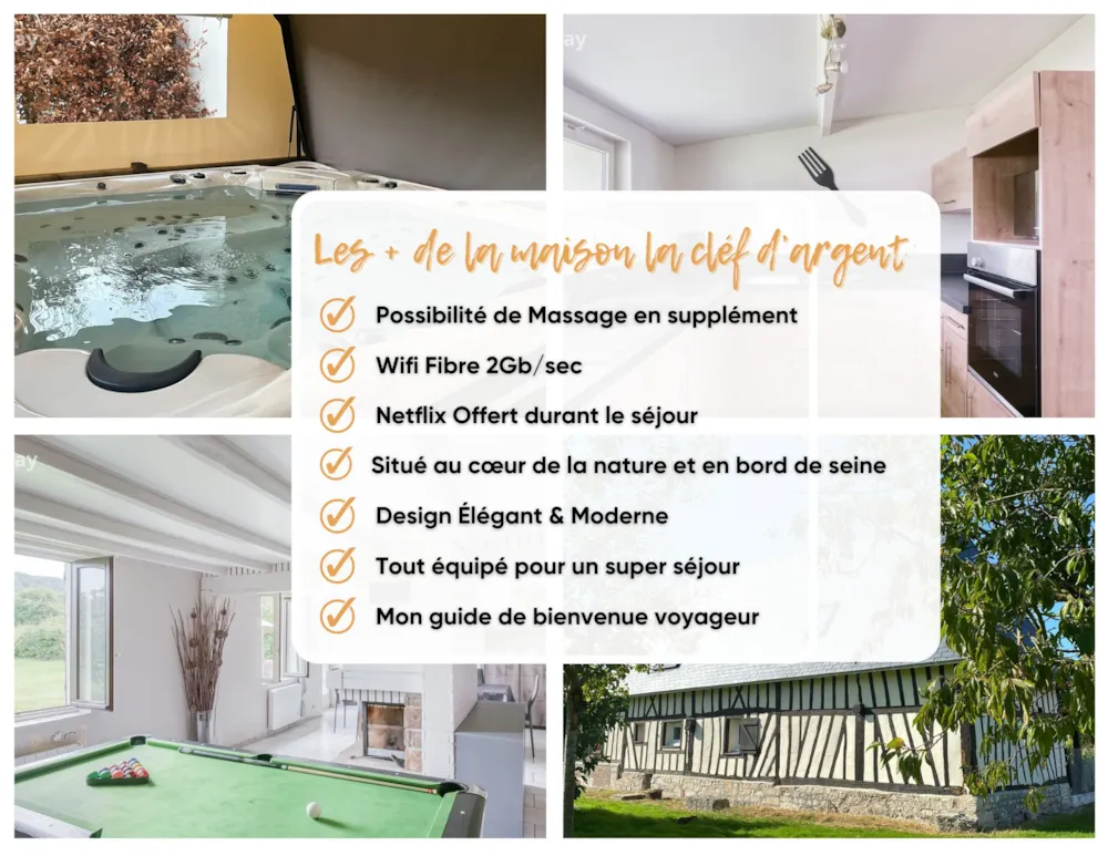 La Cléf d'Argent ist ein traditionelles normannisches Haus in idealer Lage in Jumièges, am Ufer der Seine, auf einem 4-Sterne-Campingplatz. Ruhe und Entspannung sind in diesem außergewöhnlichen Anwesen garantiert. Das Haus verfügt über ein Wohnzimmer, ein Wohnzimmer mit Kamin, eine voll ausgestattete Küche, 3 Schlafzimmer mit Doppelbetten, einen Schlafsaal mit zwei Einzelbetten, ein Badezimmer mit Dusche, Spielzimmer mit Billard und Tischfußball. Großer Garten. Privater Whirlpool. Fahrradverleih und Grillmöglichkeit. Bettwäsche und Handtücher inklusive. Haustiere akzeptiert.