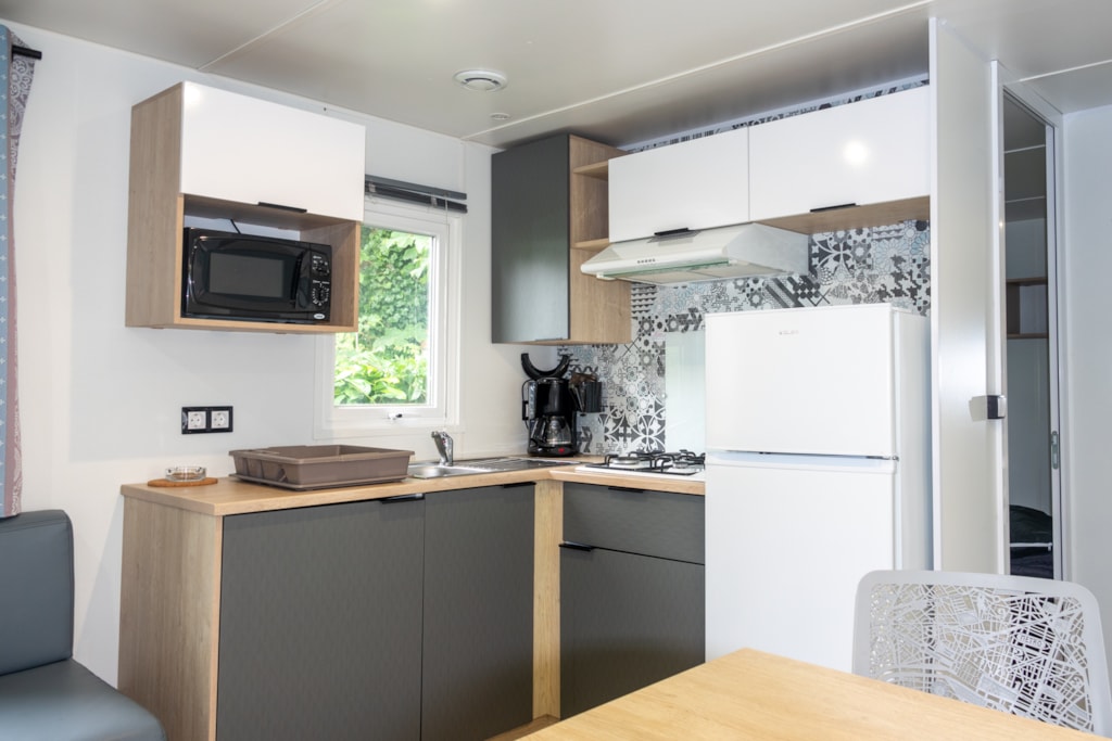 - Küchenzeile mit 2-Flammen-Kochfeld, Spüle, Kühlschrank, Mikrowelle, elektrischer