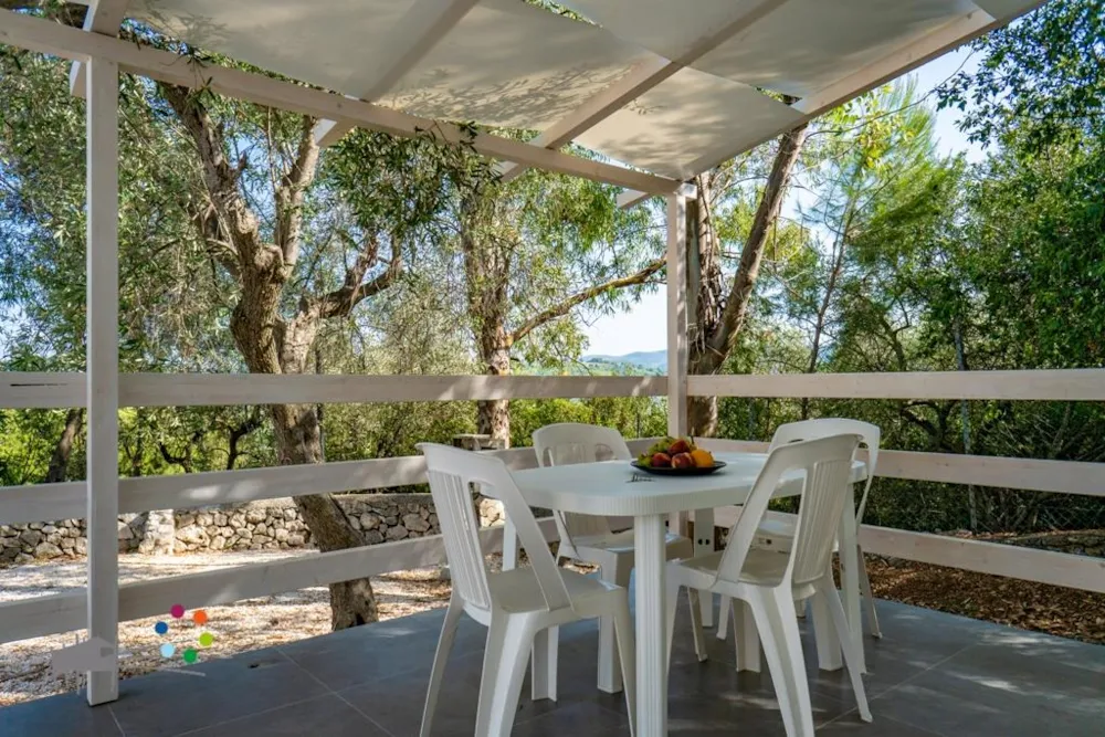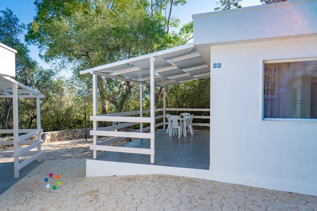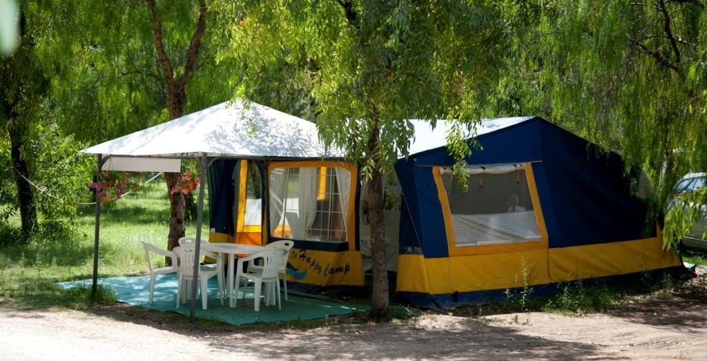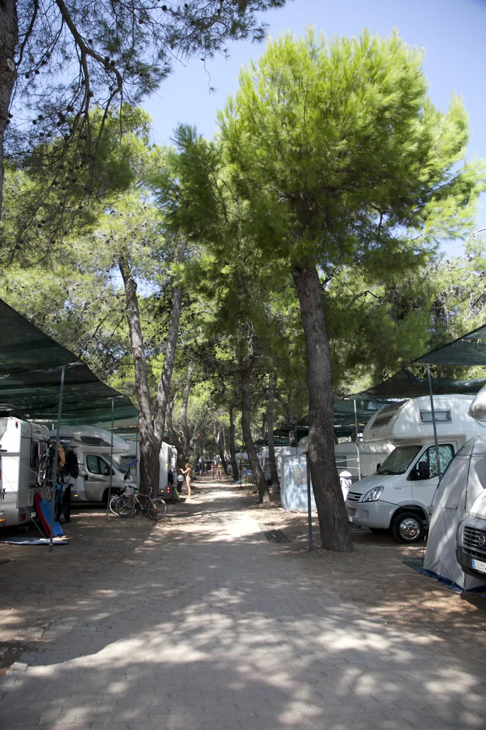Il campeggio si estende lungo un terreno pianeggiante, tra il verde degli alberi di pino che delimitano le piazzole per roulotte e camper. Sono coperte da frangisole di tela che contribuiscono a renderle più ombreggiate.