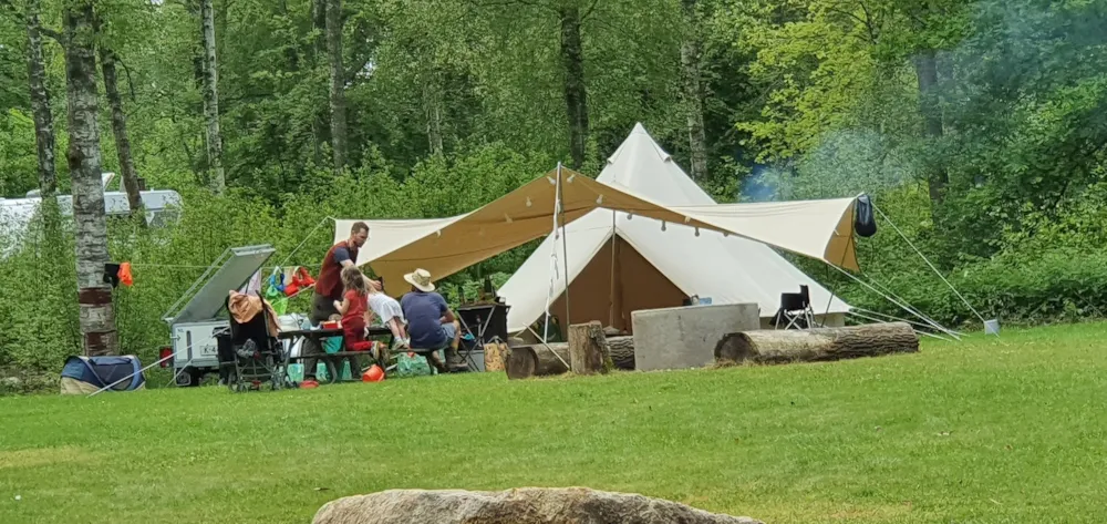 Zeltplatz in offenem Rondell mit Feuerstelle und Sitzgelegenheit in der Mitte. Dadurch kommt man schnell in Kontakt mit den anderen Gästen. Reichlich Platz auf den Stellplätzen, auch für unseren großen Faltcaravan. Auch Strom ist vorhanden.
