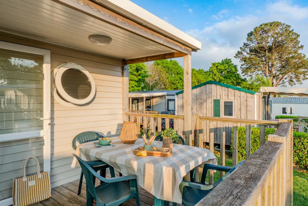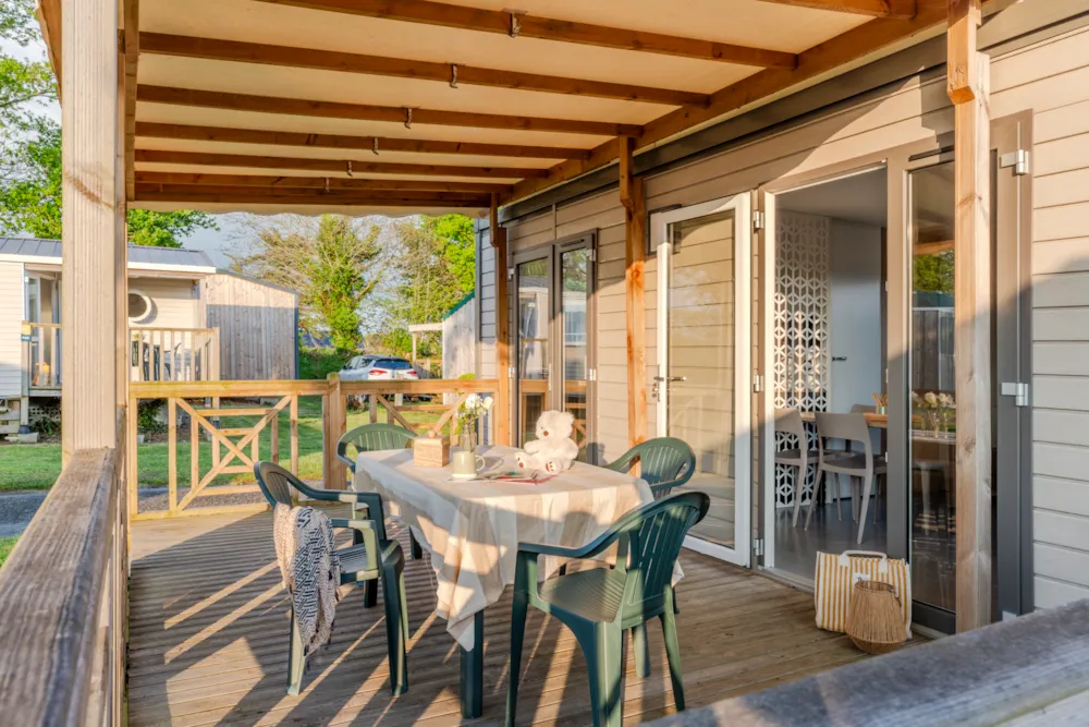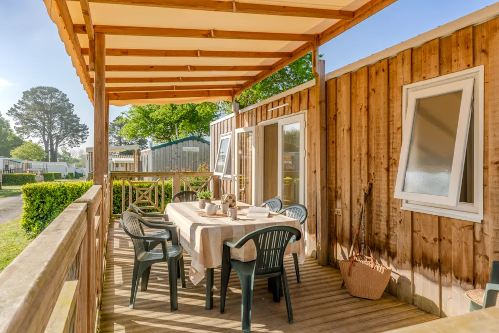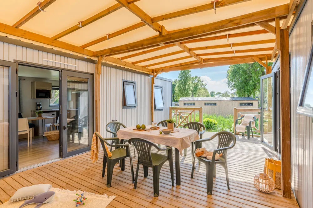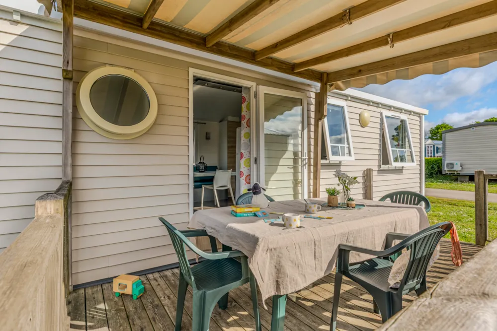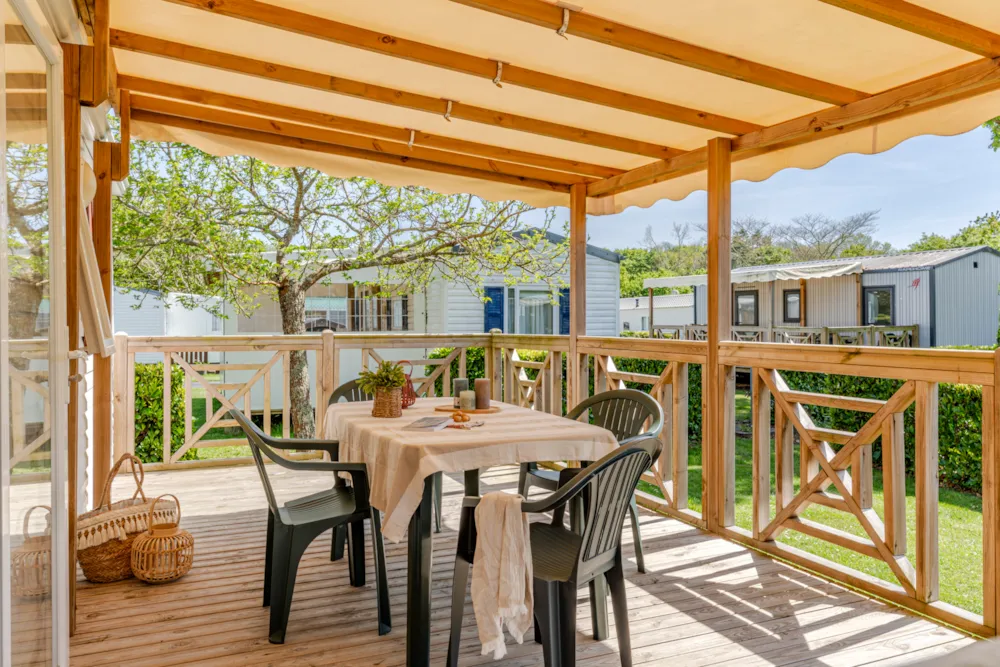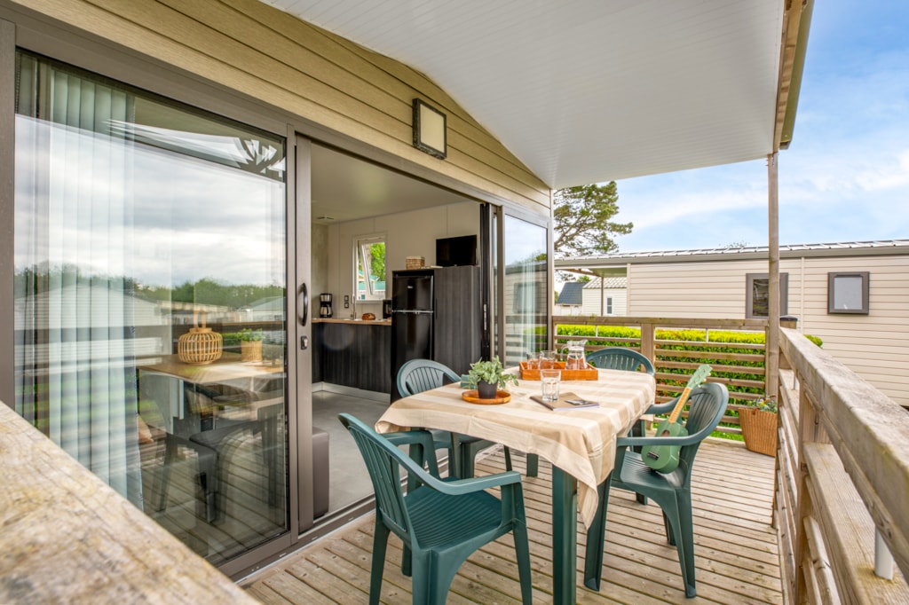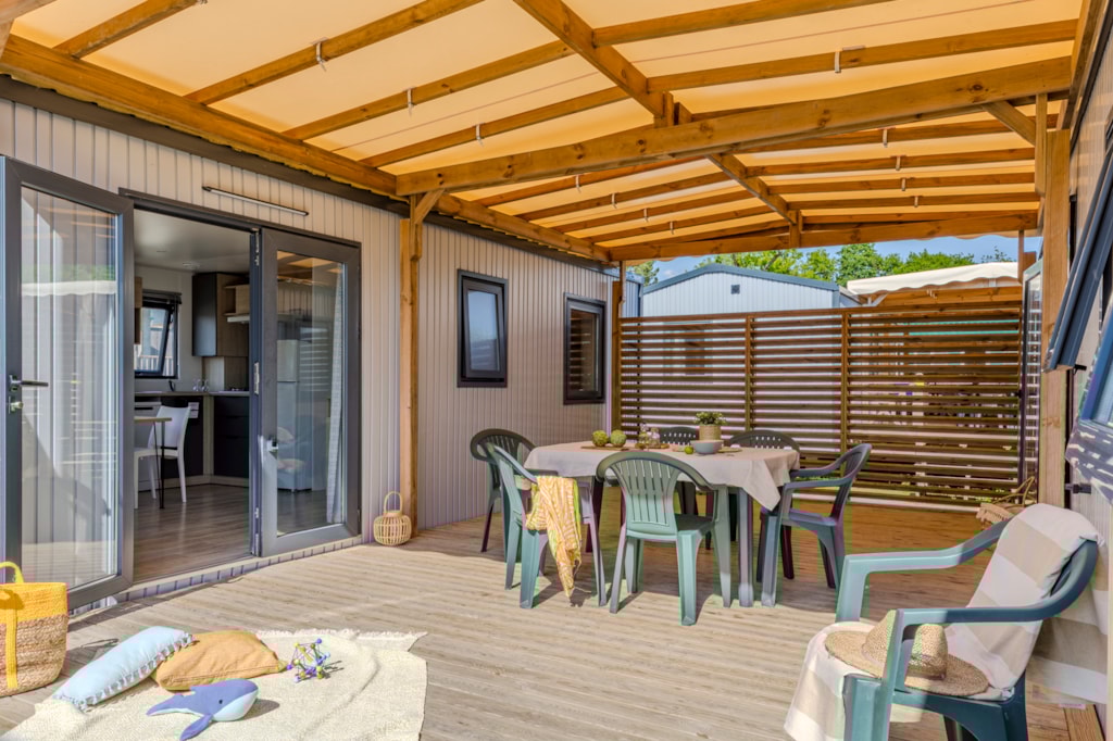 Das Dach ist zur Hausseite hin offen - es regnet an der Wand durch - unsere Schuhe und sonstigen Sachen sind alle nass geworden. Wir hatten das Mobilehome mit Überdachung gebucht, damit wir auch Dinge auf der Terrasse lagern und abstellen können.