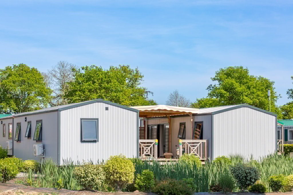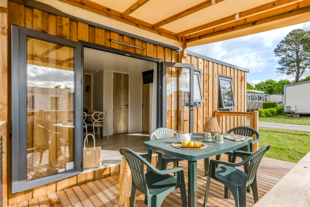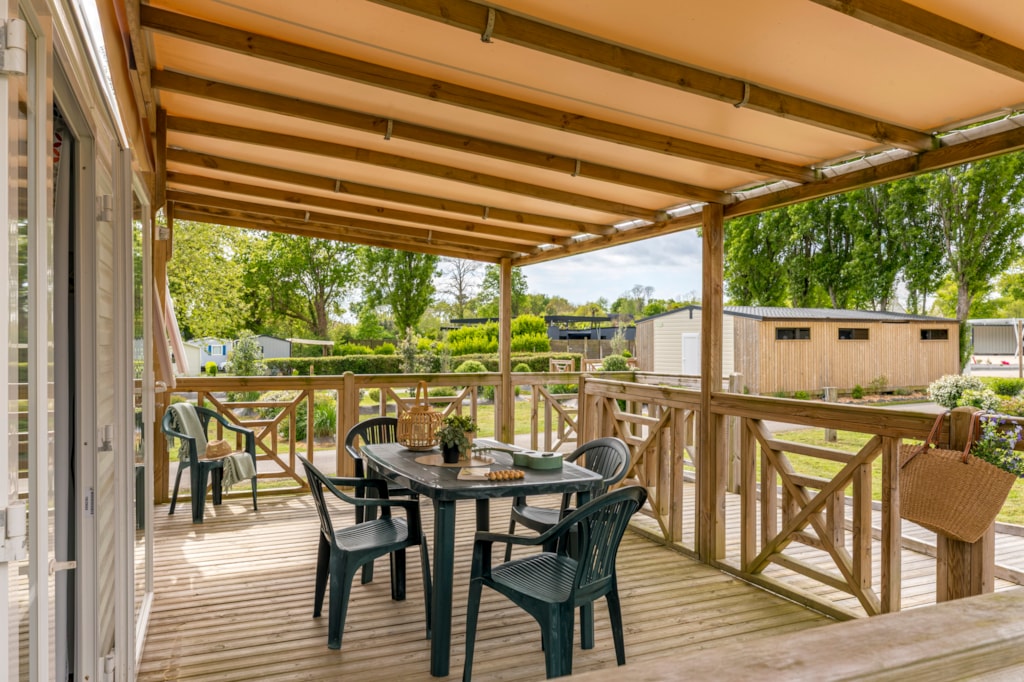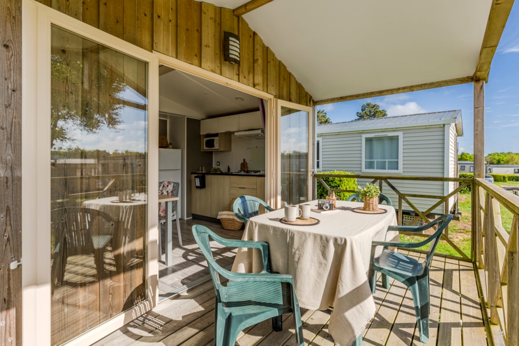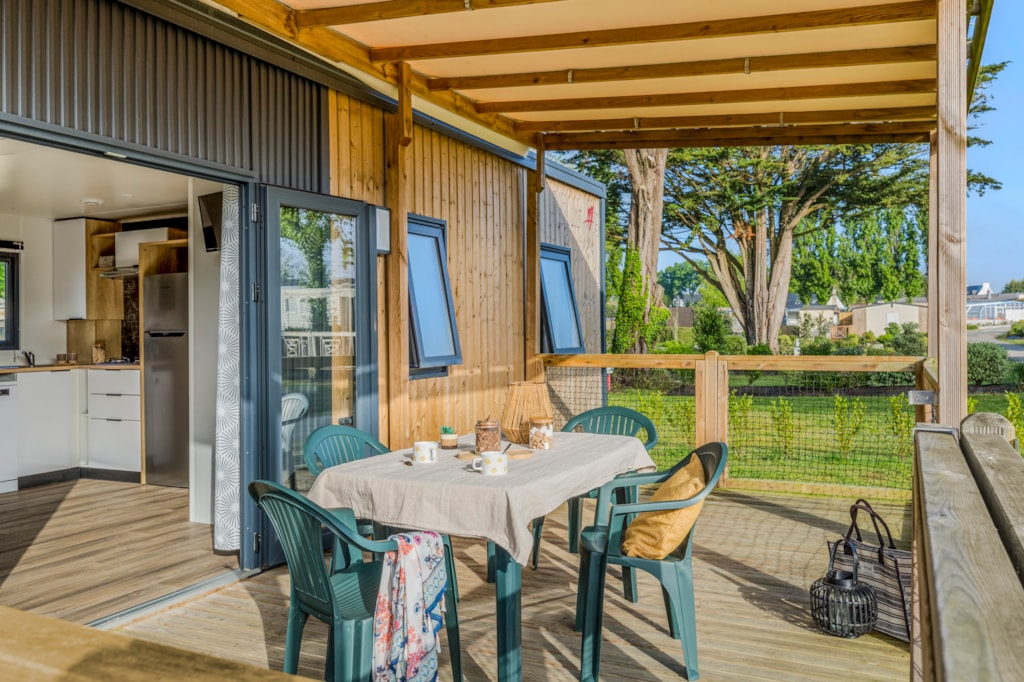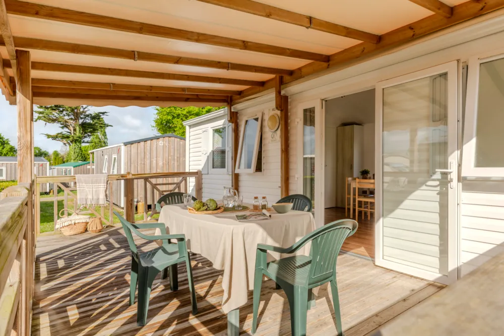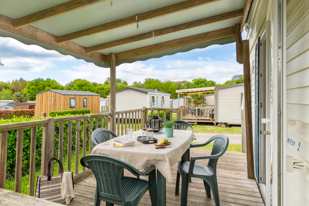Das Dach ist zur Hausseite hin offen - es regnet an der Wand durch - unsere Schuhe und sonstigen Sachen sind alle nass geworden. Wir hatten das Mobilehome mit Überdachung gebucht, damit wir auch Dinge auf der Terrasse lagern und abstellen können.