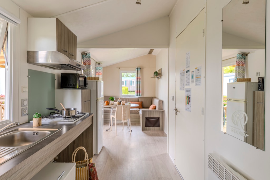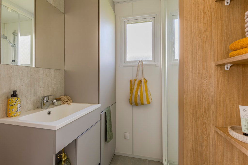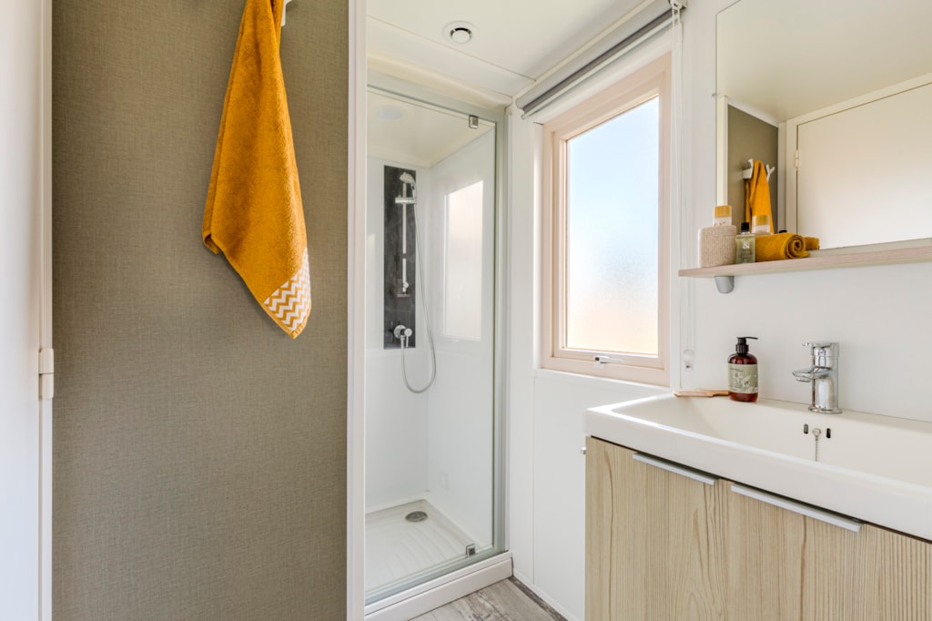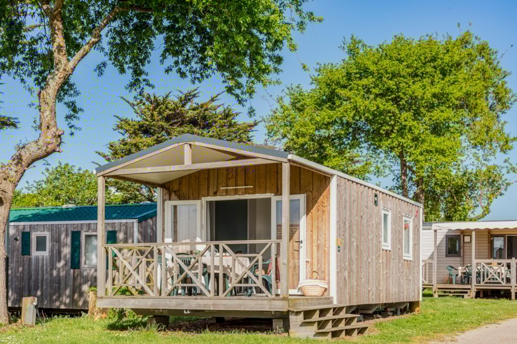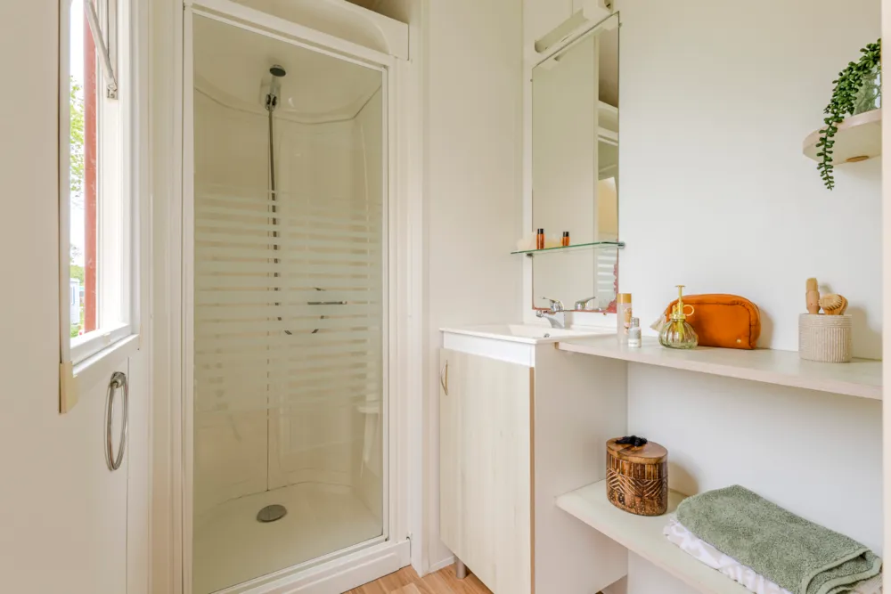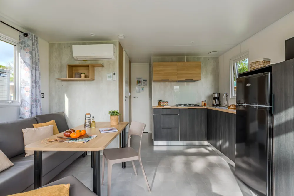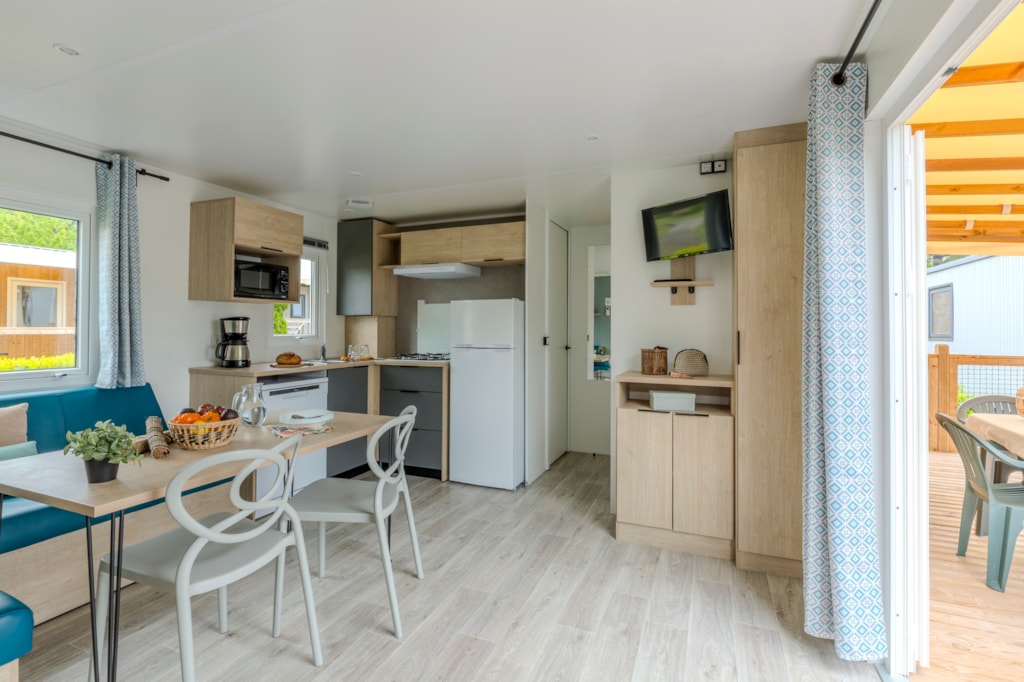 Das Dach ist zur Hausseite hin offen - es regnet an der Wand durch - unsere Schuhe und sonstigen Sachen sind alle nass geworden. Wir hatten das Mobilehome mit Überdachung gebucht, damit wir auch Dinge auf der Terrasse lagern und abstellen können.