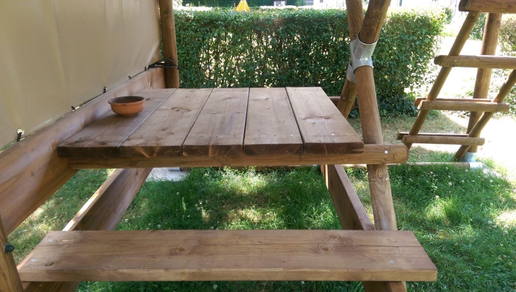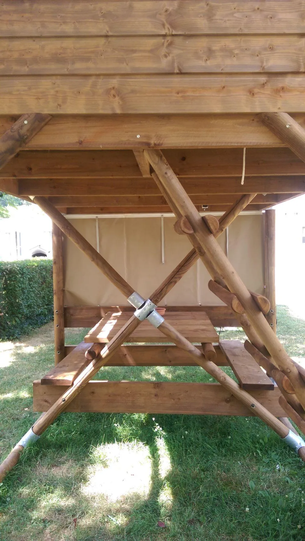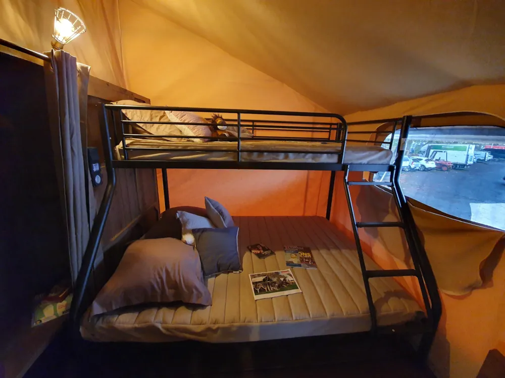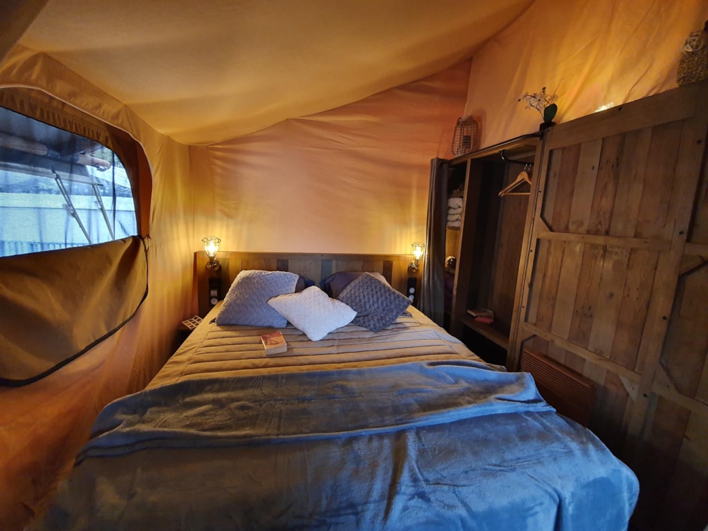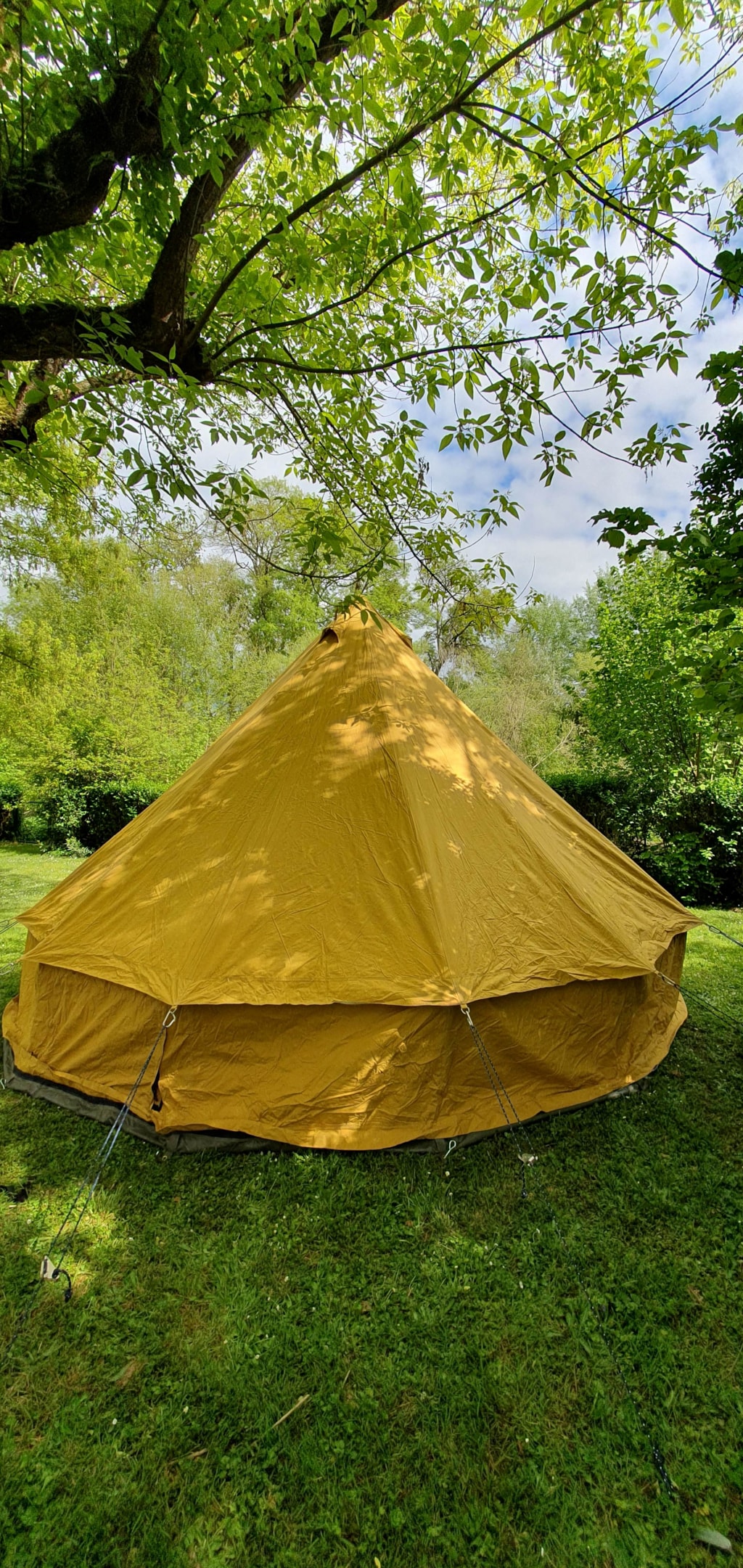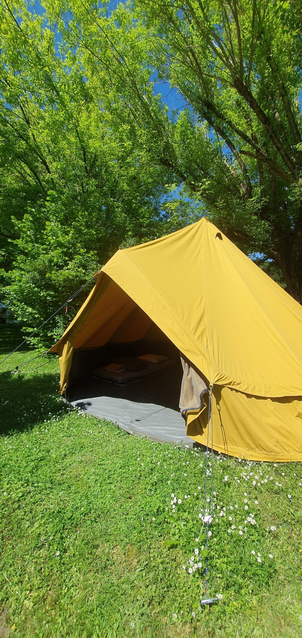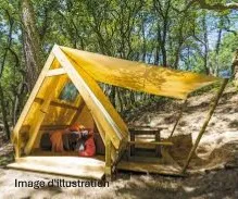 Biwakzelt bestehend aus einem Wohnraum im Erdgeschoss (Tisch) und einem Schlafbereich im Obergeschoss. Zugang durch eine Luke und eine Leiter. Für mehr Komfort ist der Schlafbereich mit einer (echten!) Matratze und einem Kissen ausgestattet. Beleuchtung, 2 Steckdose 220 v. Ideal für Wanderer zu Fuß oder mit dem Fahrrad (sichere Aufbewahrung für Fahrräder, Kühlschrank) Ideal für eine ungewöhnliche Nacht zu zweit. In Optionen: Frühstück auf Ihrem Biwak serviert.