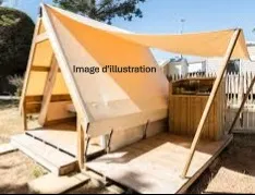Tente randonneur : tente pour 2 personnes avec 2 lits simples, une table pique-nique et un meuble kitchinette. Idéale pour les randonneurs à vélo.