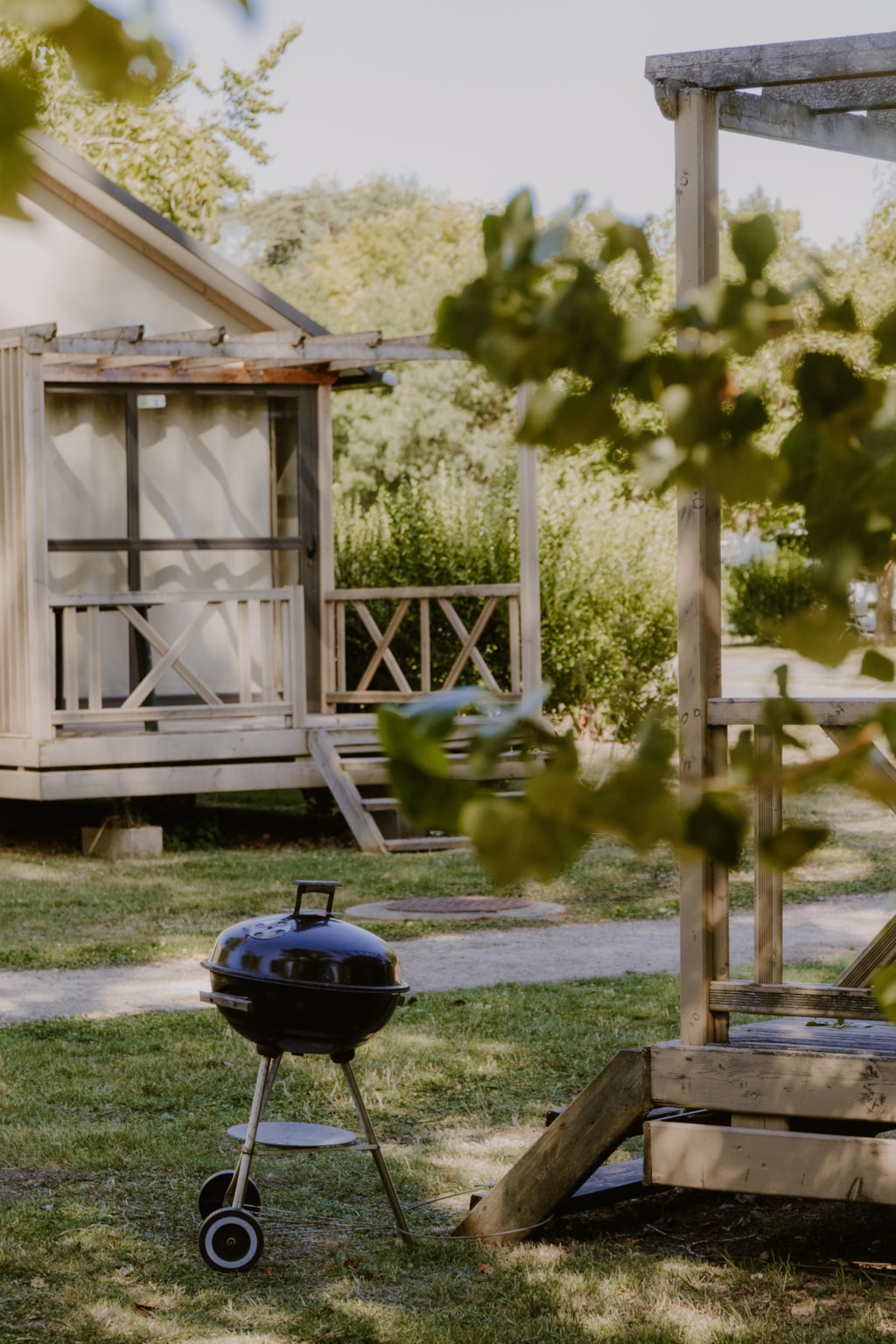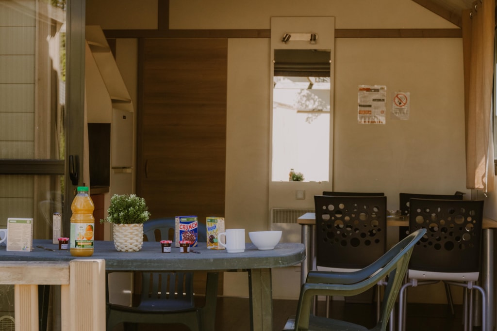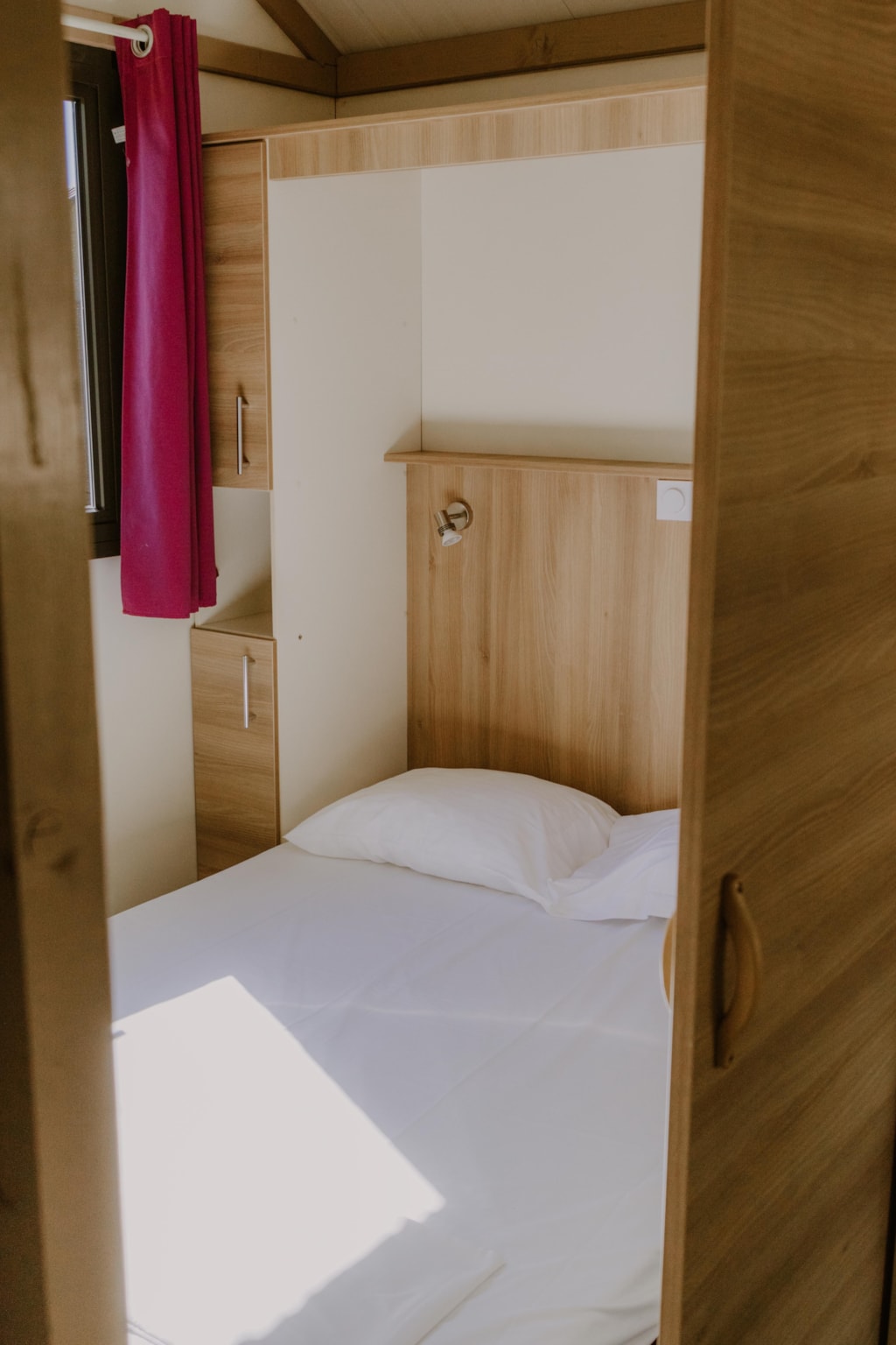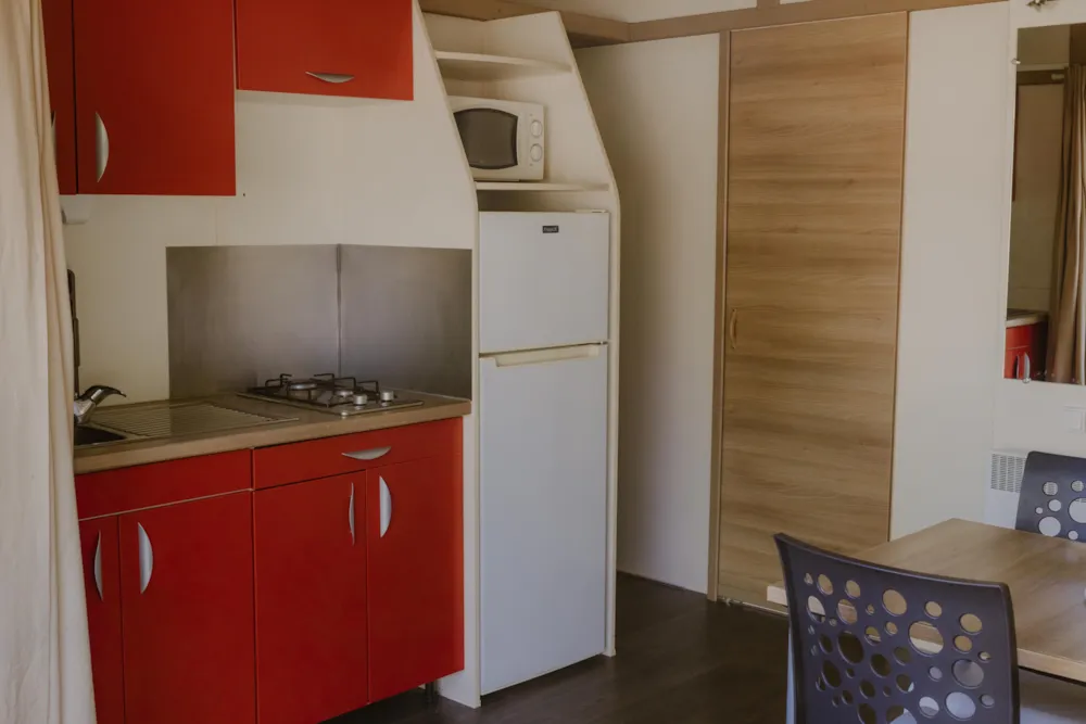 Kühlschrank, Kaffeemaschine, Mikrowelle, 2 Herdplatten, Geschirr). Dieses Chalet verfügt auch über ein Badezimmer mit Toilette und Dusche. Auf der 8m² großen Holzterrasse können Sie den Außenbereich genießen.