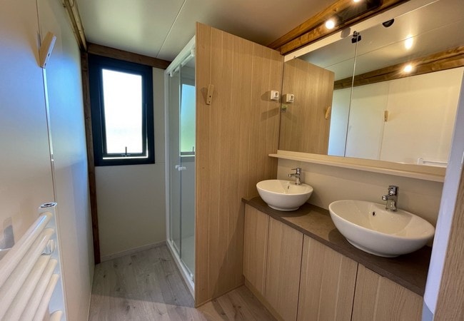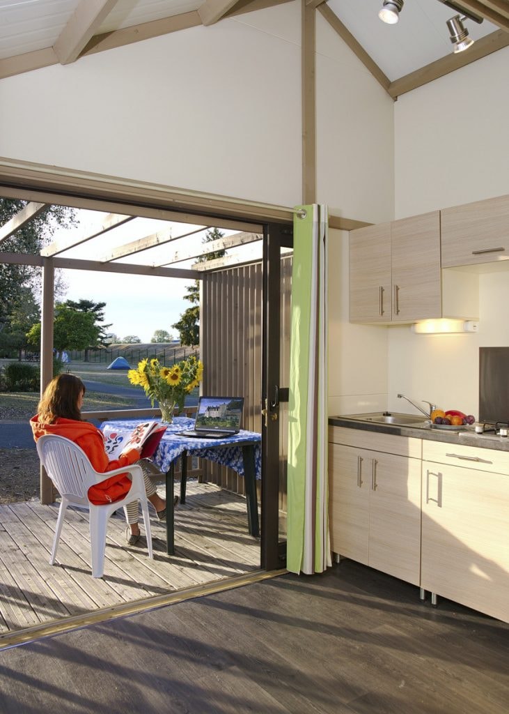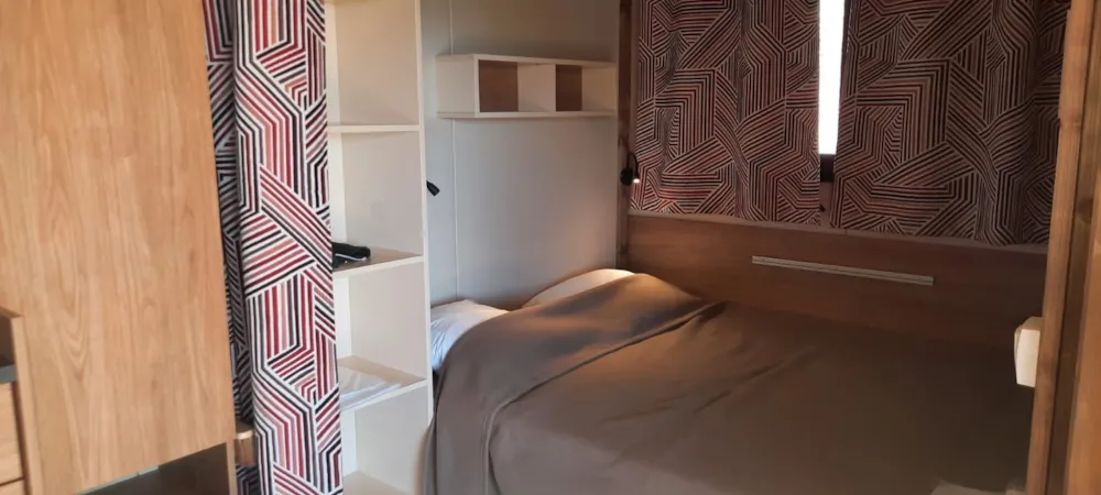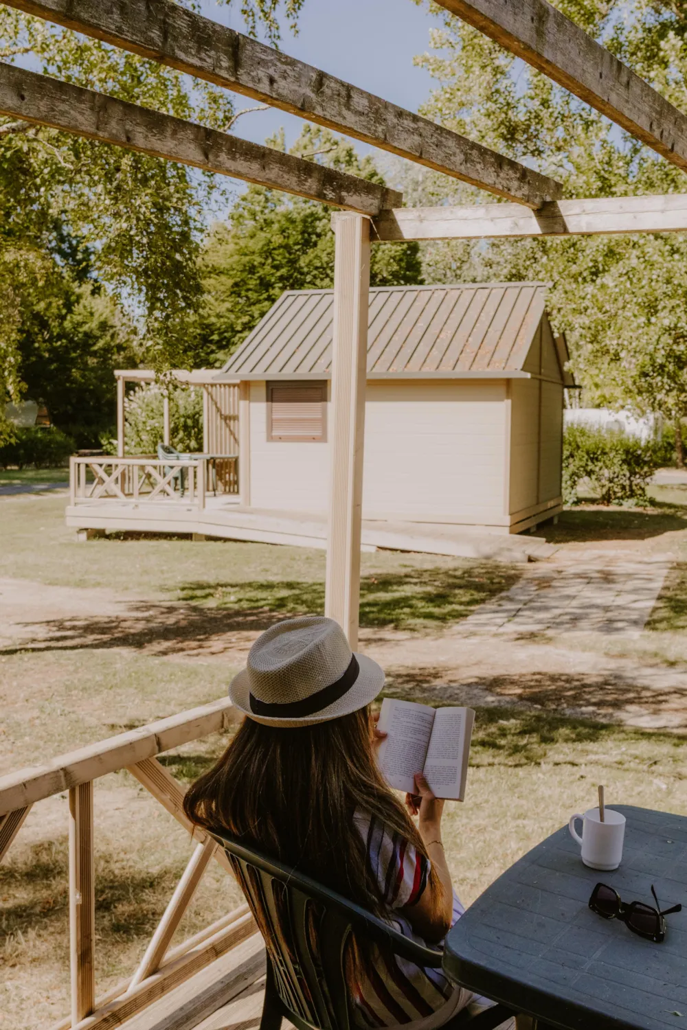 Kühlschrank, Kaffeemaschine, Mikrowelle, 2 Herdplatten, Geschirr). Dieses Chalet verfügt auch über ein Badezimmer mit Toilette und Dusche. Auf der 8m² großen Holzterrasse können Sie den Außenbereich genießen.