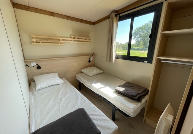 Dieses voll ausgestattete Holzhaus besteht aus 2 Schlafzimmern: eines mit einem Doppelbett (140x190) und eines mit 2 Etagenbetten (90x190). Bettbezüge und Kopfkissen sind vorhanden. Bettlaken und Handtücher müssen mitgebracht werden. Angenehmer Aufenthaltsraum mit ausgestatteter Küche (