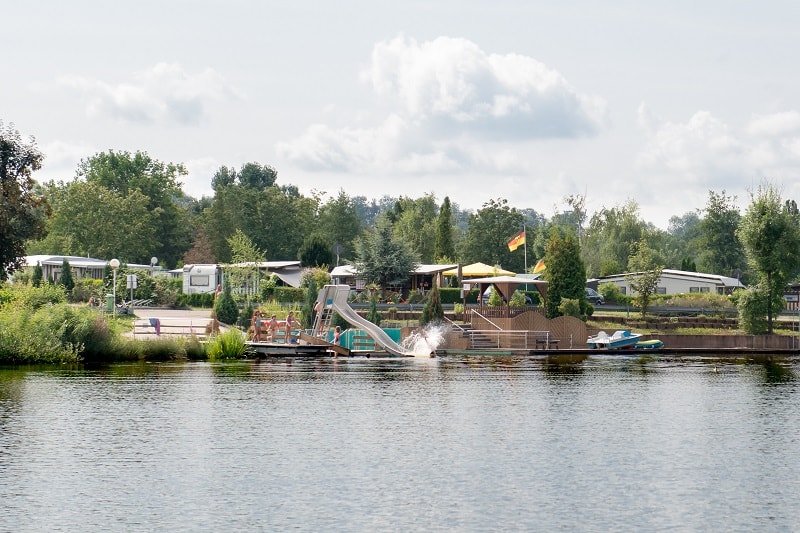 Stellplatz mit Fahrspur und Terrasse in der ersten Reihe am Badesee!