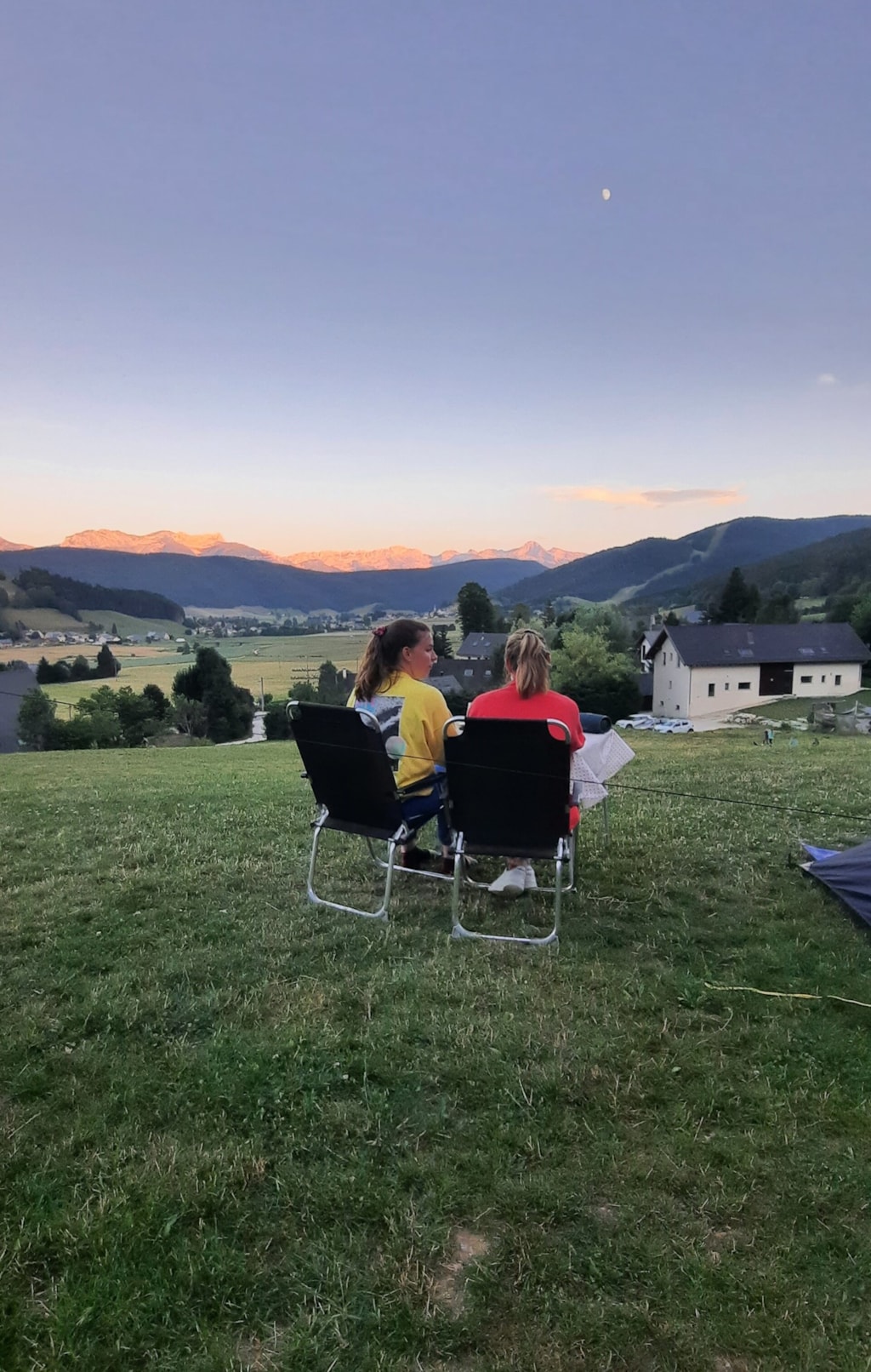 Die tolle Weitsicht in die alpine Umgebung. Das gute Essen im netten Restaurant. Die Geräuschkulisse besteht aus Kuhglocken und Zikaden.