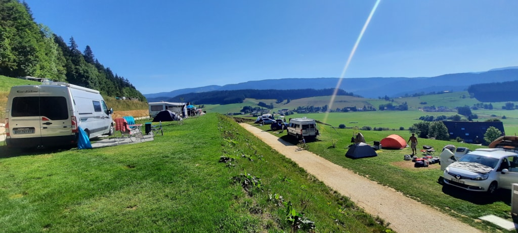 Gemeinsamer Campingplatz für Menschen, die zu Fuß oder mit dem Fahrrad unterwegs sind! Dieser Bereich befindet sich oben auf dem Campingplatz, am Waldrand und bietet eine unglaubliche Aussicht! :) Sanitäranlagen 200 Meter entfernt - kein Stromanschluss. Eine Reservierung ist nicht möglich, wenn Sie ein Fahrzeug haben. In diesem Bereich gibt es keine abgegrenzten Stellplätze. Die Atmosphäre des Ortes lädt dazu ein, zwischen den Zelten Platz zu lassen und einen Moment der Geselligkeit und des Austauschs bei einer Mahlzeit oder einem lokalen Bier zu verbringen! Ab 22 Uhr ist Ruhe geboten, denn es ist vor allem ein Ort der Ruhe, um am nächsten Morgen in Topform aufzubrechen!