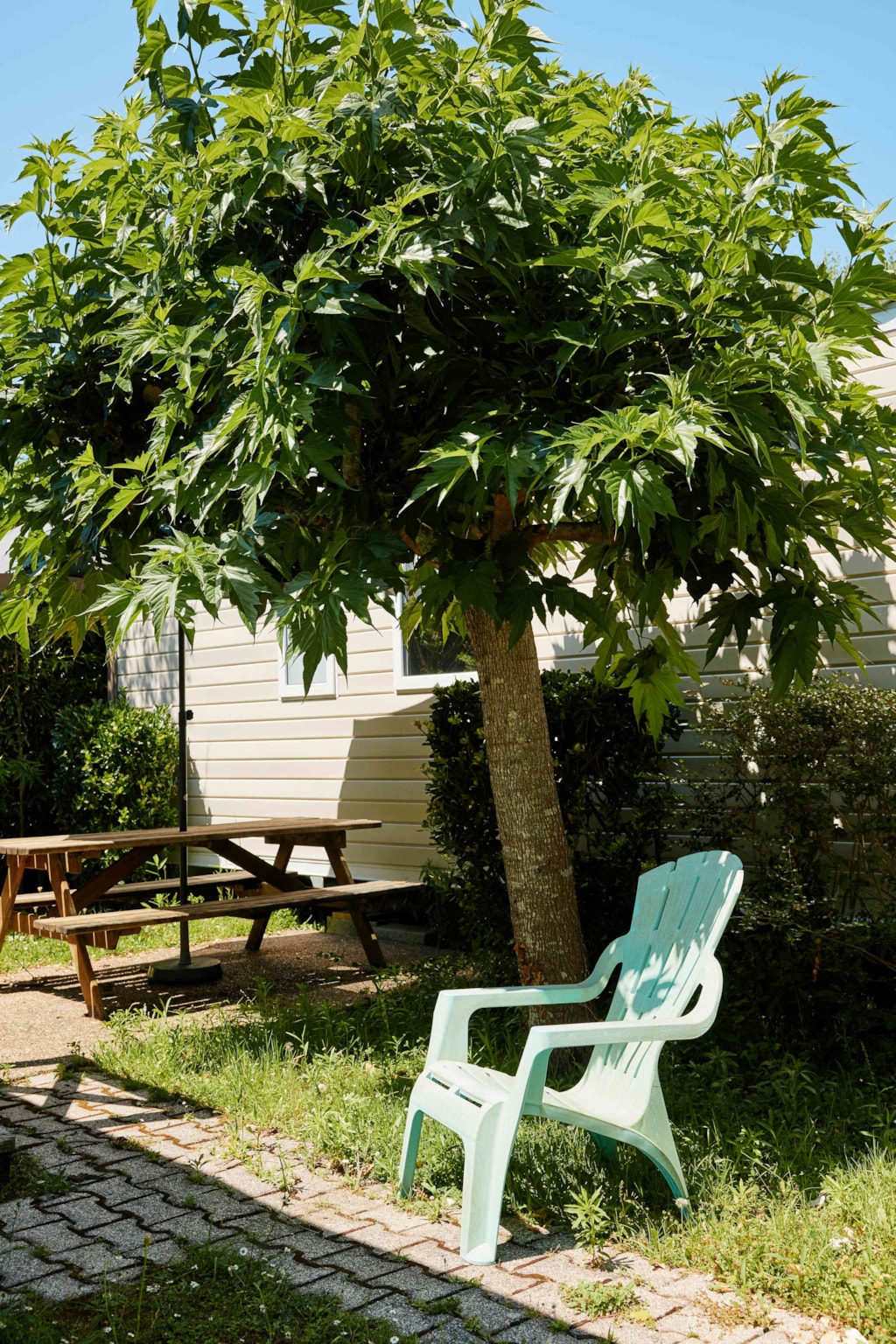 Schlafsofa in Wohnzimmer 120x190 Großer Salon(Messe) mit 1, zu convecteur, TV, Tisch mit Eckbank und 2 Stühlen Amerikanische Küche mit 4 Feuer Gas und 1 Kühlschrank-Gefriertruhe, Rückentragkorb, Geschirr für 4 Personen In allen Stücken(Zimmern) occultants Vorhänge SDB mit Dusche und Waschbecken. Getrenntes WC Jardinet ausschließend mit Scheidungshecken und Bäumen, mit ungezwungenen Gartenmöbeln, von einem Stuhl, einer Chilenischen und einem Sonnenschirm