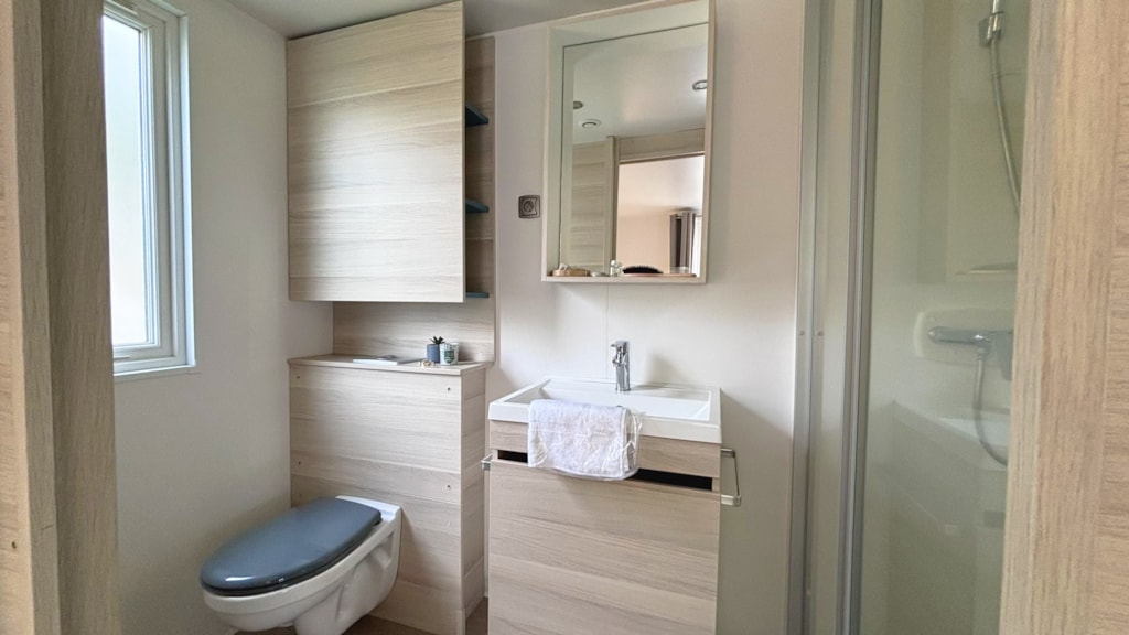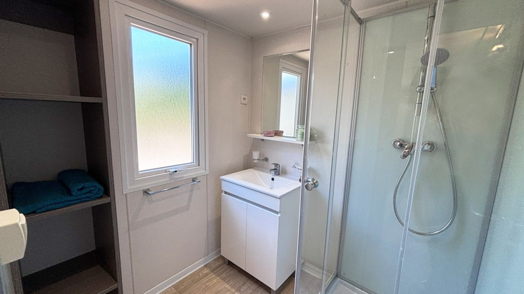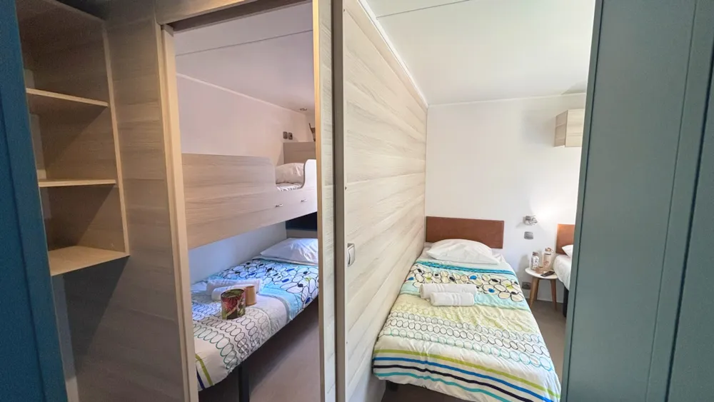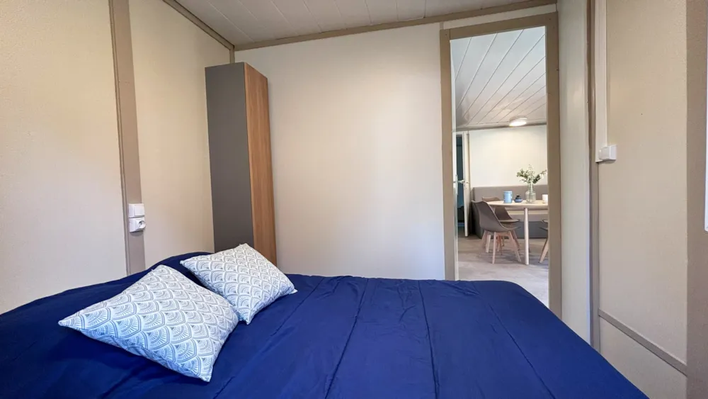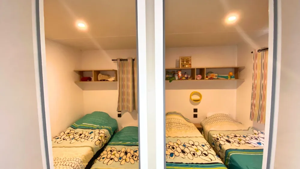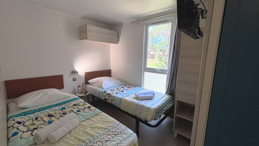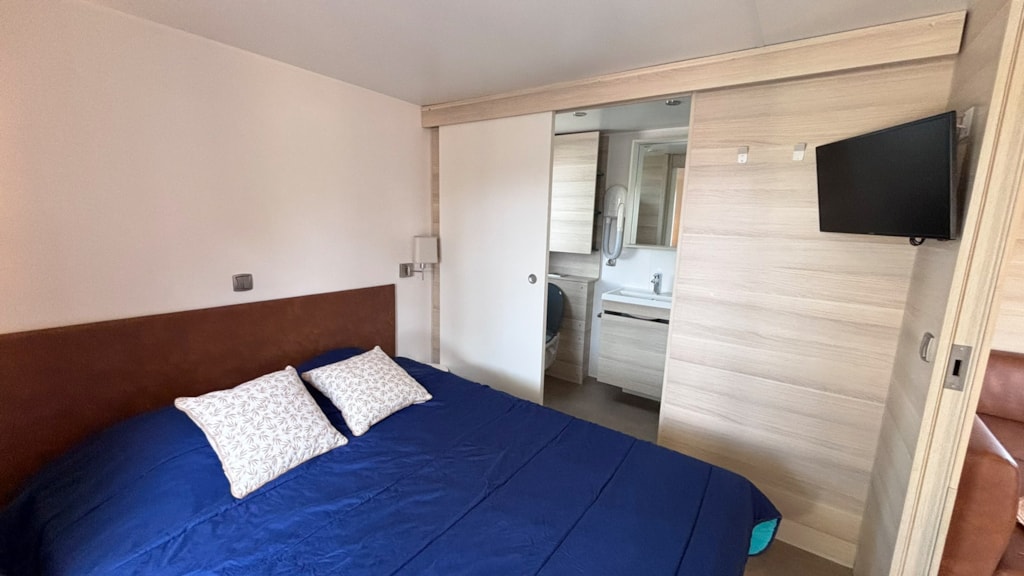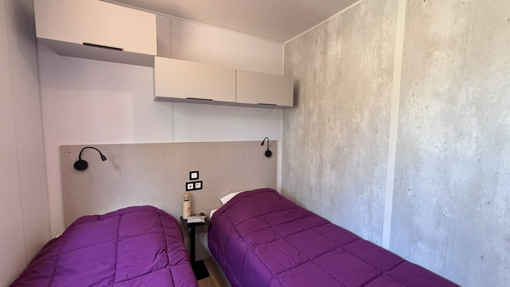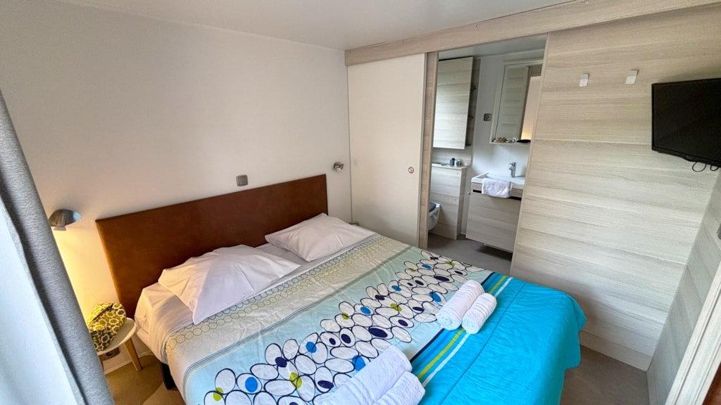 ERSTES MOBIL HOME: Ein einziges Schlafzimmer, Elternsuite mit großem Komfort mit 1 Doppelbett (160cm x 200cm, Bultex-Matratze), vom Wohnzimmer durch einen Vorhang getrennt, eine Sitzbank im Wohnzimmer, ausgestattete Küche, großer Kühlschrank, Mikrowelle, Kapselkaffeemaschine (Dolce Gusto), Geschirrspüler, Essecke, Bettdecken + Kopfkissen, Geschirr, geräumiges Badezimmer mit WC und XXL begehbarer Dusche, Haartrockner und Handtuchtrockner. ZWEITES MOBILHEIM: Ein Schlafzimmer mit 1 Doppelbett (140cm x 190cm), ein Schlafzimmer mit 2 Einzelbetten (70cm x 190cm), Badezimmer, separates WC, Bettdecken und Kopfkissen, ausgestattete Küche, großer Kühlschrank, Mikrowelle, Kapsel-Kaffeemaschine, Essecke, Geschirr.
