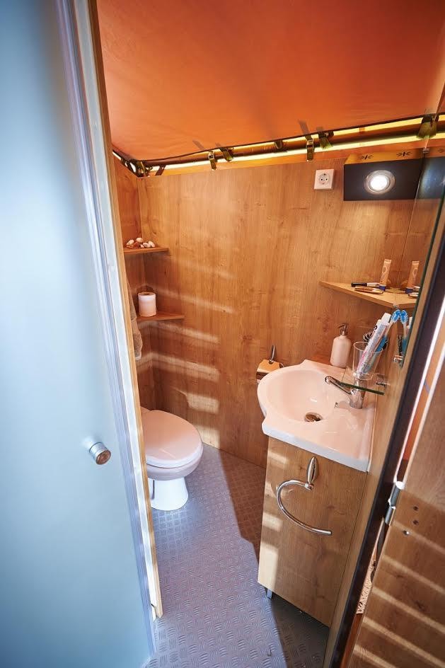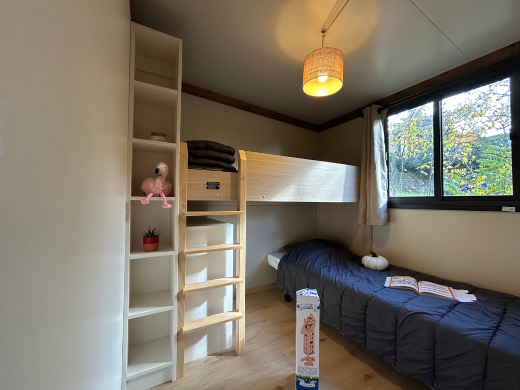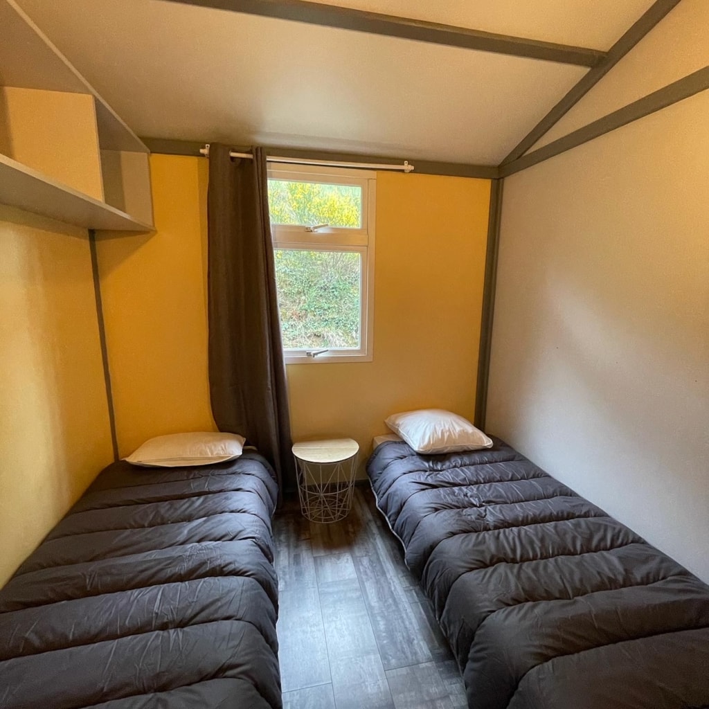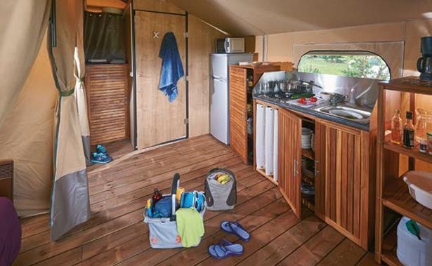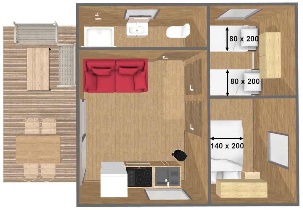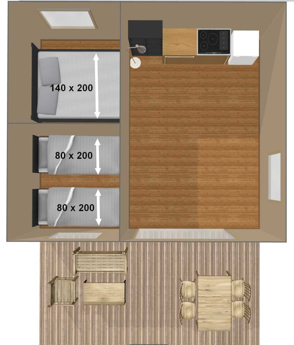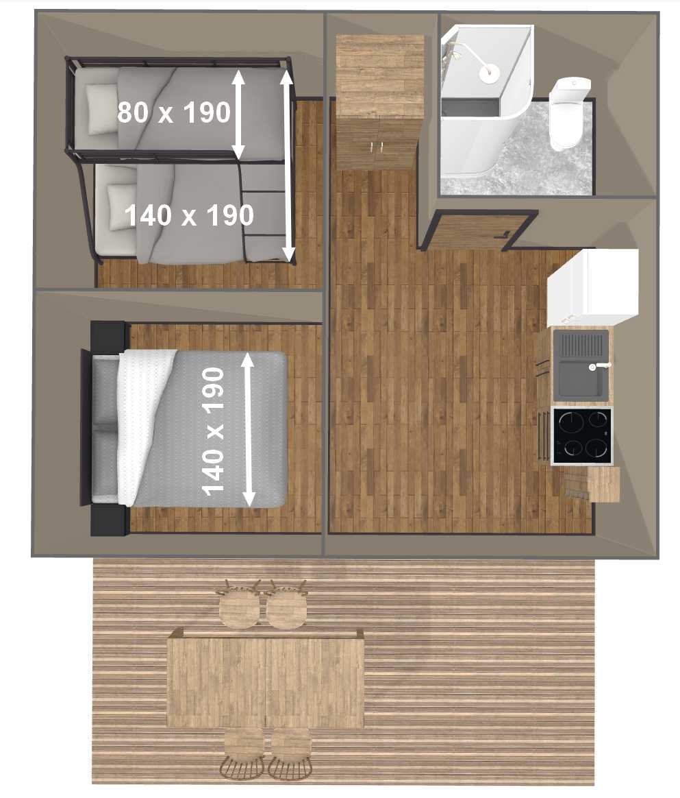 Unusual lodge Victoria 5 places on wooden floor with a large terrace of 18 m2. 2 separate bedrooms: a double bed (140 x 200) + 1 loft bed (3 beds) in the children’s room (1 double bed and 1 single bunk bed), fully equipped kitchen (sink, fridge, microwave, dishes, gas hobs), table and chairs in the living room. Bathroom and toilet in the same room. Lounge, relaxation net and hammock. The lodges are located at the top of the campsite, far from the swimming pool and the activities of the campsite. A collective charcoal barbecue is offered near the lodges. A swing is available for children. No. 62-63-64-65