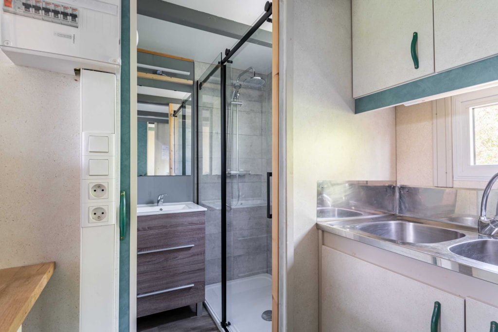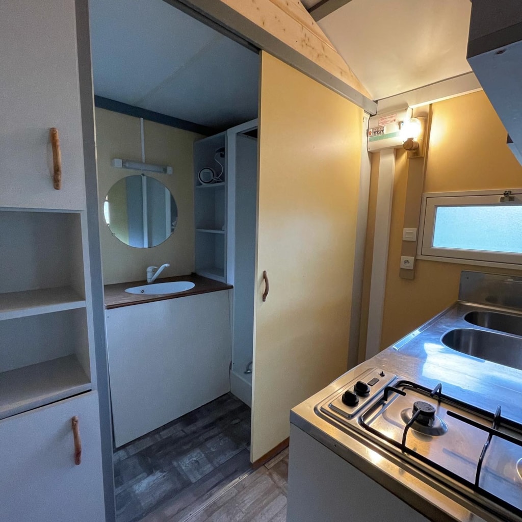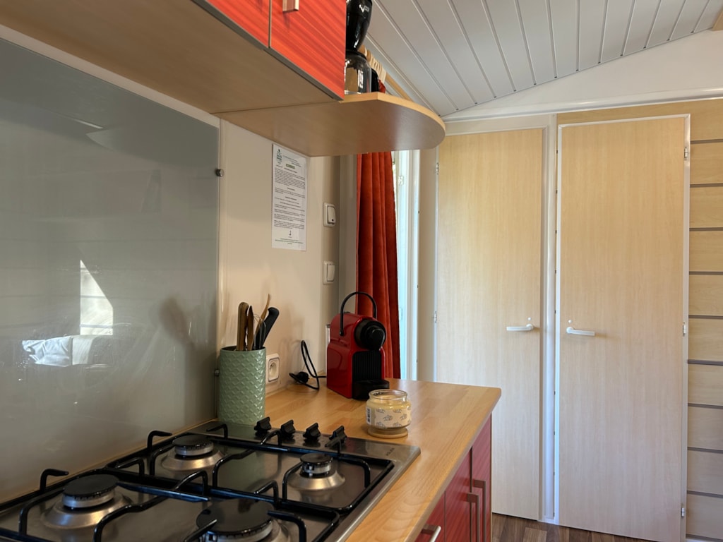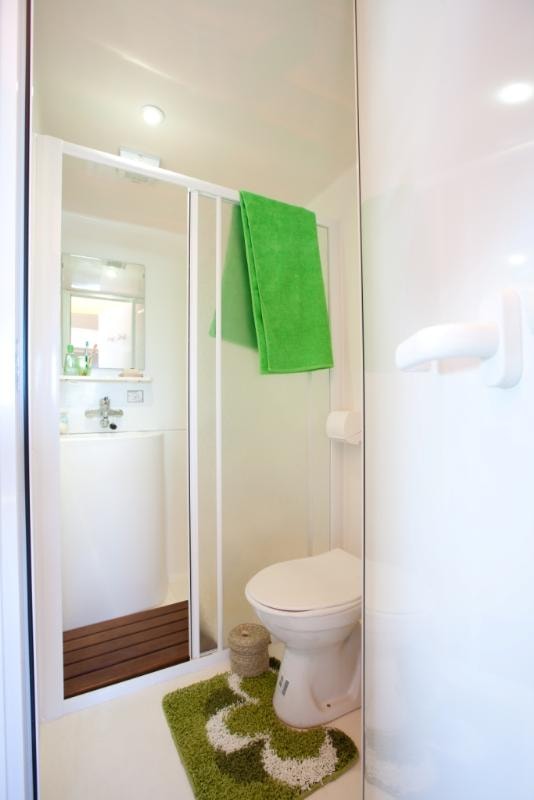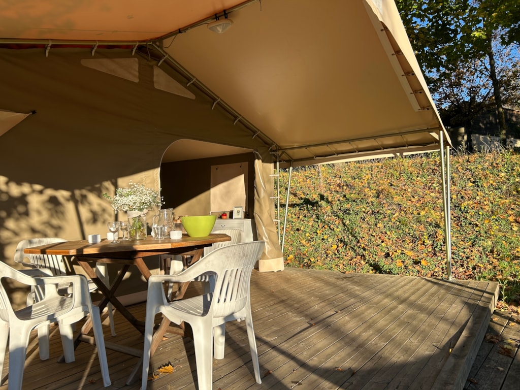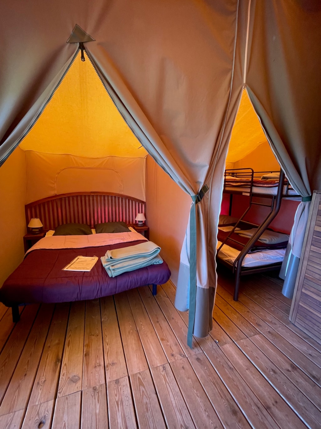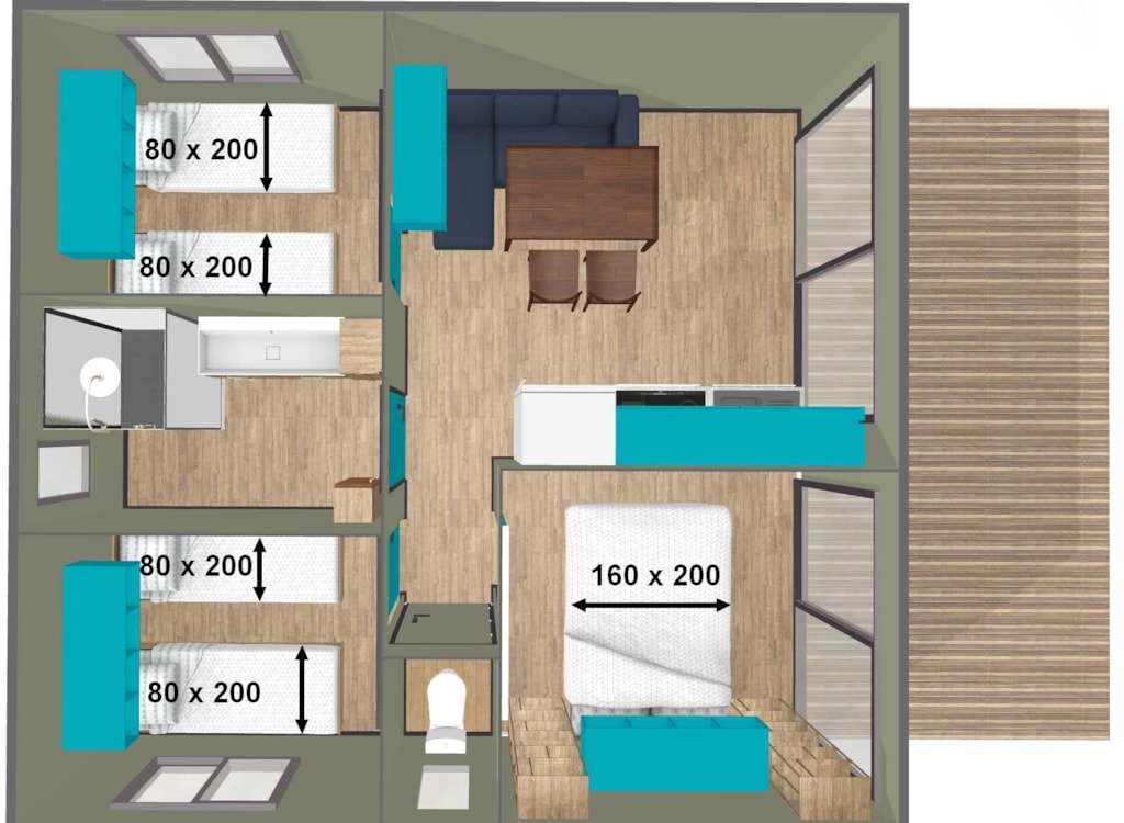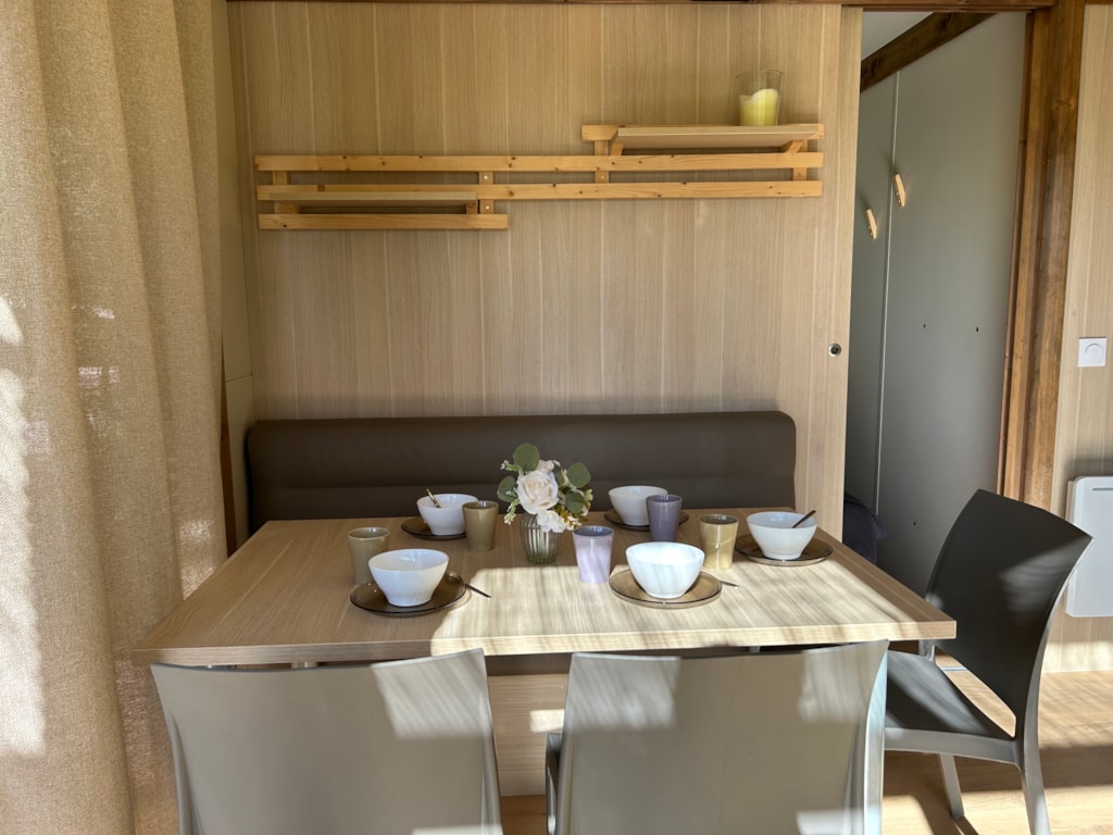 Unusual lodge Victoria 5 places on wooden floor with a large terrace of 18 m2. 2 separate bedrooms: a double bed (140 x 200) + 1 loft bed (3 beds) in the children’s room (1 double bed and 1 single bunk bed), fully equipped kitchen (sink, fridge, microwave, dishes, gas hobs), table and chairs in the living room. Bathroom and toilet in the same room. Lounge, relaxation net and hammock. The lodges are located at the top of the campsite, far from the swimming pool and the activities of the campsite. A collective charcoal barbecue is offered near the lodges. A swing is available for children. No. 62-63-64-65