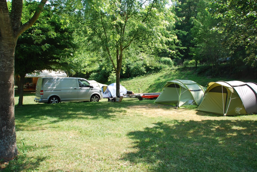 Sunny pitch or shadow in front of the river near the playground and the swimmingpool. Accessible tent, small caravan and Van only. No camping-car